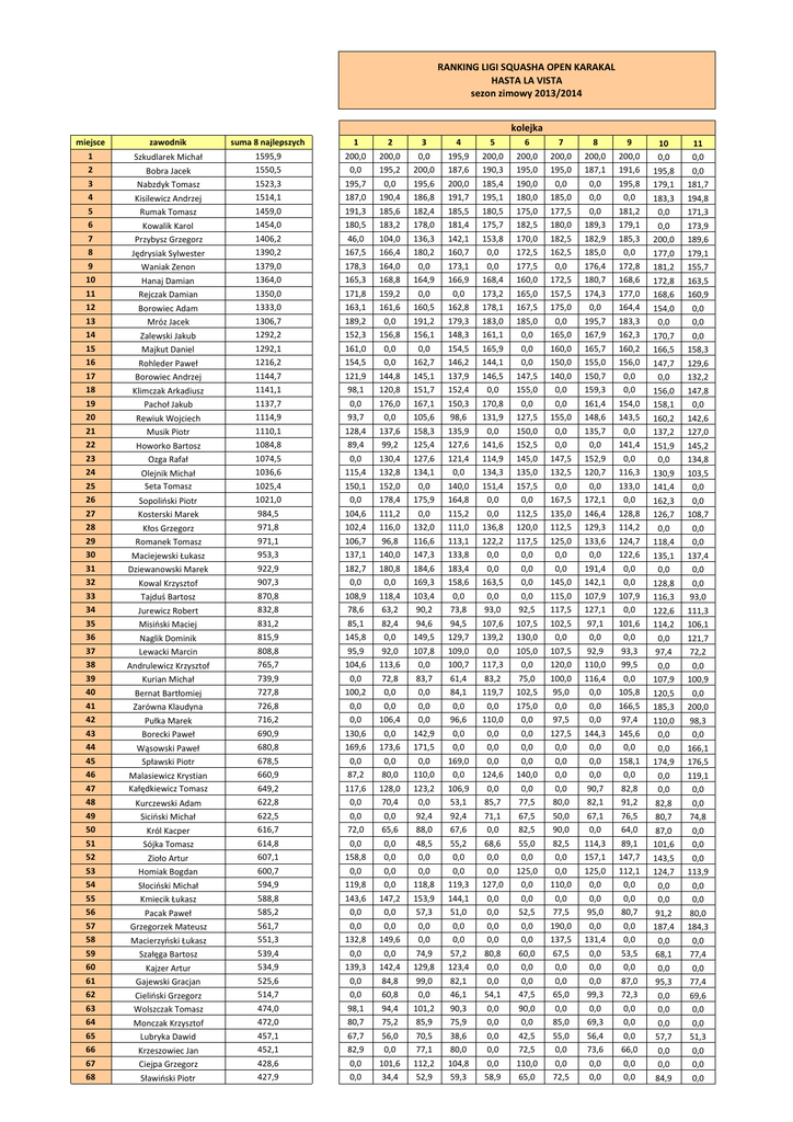 RANKING LIGI SQUASHA OPEN KARAKAL HASTA LA VISTA sezon zimowy 2013/2014 kolejka miejsce 1 2 3 4 5 6 7 8 9 10 11 12 13 14 15 16 17 18 19 20 21 22 23 24 25 26 27 28 29 30 31 32 33 34 35 36 37 38 39 40 41 42 43 44 45 46 47 48 49 50 51 52 53 54 55 56 57 58 59 60 61 62 63 64 65 66 67 68 zawodnik Szkudlarek Michał Bobra Jacek Nabzdyk Tomasz Kisilewicz Andrzej Rumak Tomasz Kowalik Karol Przybysz Grzegorz Jędrysiak Sylwester Waniak Zenon Hanaj Damian Rejczak Damian Borowiec Adam Mróz Jacek Zalewski Jakub Majkut Daniel Rohleder Paweł Borowiec Andrzej Klimczak Arkadiusz Pachoł Jakub Rewiuk Wojciech Musik Piotr Howorko Bartosz Ozga Rafał Olejnik Michał Seta Tomasz Sopoliński Piotr Kosterski Marek Kłos Grzegorz Romanek Tomasz Maciejewski Łukasz Dziewanowski Marek Kowal Krzysztof Tajduś Bartosz Jurewicz Robert Misiński Maciej Naglik Dominik Lewacki Marcin Andrulewicz Krzysztof Kurian Michał Bernat Bartłomiej Zarówna Klaudyna Pułka Marek Borecki Paweł Wąsowski Paweł Spławski Piotr Malasiewicz Krystian Kałędkiewicz Tomasz Kurczewski Adam Siciński Michał Król Kacper Sójka Tomasz Zioło Artur Homiak Bogdan Słociński Michał Kmiecik Łukasz Pacak Paweł Grzegorzek Mateusz Macierzyński Łukasz Szałęga Bartosz Kajzer Artur Gajewski Gracjan Cieliński Grzegorz Wolszczak Tomasz Monczak Krzysztof Lubryka Dawid Krzeszowiec Jan Ciejpa Grzegorz Sławiński Piotr suma 8 najlepszych 1595,9 1550,5 1523,3 1514,1 1459,0 1454,0 1406,2 1390,2 1379,0 1364,0 1350,0 1333,0 1306,7 1292,2 1292,1 1216,2 1144,7 1141,1 1137,7 1114,9 1110,1 1084,8 1074,5 1036,6 1025,4 1021,0 984,5 971,8 971,1 953,3 922,9 907,3 870,8 832,8 831,2 815,9 808,8 765,7 739,9 727,8 726,8 716,2 690,9 680,8 678,5 660,9 649,2 622,8 622,5 616,7 614,8 607,1 600,7 594,9 588,8 585,2 561,7 551,3 539,4 534,9 525,6 514,7 474,0 472,0 457,1 452,1 428,6 427,9 1 200,0 0,0 195,7 187,0 191,3 180,5 46,0 167,5 178,3 165,3 171,8 163,1 189,2 152,3 161,0 154,5 121,9 98,1 0,0 93,7 128,4 89,4 0,0 115,4 150,1 0,0 104,6 102,4 106,7 137,1 182,7 0,0 108,9 78,6 85,1 145,8 95,9 104,6 0,0 100,2 0,0 0,0 130,6 169,6 0,0 87,2 117,6 0,0 0,0 72,0 0,0 158,8 0,0 119,8 143,6 0,0 0,0 132,8 0,0 139,3 0,0 0,0 98,1 80,7 67,7 82,9 0,0 0,0 2 200,0 195,2 0,0 190,4 185,6 183,2 104,0 166,4 164,0 168,8 159,2 161,6 0,0 156,8 0,0 0,0 144,8 120,8 176,0 0,0 137,6 99,2 130,4 132,8 152,0 178,4 111,2 116,0 96,8 140,0 180,8 0,0 118,4 63,2 82,4 0,0 92,0 113,6 72,8 0,0 0,0 106,4 0,0 173,6 0,0 80,0 128,0 70,4 0,0 65,6 0,0 0,0 0,0 0,0 147,2 0,0 0,0 149,6 0,0 142,4 84,8 60,8 94,4 75,2 56,0 0,0 101,6 34,4 3 0,0 200,0 195,6 186,8 182,4 178,0 136,3 180,2 0,0 164,9 0,0 160,5 191,2 156,1 0,0 162,7 145,1 151,7 167,1 105,6 158,3 125,4 127,6 134,1 0,0 175,9 0,0 132,0 116,6 147,3 184,6 169,3 103,4 90,2 94,6 149,5 107,8 0,0 83,7 0,0 0,0 0,0 142,9 171,5 0,0 110,0 123,2 0,0 92,4 88,0 48,5 0,0 0,0 118,8 153,9 57,3 0,0 0,0 74,9 129,8 99,0 0,0 101,2 85,9 70,5 77,1 112,2 52,9 4 195,9 187,6 200,0 191,7 185,5 181,4 142,1 160,7 173,1 166,9 0,0 162,8 179,3 148,3 154,5 146,2 137,9 152,4 150,3 98,6 135,9 127,6 121,4 0,0 140,0 164,8 115,2 111,0 113,1 133,8 183,4 158,6 0,0 73,8 94,5 129,7 109,0 100,7 61,4 84,1 0,0 96,6 0,0 0,0 169,0 0,0 106,9 53,1 92,4 67,6 55,2 0,0 0,0 119,3 144,1 51,0 0,0 0,0 57,2 123,4 82,1 46,1 90,3 75,9 38,6 80,0 104,8 59,3 5 200,0 190,3 185,4 195,1 180,5 175,7 153,8 0,0 0,0 168,4 173,2 178,1 183,0 161,1 165,9 144,1 146,5 0,0 170,8 131,9 0,0 141,6 114,9 134,3 151,4 0,0 0,0 136,8 122,2 0,0 0,0 163,5 0,0 93,0 107,6 139,2 0,0 117,3 83,2 119,7 0,0 110,0 0,0 0,0 0,0 124,6 0,0 85,7 71,1 0,0 68,6 0,0 0,0 127,0 0,0 0,0 0,0 0,0 80,8 0,0 0,0 54,1 0,0 0,0 0,0 0,0 0,0 58,9 6 200,0 195,0 190,0 180,0 175,0 182,5 170,0 172,5 177,5 160,0 165,0 167,5 185,0 0,0 0,0 0,0 147,5 155,0 0,0 127,5 150,0 152,5 145,0 135,0 157,5 0,0 112,5 120,0 117,5 0,0 0,0 0,0 0,0 92,5 107,5 130,0 105,0 0,0 75,0 102,5 175,0 0,0 0,0 0,0 0,0 140,0 0,0 77,5 67,5 82,5 55,0 0,0 125,0 0,0 0,0 52,5 0,0 0,0 60,0 0,0 0,0 47,5 90,0 0,0 42,5 72,5 110,0 65,0 7 200,0 195,0 0,0 185,0 177,5 180,0 182,5 162,5 0,0 172,5 157,5 175,0 0,0 165,0 160,0 150,0 140,0 0,0 0,0 155,0 0,0 0,0 147,5 132,5 0,0 167,5 135,0 112,5 125,0 0,0 0,0 145,0 115,0 117,5 102,5 0,0 107,5 120,0 100,0 95,0 0,0 97,5 127,5 0,0 0,0 0,0 0,0 80,0 50,0 90,0 82,5 0,0 0,0 110,0 0,0 77,5 190,0 137,5 67,5 0,0 0,0 65,0 0,0 85,0 55,0 0,0 0,0 72,5 8 200,0 187,1 0,0 0,0 0,0 189,3 182,9 185,0 176,4 180,7 174,3 0,0 195,7 167,9 165,7 155,0 150,7 159,3 161,4 148,6 135,7 0,0 152,9 120,7 0,0 172,1 146,4 129,3 133,6 0,0 191,4 142,1 107,9 127,1 97,1 0,0 92,9 110,0 116,4 0,0 0,0 0,0 144,3 0,0 0,0 0,0 90,7 82,1 67,1 0,0 114,3 157,1 125,0 0,0 0,0 95,0 0,0 131,4 0,0 0,0 0,0 99,3 0,0 69,3 56,4 73,6 0,0 0,0 9 200,0 191,6 195,8 0,0 181,2 179,1 185,3 0,0 172,8 168,6 177,0 164,4 183,3 162,3 160,2 156,0 0,0 0,0 154,0 143,5 0,0 141,4 0,0 116,3 133,0 0,0 128,8 114,2 124,7 122,6 0,0 0,0 107,9 0,0 101,6 0,0 93,3 99,5 0,0 105,8 166,5 97,4 145,6 0,0 158,1 0,0 82,8 91,2 76,5 64,0 89,1 147,7 112,1 0,0 0,0 80,7 0,0 0,0 53,5 0,0 87,0 72,3 0,0 0,0 0,0 66,0 0,0 0,0 10 0,0 195,8 179,1 183,3 0,0 0,0 200,0 177,0 181,2 172,8 168,6 154,0 0,0 170,7 166,5 147,7 0,0 156,0 158,1 160,2 137,2 151,9 0,0 130,9 141,4 162,3 126,7 0,0 118,4 135,1 0,0 128,8 116,3 122,6 114,2 0,0 97,4 0,0 107,9 120,5 185,3 110,0 0,0 0,0 174,9 0,0 0,0 82,8 80,7 87,0 101,6 143,5 124,7 0,0 0,0 91,2 187,4 0,0 68,1 0,0 95,3 0,0 0,0 0,0 57,7 0,0 0,0 84,9 11 0,0 0,0 181,7 194,8 171,3 173,9 189,6 179,1 155,7 163,5 160,9 0,0 0,0 0,0 158,3 129,6 132,2 147,8 0,0 142,6 127,0 145,2 134,8 103,5 0,0 0,0 108,7 0,0 0,0 137,4 0,0 0,0 93,0 111,3 106,1 121,7 72,2 0,0 100,9 0,0 200,0 98,3 0,0 166,1 176,5 119,1 0,0 0,0 74,8 0,0 0,0 0,0 113,9 0,0 0,0 80,0 184,3 0,0 77,4 0,0 77,4 69,6 0,0 0,0 51,3 0,0 0,0 0,0 RANKING LIGI SQUASHA OPEN KARAKAL HASTA LA VISTA sezon zimowy 2013/2014 kolejka miejsce 69 70 71 72 73 74 75 76 77 78 79 80 81 82 83 84 85 86 87 88 89 90 91 92 93 94 95 96 97 98 99 100 101 102 103 104 105 106 107 108 109 110 111 112 113 114 115 116 117 118 119 120 12