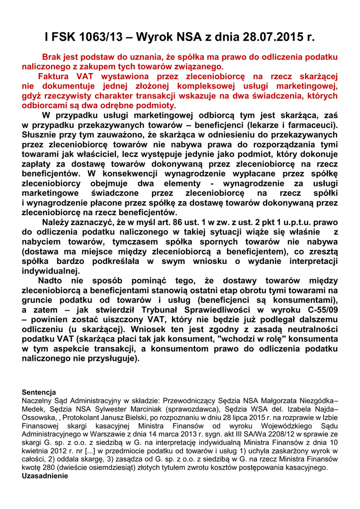 I FSK 1063/13 – Wyrok NSA z dnia 28.07.2015 r. Brak jest podstaw do uznania, że spółka ma prawo do odliczenia podatku naliczonego z zakupem tych towarów związanego. Faktura VAT wystawiona przez zleceniobiorcę na rzecz skarżącej nie dokumentuje jednej złożonej kompleksowej usługi marketingowej, gdyż rzeczywisty charakter transakcji wskazuje na dwa świadczenia, których odbiorcami są dwa odrębne podmioty. W przypadku usługi marketingowej odbiorcą tym jest skarżąca, zaś w przypadku przekazywanych towarów – beneficjenci (lekarze i farmaceuci). Słusznie przy tym zauważono, że skarżąca w odniesieniu do przekazywanych przez zleceniobiorcę towarów nie nabywa prawa do rozporządzania tymi towarami jak właściciel, lecz występuje jedynie jako podmiot, który dokonuje zapłaty za dostawę towarów dokonywaną przez zleceniobiorcę na rzecz beneficjentów. W konsekwencji wynagrodzenie wypłacane przez spółkę zleceniobiorcy obejmuje dwa elementy - wynagrodzenie za usługi marketingowe świadczone przez zleceniobiorcę na rzecz spółki i wynagrodzenie płacone przez spółkę za dostawę towarów dokonywaną przez zleceniobiorcę na rzecz beneficjentów. Należy zaznaczyć, że w myśl art. 86 ust. 1 w zw. z ust. 2 pkt 1 u.p.t.u. prawo do odliczenia podatku naliczonego w takiej sytuacji wiąże się właśnie z nabyciem towarów, tymczasem spółka spornych towarów nie nabywa (dostawa ma miejsce między zleceniobiorcą a beneficjentem), co zresztą spółka bardzo podkreślała w swym wniosku o wydanie interpretacji indywidualnej. Nadto nie sposób pominąć tego, że dostawy towarów między zleceniobiorcą a beneficjentami stanowią ostatni etap obrotu tymi towarami na gruncie podatku od towarów i usług (beneficjenci są konsumentami), a zatem – jak stwierdził Trybunał Sprawiedliwości w wyroku C-55/09 – powinien zostać uiszczony VAT, który nie będzie już podlegał dalszemu odliczeniu (u skarżącej). Wniosek ten jest zgodny z zasadą neutralności podatku VAT (skarżąca płaci tak jak konsument, "wchodzi w rolę" konsumenta w tym aspekcie transakcji, a konsumentom prawo do odliczenia podatku naliczonego nie przysługuje). Sentencja Naczelny Sąd Administracyjny w składzie: Przewodniczący Sędzia NSA Małgorzata Niezgódka– Medek, Sędzia NSA Sylwester Marciniak (sprawozdawca), Sędzia WSA del. Izabela Najda– Ossowska, , Protokolant Janusz Bielski, po rozpoznaniu w dniu 28 lipca 2015 r. na rozprawie w Izbie Finansowej skargi kasacyjnej Ministra Finansów od wyroku Wojewódzkiego Sądu Administracyjnego w Warszawie z dnia 14 marca 2013 r. sygn. akt III SA/Wa 2208/12 w sprawie ze skargi G. sp. z o.o. z siedzibą w G. na interpretację indywidualną Ministra Finansów z dnia 10 kwietnia 2012 r. nr [...] w przedmiocie podatku od towarów i usług 1) uchyla zaskarżony wyrok w całości, 2) oddala skargę, 3) zasądza od G. sp. z o.o. z siedzibą w G. na rzecz Ministra Finansów kwotę 280 (dwieście osiemdziesiąt) złotych tytułem zwrotu kosztów postępowania kasacyjnego. Uzasadnienie 1. Wyrok sądu pierwszej instancji (k. 57 i 59-72 akt) 1.1. Zaskarżonym wyrokiem z dnia 14 marca 2013 r., sygn. akt III SA/Wa 2208/12, Wojewódzki Sąd Administracyjny w Warszawie (dalej: sąd pierwszej instancji), po rozpoznaniu skargi G. sp. z o.o. w G. (dalej: spółka lub skarżąca) na interpretację indywidualną Ministra Finansów (dalej: organ podatkowy) z dnia 10 kwietnia 2012 r. w przedmiocie podatku od towarów i usług, uchylił zaskarżoną interpretację indywidualną, stwierdził, że w nie może być ona wykonana i zasądził na rzecz spółki zwrot kosztów postępowania sądowego. 1.2. Z uzasadnienia powyższego wyroku wynika, że w swym wniosku o wydanie interpretacji indywidualnej spółka wskazała, iż prowadzi działalność gospodarczą w zakresie produkcji i sprzedaży produktów leczniczych. W celu wsparcia sprzedaży skarżąca zawarła umowę ze spółką (dalej: zleceniobiorca), która dokonuje bezpośredniej i pośredniej promocji produktów leczniczych, a także świadczy na rzecz skarżącej szereg innych usług (np. z zakresu administracji, dystrybucji w imieniu skarżącej bezpłatnych próbek medycznych, wspierania negocjacji o charakterze biznesowym i czynności sprzedażowych skarżącej, poszukiwania nowych możliwości biznesowych i podtrzymywanie istniejących, public relations). Wymieniając szczegółowo działania składające się na prowadzoną przez zleceniobiorcę promocję produktów spółki, skarżąca wskazała m.in. na dokonywane w ramach tych działań nieodpłatne wydania towarów, przede wszystkim na rzecz lekarzy i farmaceutów, zgodnie z ustawą z dnia 6 września 2001 r. Prawo farmaceutyczne. Towary do tego celu (m.in. materiały reklamowe i promocyjne, nagrody, upominki i gadżety, a także artykuły spożywcze serwowane podczas spotkań promocyjnych, seminariów itp.) są uprzednio nabywane przez zleceniobiorcę. Spółka opisała zasady, według których ustalane jest wynagrodzenie zleceniobiorcy – wynika z nich m.in., że marża nie jest doliczana w przypadku gadżetów i drobnych upominków oraz zakupu nagród w ramach konkursów. Na gruncie opisanego przez siebie stanu faktycznego spółka zadała pytania: 1) Czy w związku z nieodpłatnymi wydaniami towarów przez zleceniobiorcę, realizowanymi w ramach świadczenia kompleksowej usługi marketingowej, skarżąca zobowiązana jest do opodatkowania podatkiem od towarów i usług wydań tych towarów, których koszt zakupu wliczany jest do wynagrodzenia z tytułu świadczenia kompleksowej usługi marketingowej, na podstawie obowiązującego od 1 kwietnia 2011 r. brzmienia art. 7 ust. 2 ustawy z dnia 11 marca 2004 r. o podatku od towarów i usług (Dz.U. z 2011 r., nr 177, poz. 1054 ze zm., dalej: u.p.t.u.)?, 2) Czy skarżąca ma prawo do obniżenia podatku należnego o kwotę podatku naliczonego, wynikającego z faktur wystawionych przez zleceniobio