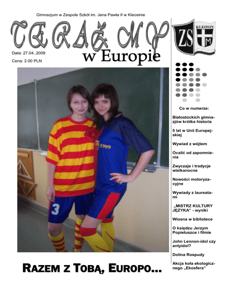 Gimnazjum w Zespole Szkół im. Jana Pawła II w Kleosinie Data: 27.04..2009 Cena: 2.00 PLN Co w numerze: Białostockich gimnazjów krótka historia 5 lat w Unii Europejskiej Wywiad z wójtem Ocalić od zapomnienia Zwyczaje i tradycje wielkanocne Nowości motoryzacyjne Wywiady z laureatami „MISTRZ KULTURY JĘZYKA” - wyniki Wiosna w bibliotece O księdzu Jerzym Popiełuszce i filmie John Lennon-idol czy antyidol? Dolina Rospudy RAZEM Z TOBĄ, EUROPO… Akcja koła ekologicznego „Ekosfera” 2 STOPKA REDAKCYJNA Słowo wstępne… Stopka redakcyjna My, zespół redakcyjny, z Woli Bożej redaktorzy gazety „Teraz my” oznajmiamy nowinę: to przedostatni numer gazety w tym roku. Jednak nie martwcie się, ludzie i piękno przemijają, lecz kupony są wieczne. „ Zło najstraszliwsze, śmierć, nie dotyka nas wcale, bo póki my jesteśmy, nie ma śmierci, a kiedy jest śmierć, nie ma nas.” Epikur Redaktor naczelny: Mateusz Cholewski Zastępca redaktora naczelnego: Karolina Bogusz Zespół redakcyjny: Anna Kasprzyńska Aleksandra Niewińska Robert Osiecki Bartosz Pomichter Maciej Rogało Marta Szerakowska Agnieszka Toczyńska Opracowanie graficzne: Mateusz Cholewski Maciej Rogało Korekta i opieka nad redakcją: Anna Piłaszewicz Daniel Karczmarzyk „English Page”: Urszula Szczuka Na okładce: Joanna Leszczyńska i Agnieszka Abramowicz, uczennice klasy III D, w pierwszym dniu wiosny. Z TYM KUPONEM MOŻESZ ZGŁOSIĆ DODAT- Z TYM KUPONEM MOŻESZ ZGŁOSIĆ DODATKOWE NIEPRZYGOTOWANIE Z DOWOLNEGO KOWE NIEPRZYGOTOWANIE Z DOWOLNEGO PRZEDMIOTU PRZEDMIOTU Przypominamy, że zasady naszego Szkolnego Systemu Oceniania pozwalają na zgłoszenie tylko określonej liczby nieprzygotowań- od 1 do 3. Co ma zrobić ambitny uczeń, któremu przypadkiem zawieruszy się gdzieś zeszyt z pracą domową? Mamy na to radę – powinien kupić naszą gazetkę, a w niej znaleźć i wyciąć kupon, który pozwoli zgłosić DODATKOWE NIEPRZYGOTOWANIE. Przypominamy, że zasady naszego Szkolnego Systemu Oceniania pozwalają na zgłoszenie tylko określonej liczby nieprzygotowań - od 1 do 3. Co ma zrobić ambitny uczeń, któremu przypadkiem zawieruszy się gdzieś zeszyt z pracą domową? Mamy na to radę – powinien kupić naszą gazetkę, a w niej znaleźć i wyciąć kupon, który pozwoli zgłosić DODATKOWE NIEPRZYGOTOWANIE. UWAGA! Kupon jest ważny do 31 maja 2009 r. Można go użyć raz. Usprawiedliwiając nieprzygotowanie, oddajemy kupon nauczycielowi. UWAGA! Kupon jest ważny do 31 maja 2009 r. Można go użyć raz. Usprawiedliwiając nieprzygotowanie, oddajemy kupon nauczycielowi. 3 SPIS TREŚCI BIAŁOSTOCKICH GIMNAZJÓW KRÓTKA HISTORIA Pierwsze w Białymstoku gimnazjum zostało powołane przez władze pruskie we wrześniu 1802 roku. Jeden z profesorów założył przy szkole bibliotekę z czytelnią. Białostoccy profesorowie i uczniowie zdali znakomicie egzamin patriotyzmu na początku XIX stulecia. Młodzi zaciągali się ochotniczo do szeregów wojskowych. W 1820 r. pracę podjęła pierwsza prywatna pensja żeńska. Dobrzy nauczyciele nadal skutecznie umacniali sławę białostockiego gimnazjum, a uczniowie też nie chcieli być gorsi. Polska społeczność w dużej mierze dzięki tej szkole nie utraciła nadziei na odzyskanie wolności. Promyk polskości, zasady braterstwa, wolę pracy umysłowej podtrzymywało „Towarzystwo Zgodnych Braci‖. Dzięki tym gimnazjalistom i na nasze ziemie sięgały wpływy wileńskich Filaretów i Filomatów. Tak było aż do brutalnej ingerencji władz carskich. Białystok bowiem pozostawał w Cesarstwie Rosyjskim, oddzielony granicą od Warszawy. W 1832 r. przestał istnieć Uniwersytet Wileński, a szkoły białostockie włączono do Białoruskiego Okręgu Naukowego. Absolwenci białostockiego gimnazjum wzięli udział w powstaniu listopadowym. Po klęsce powstania w szkołach postępowała rusyfikacja oraz świadome łamanie charakterów uczniów przez zaborcę. Przedstawiciele białostockiego gimnazjum po raz kolejny obronili honor społeczności uczniowskiej, biorąc udział w manifestacjach patriotycznych 1863 r., poprzedzających wybuch powstania styczniowego. Niektórzy z nich trafili do oddziałów powstańczych. Młodzi patrioci zapłacili za swój czyn karami, wydaleniem ze szkoły, a cały system oświatowy poddany został jeszcze ostrzejszej rusyfikacji. Władze za najbardziej odpowiedni typ placówki uznały szkółki parafialno – cerkiewne. Wizytatorzy zwracali uwagę na opanowanie przez uczniów listy członków rodziny carskiej, bezwzględne posłuszeństwo, nieużywanie nawet podczas przerw języka polskiego. W roku 1897 w Białymstoku nie umiało czytać prawie 48 % mieszkańców. Do publicznych szkół elementarnych uczęszczał co szósty chłopiec w wieku od 7 do 14 lat i co dziesiąta dziewczyna. Poza wszelkimi placówkami oświatowymi pozostawało w mieście ponad 8 tys. (Ciąg dalszy na stronie 12) SPIS TREŚCI: Unia Europejska Wywiad z wójtem s. 4-6 s. 6 Ocalić od zapomnienia s. 7-8 Zwyczaje i tradycje wielkanocne s.9-12 Białostockich gimnazjów krótka historia (dokończenie) s. 12 Nowości motoryzacyjne-Genewa 2009 s.13 Wywiady z laureatami s. 14-15 Wojewódzki konkurs plastyczny i multimedialny s. 15 Ogłoszenia o konkursach s. 16-18, 21, 30 O ks. Jerzym Popiełuszce i filmie s. 19-20 John Lennon-idol czy antyidol? s. 22-26 Dolina Rospudy s. 27-29 Obuwik pospolity s. 30 4 EUROPEISTYKA Unijne ABC… Od 2004 roku Polska należy do Unii Europejskiej. Możemy swobodnie podróżować, poznawać dorobek innych krajów, urozmaicić swoje życie np. poznając nowe smaki, doskonalić umiejętności m.in. „szlifować języki obce‖, ale … ile o niej wiemy ? Europa jest kontynentem, który zamieszkuje 730 mln ludzi. Mapę polityczną Europy tworzą 43 państwa o różnych ustrojach, wielkościach, ale należące do wspólnej rodziny europejskiej. zawdzięczamy idee obywatelstwa i demokracji. Przejęliśmy od nich zasady demokracji,