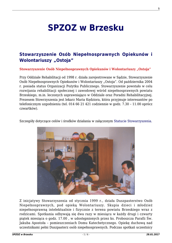 1 SPZOZ w Brzesku Stowarzyszenie Osób Niepełnosprawnych Opiekunów i Wolontariuszy „Ostoja” Stowarzyszenie Osób Niepełnosprawnych Opiekunów i Wolontariuszy „Ostoja” Przy Oddziale Rehabilitacji od 1998 r. działa zarejestrowane w Sądzie, Stowarzyszenie Osób Niepełnosprawnych Opiekunów i Wolontariuszy „Ostoja”. Od października 2004 r. posiada status Organizacji Pożytku Publicznego. Stowarzyszenie powstało w celu rozwijania rehabilitacji społecznej i zawodowej wśród niepełnosprawnych powiatu Brzeskiego, m.in. leczonych usprawniająco w Oddziale oraz Poradni Rehabilitacyjnej. Prezesem Stowrzyszenia jest lekarz Maria Kędziora, która przyjmuje interesantów po telefonicznym uzgodnieniu (tel. 014 66 21 421 codziennie w godz. 7.30 – 11.00 oprócz czwartków). Szczegóły dotyczące celów i środków działania w załączonym Statucie Stowarzyszenia. Z inicjatywy Stowarzyszenia od stycznia 1999 r., działa Duszpasterstwo Osób Niepełnosprawnych, pod opieką Wolontariuszy. Skupia dzieci i młodzież niepełnosprawną intelektualnie i fizycznie z terenu powiatu Brzeskiego wraz z rodzicami. Spotkania odbywają się dwa razy w miesiącu w każdy drugi i czwarty piątek miesiąca o godz. 17.00 , w udostępnionych przez ks. Proboszcza Parafii Św. Jakuba Apostoła – pomieszczeniach Domu Katechetycznego. Opiekę duchową nad uczestnikami pełni Duszpasterz osób niepełnosprawnych. Podczas spotkań uczestnicy SPZOZ w Brzesku -1/4- 28.01.2017 2 biorą udział w grach i zabawach oraz zajęciach plastycznych. Wytworzone prace w bieżącym roku były sprzedane podczas Dni Brzeska przez wykonawców. Uzyskany zarobek został przeznaczony na zakup materiałów do dalszych prac. W ramach Duszpasterstwa odbywają się wycieczki krajoznawcze, współfinansowane przez samorząd. W miesiącu lutym 2001 roku, z inicjatywy Samorządu Powiatowego, przy Stowarzyszeniu powstały Warsztaty Terapii Zajęciowej dla osób z orzeczonym głębokim stopniem niepełnosprawności. Warsztaty mieszczą się przy ul. Przemysłowej 18 w budynku użyczonym przez Starostwo Powiatowe. Aktualnie pracuje tam 40 uczestników. Warsztaty są finansowane przez Państwowy Fundusz Rehabilitacji. Od kilku lat Stowarzyszenie wraz z Urzędem Gminy w Brzesku organizuje Spartakiady Integracyjne. W zawodach biorą udział Warsztaty Terapii Zajęciowej z rejonu południowej Małopolski. Spartakiady są finansowane przez Państwowy Fundusz rehabilitacji oraz Samorządy Gminy i Powiatu w Brzesku. SPZOZ w Brzesku -2/4- 28.01.2017 3 Od trzech lat jesienią Stowarzyszenie organizuje impreze otwartą dla mieszkańców powiatu Brzeskiego pod nazwą Powiatowy Piknik Integracyjny. Imprezę finansują Regionalny Ośrodek Pomocy Społecznej w Krakowie, PFRON i Urząd Gminy w Brzesku. W roku 2005 Stowarzyszenie wygrało przetarg organizowany przez Urząd Gminy w Brzesku na zadanie: Gimnastyka korekcyjna dla dzieci z grupy podwyższonego ryzyka. Gimnatyka korekcyjna odbywa się w pomieszczeniach Działu Rehabilitacji Szpitala w Brzesku po godzinach pracy za zgodą Dyrektora Szpitala. Gimnastykę prowadzi zatrudniony instruktor gimnastyki leczniczej. Ponadto Stowarzyszenie gromadzi środki z darowizn na dofinansowanie szkoleń pracowników Oddziału i Działu Rehabilitacji, zakup niezbędnego sprzętu do pracy z niepełnosprawnymi oraz niezbędne remonty Oddziału i Działu Rehabilitacji. Więcej wiadomości dotyczących Stowarzyszenia i Warsztatów Terapii Zjęciowej można znależć: 1. www.wtzbrzesko.prv.pl – strona internetowa Warsztatu Terapii Zajęciowej działającego pod Stowarzyszeniem Osób Niepełnosprawnych Opiekunów i Wolontariuszy „Ostoja” 2. www.ms.gov.pl – strona Ministerstwa Sprawiedliwości – Krajowy Rejestr Sądowy – wyszukiwarka organizacji pożytku publicznego 3. www.rops.krakow.pl – Małopolski Informator Społeczny (organizacje pozarządowe) pozycja 199. Bliższe informacje o Oddziale Rehabilitacji oraz o Poradni Rehabilitacyjnej. Od września 2008 r. realizujemy projekt „Budowanie regionalnego systemu wczesnej SPZOZ w Brzesku -3/4- 28.01.2017 4 interwencji”, którego koordynatorem jest Związek Polskich Kawalerów Maltańskich. Partnerem w naszym powiecie brzeskim było Stowarzyszenie „Ostoja” wspierane przez Dyrekcję SP ZOZ w Brzesku. Naszym zadaniem było powołanie i zorganizowanie pracy Powiatowego Zespołu Wczesnej Interwencji. PZWI powstał przy Szpitalu Powiatowym w Brzesku. Objął swoją opieką 10 rodzin z dzieckiem o zaburzonym rozwoju. Prowadzona była terapia dziecka, rodzice uczestniczyli w grupach wsparcia, korzystali też z pomocy trenera rodzinnego. Specjaliści PZWI szkolili się w Maltańskim Centrum Pomocy w Krakowie. W projekcie pomagali nam nasi wolontariusze. Po zakończeniu projektu PZWI będzie nadal działał w ramach Ośrodka Rehabilitacji Dziennej dla Dzieci Szpitala Powiatowego SP ZOZ w Brzesku. Projekt uzyskał wsparcie udzielone przez Islandię, Liechtenstein i Norwegię poprzez dofinansowanie ze środków Mechanizmu Finansowego Europejskiego Obszaru Gospodarczego oraz Norweskiego Mechanizmu Finansowego, a także z budżetu Rzeczpospolitej Polskiej w ramach Funduszu dla Organizacji Pozarządowych. SPZOZ w Brzesku -4/4- 28.01.2017