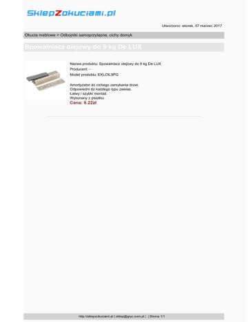 Utworzono: wtorek, 07 marzec 2017 Okucia meblowe > Odbojniki samoprzylepne, cichy domyk Spowalniacz olejowy do 9 kg De LUX Nazwa produktu: Spowalniacz olejowy do 9 kg De LUX Producent: Model produktu: EKLOIL9PG Amortyzator do cichego zamykania drzwi. Odpowiedni do każdego typu zawias. Łatwy i szybki montaż. Wykonany z plastiku Cena: 6.22zł http://sklepzokuciami.pl | [email protected] | | Strona 1/1