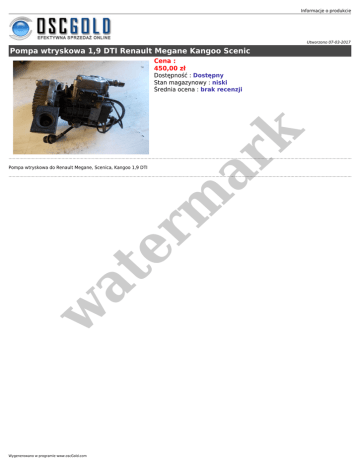 Informacje o produkcie Utworzono 07-03-2017 Pompa wtryskowa 1,9 DTI Renault Megane Kangoo Scenic Cena : 450,00 zł er m ar k Dostępność : Dostępny Stan magazynowy : niski Średnia ocena : brak recenzji w at Pompa wtryskowa do Renault Megane, Scenica, Kangoo 1,9 DTI Wygenerowano w programie www.oscGold.com