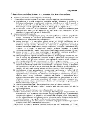 Załącznik nr 1 Wykaz dokumentacji obowiązującej przy ubieganiu się o stypendium socjalne 1. Wniosek o przyznanie świadczeń pomocy materialnej 2. Dokumenty stwierdzające wysokość dochodu rodziny doktoranta, w tym odpowiednio: 1) zaświadczenia z urzędu skarbowego członków rodziny doktoranta i doktoranta o dochodzie podlegającym opodatkowaniu podatkiem dochodowym od osób fizycznych na zasadach określonych w art. 27, 30b, 30c i 30e ustawy z dnia 26 lipca 1991 r. o podatku dochodowym od osób fizycznych (j.t. Dz. U. z 2012 r., poz. 361, z późn. zm.); 2) oświadczenia członków rodziny doktoranta i doktoranta o dochodzie niepodlegającym opodatkowaniu podatkiem dochodowym od osób fizycznych osiągniętym w roku kalendarzowym poprzedzającym rok akademicki; 3. Inne dokumenty i oświadczenia: 1) zaświadczenia właściwego organu gminy lub nakaz płatniczy o wielkości gospodarstwa rolnego wyrażonej w hektarach przeliczeniowych ogólnej powierzchni w roku kalendarzowym, poprzedzającym rok akademicki; 2) umowa dzierżawy - w przypadku oddania części lub całości znajdującego się w posiadaniu rodziny doktoranta lub doktoranta gospodarstwa rolnego, w dzierżawę, na podstawie umowy zawartej stosownie do przepisów o ubezpieczeniu społecznym rolników albo oddania gospodarstwa rolnego w dzierżawę w związku z pobieraniem renty określonej w przepisach o wspieraniu rozwoju obszarów wiejskich ze środków pochodzących z Sekcji Gwarancji Europejskiego Funduszu Orientacji i Gwarancji Rolnej; 3) umowa zawarta w formie aktu notarialnego, w przypadku wniesienia gospodarstwa rolnego do użytkowania przez rolniczą spółdzielnię produkcyjną; 4) odpis podlegającego wykonaniu orzeczenia sądowego zasądzającego alimenty na rzecz osób w rodzinie lub spoza rodziny, lub odpis protokołu posiedzenia zawierającego treść ugody sądowej, lub odpis zatwierdzonej przez sąd ugody zawartej przed mediatorem, zobowiązujących do alimentów na rzecz osób w rodzinie lub poza rodziną, 5) przekazy lub przelewy pieniężne dokumentujące wysokość zapłaconych alimentów, jeżeli członkowie rodziny są zobowiązani wyrokiem sądu, ugodą spoza rodziny, w przypadku gdy osoba uprawniona nie otrzymała alimentów albo otrzymała je w wysokości niższej od ustalonej w wyroku sądu, ugodzie sądowej lub ugodzie zawartej przed mediatorem: 6) zaświadczenie organu prowadzącego postępowanie egzekucyjne o całkowitej lub częściowej bezskuteczności egzekucji alimentów, a także o wysokości wyegzekwowanych alimentów, lub informację właściwego sądu lub właściwej instytucji o podjęciu przez osobę uprawnioną czynności związanych z wykonaniem tytułu wykonawczego za granicą albo o niepodjęciu tych czynności, w szczególności w związku z brakiem podstawy prawnej do ich podjęcia lub brakiem możliwości wskazania przez osobę uprawnioną miejsca zamieszkania dłużnika alimentacyjnego za granicą, jeżeli dłużnik zamieszkuje za granicą; 7) odpis prawomocnego wyroku oddalającego powództwo o ustalenie alimentów; 8) orzeczenie sądu zobowiązujące jednego z rodziców do ponoszenia całkowitych kosztów utrzymania dziecka; 9) odpis zupełny aktu urodzenia, w przypadku gdy ojciec jest nieznany; 10) odpis prawomocnego wyroku sądu rodzinnego stwierdzającego przysposobienie lub zaświadczenie sądu rodzinnego lub ośrodka adopcyjno-opiekuńczego o prowadzonym postępowaniu sądowym w sprawie o przysposobienie dziecka; odpis prawomocnego wyroku sądu rodzinnego orzekającego rozwód lub separację albo akt zgonu małżonka lub rodzica doktoranta – w przypadku osoby samotnie wychowującej dziecko; 11) dokument określający datę utraty dochodu oraz miesięczną wysokość utraconego dochodu przez doktoranta lub członka rodziny doktoranta; 12) dokument określający wysokość dochodu uzyskanego przez doktoranta lub członka rodziny doktoranta, w przypadku uzyskania dochodu w roku kalendarzowym poprzedzającym rok akademicki określający również liczbę miesięcy, w których dochód był osiągany; 13) orzeczenie o niepełnosprawności lub stopniu niepełnosprawności doktoranta lub członków rodziny doktoranta powyżej 18 roku życia, o ile nie uczą się i pozostają na utrzymaniu doktoranta lub rodziny doktoranta; 14) zaświadczenie z urzędu pracy potwierdzające fakt pozostawania bez pracy z prawem lub bez prawa do zasiłku w przypadku bezrobotnych członków rodziny doktoranta. Zaświadczenie takie jest bezwzględnie wymagane również, w przypadku utraty dochodu. Zaświadczenie takie musi zawierać informacje o wysokości uzyskiwanego zasiłku lub stypendium dla bezrobotnych i okresie jego otrzymywania; 15) zaświadczenie pracodawcy o terminie urlopu wychowawczego członka rodziny doktoranta i okresie na jaki został on udzielony oraz o okresach zatrudnienia; 16) zaświadczenie o uczęszczaniu do szkoły lub szkoły wyższej rodzeństwa lub dzieci wnioskodawcy do 26 roku życia. Istnienie rodzeństwa lub dzieci do 18 roku życia, w przypadku nieuczęszczania do szkoły należy udokumentować odpisem skróconym aktu urodzenia; 17) zaświadczenie o wysokości dochodów członka rodziny doktoranta lub doktoranta w przypadku, jeśli osiągał on dochody poza granicami Rzeczypospolitej Polskiej w roku kalendarzowym, z którego ustala się dochód. 4. Pozostałe niezbędne dokumenty konieczne do ustalenia dochodu w rodzinie doktoranta lub poświadczające jego sytuację rodzinną (np. zaświadczenie o otrzymywaniu zasiłków z ośrodka pomocy społecznej, zaświadczenie z policji o zaginięciu członka rodziny doktoranta, zaświadczenie o sytuacji kryzysowej w rodzinie doktoranta, zaświadczenie o przebywaniu członka rodziny doktoranta w miejscach odosobnienia, kopia orzeczenia o niepełnosprawności albo orzeczenie o znacznym lub umiarkowanym stopniu niepełnosprawności - gdy członkiem rodziny doktoranta jest dziecko niepełnosprawne nie uczące się lub powyż