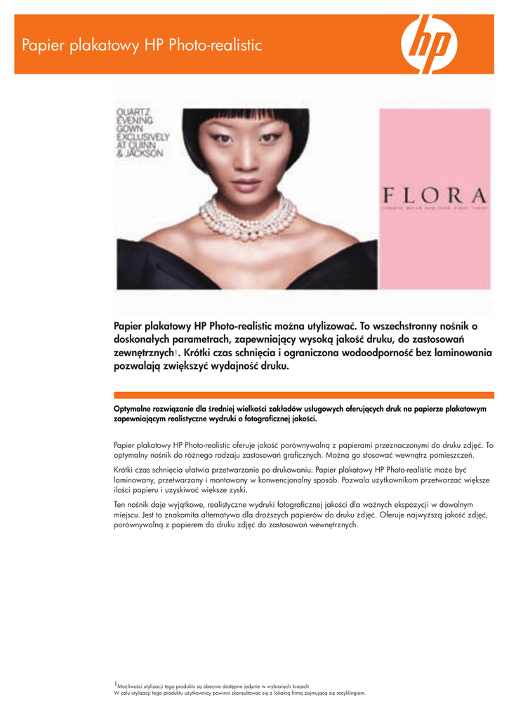 Papier plakatowy HP Photo-realistic Papier plakatowy HP Photo-realistic można utylizować. To wszechstronny nośnik o doskonałych parametrach, zapewniający wysoką jakość druku, do zastosowań zewnętrznych1. Krótki czas schnięcia i ograniczona wodoodporność bez laminowania pozwalają zwiększyć wydajność druku. Optymalne rozwiązanie dla średniej wielkości zakładów usługowych oferujących druk na papierze plakatowym zapewniającym realistyczne wydruki o fotograficznej jakości. Papier plakatowy HP Photo-realistic oferuje jakość porównywalną z papierami przeznaczonymi do druku zdjęć. To optymalny nośnik do różnego rodzaju zastosowań graficznych. Można go stosować wewnątrz pomieszczeń. Krótki czas schnięcia ułatwia przetwarzanie po drukowaniu. Papier plakatowy HP Photo-realistic może być laminowany, przetwarzany i montowany w konwencjonalny sposób. Pozwala użytkownikom przetwarzać większe ilości papieru i uzyskiwać większe zyski. Ten nośnik daje wyjątkowe, realistyczne wydruki fotograficznej jakości dla ważnych ekspozycji w dowolnym miejscu. Jest to znakomita alternatywa dla droższych papierów do druku zdjęć. Oferuje najwyższą jakość zdjęć, porównywalną z papierem do druku zdjęć do zastosowań wewnętrznych. 1Możliwości utylizacji tego produktu są obecnie dostępne jedynie w wybranych krajach W celu utylizacji tego produktu użytkownicy powinni skonsultować się z lokalną firmą zajmującą się recyklingiem. Papier plakatowy HP Photo-realistic Zgodność Najnowsze informacje na temat zgodności materiałów eksploatacyjnych do drukarek wielkoformatowych można znaleźć na stronie www.hp.com/go/designjet/supplies Najnowsze profile ICC dla nośników można znaleźć pod adresem www.hp.com/go/designjet/supplies (należy kliknąć profile ICC i wybrać model drukarki). W przypadku drukarek niepostscriptowych informacji na ten temat można zasięgnąć u dostawcy procesora RIP. Dane techniczne produktu Waga Grubość Nieprzejrzystość Jasność Biel Laminowanie Wykończenie Temperatura pracy Wilgotność podczas pracy Atrament o niskiej zawartości rozpuszczalnika odporny na światło (ekspozycja wewnętrzna w domu lub biurze) Wodotrwałość Czas suszenia Okres trwałości Temperatura przechowywania Wilgotność przechowywania Kraj pochodzenia Informacje o zamawianiu 205 g/m² wg metody testowej ISO 536 205 mikronów wg metody ISO 534 98% wg metody testowej TAPPI T-425 90% wg metody testowej TAPPI T-452 110 wg metody CIE GANZ 82 Tak, na gorąco, na zimno, prasowanie na gorąco Lekko błyszczący Od 15 do 100°C Wilgotność wzgl. 20–80% 150 lat (przy zastosowaniu atramentów HP Designjet L65500 Latex). Szczegóły: http://www.hp.com/go/supplies/printpermanence. Odporny na działanie wody Krótki czas schnięcia z suszeniem (w temperaturze 23°C, przy wilgotności względnej 50%) 2 lata w oryginalnym, fabrycznie zamkniętym opakowaniu od 0 do 40° C wilgotność względna 5-95% Wyprodukowano w Stanach Zjednoczonych Numer produktu CG419A CG420A CG421A CG422A Gwarancja Wymiary rolki 914 1372 1524 2261 mm mm mm mm 61 61 61 61 m m m m Kod UPC 883585618606 883585618613 883585618620 883585618637 HP gwarantuje, że jego wielkoformatowe materiały drukarskie są wolne od defektów i wad produkcyjnych i zostały zaprojektowane tak, by przy właściwym użytkowaniu nie powodować zacięć drukarki. Jeśli z jakiegokolwiek powodu użytkownik jest niezadowolony z wielkoformatowego materiału drukarskiego HP, powinien skontaktować się ze sprzedawcą HP. © 2008 Hewlett-Packard Development Company L.P. Jedyne gwarancje, jakich HP udziela na produkty i usługi, są określone w oświadczeniach gwarancyjnych dostarczanych wraz z takimi produktami i usługami. Żaden zapis niniejszego dokumentu nie może być uważany za dodatkową gwarancję. HP nie ponosi odpowiedzialności za błędy techniczne lub redakcyjne oraz braki występujące w niniejszym dokumencie. Aby uzyskać więcej informacji na temat materiałów do wydruków HP w dużym formacie, odwiedź http://www.hp.com/go/designjet/supplies Publikacja na region EMEA 4AA2-1597 PLE x x x x