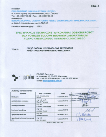 SPIS TREŚCI 1. Określenie przedmiotu zamówienia.........................................................................................4 1.1. Rodzaj, nazwa i lokalizacja ogólna przedsięwzięcia .............................................................4 1.2 Uczestnicy procesu inwestycyjnego ........................................................................................4 1.3 Charakterystyka przedsięwzięcia ............................................................................................4 1.3.1 Ogólny zakres przewidywanych do wykonania robót........................................................4 1.3.2 Opis terenu inwestycji ......................................................................................................5 1.3.3 Warunki gruntowo-wodne i posadowienie obiektów .........................................................6 1.4 Dokumentacja techniczna określająca przedmiot zamówienia i stanowiąca podstawę do realizacji robót .............................................................................................................................7 1.4.1 Spis projektów i opracowań na etapie projektu budowlanego............................................7 1.4.2 Wykaz dokumentacji mających wpływ na realizację inwestycji ....................................7 1.4.3 Zgodność robót z dokumentacją techniczną ......................................................................8 1.4.4 Przedmiary robót ..............................................................................................................8 2. SZCZEGÓŁOWY ZAKRES ROBÓT PRZEWIDYWANYCH DO WYKONANIA ...................8 2.1 Rozbiórki i wycinki ................................................................................................................8 2.2 Adaptacje i dostosowania .......................................................................................................9 2.3 Obiekty nowo projektowane ...................................................................................................9 2.3.1. Budynek techniczny ........................................................................................................9 2.3.1.1 Dane ogólne budynku .................................................................................................9 2.3.1.2 Konstrukcja budynku ............................................................................................... 10 2.3.1.3 Izolacje przeciwwilgociowe (zestawienie zbiorcze) .................................................. 11 2.3.1.4 Izolacje termiczne (zestawienie zbiorcze) ................................................................. 12 2.3.1.5 Pozostałe elementy wykończenia pomieszczeń ......................................................... 12 2.3.1.6 Elementy wykończenia zewnętrznego budynku ........................................................ 13 2.3.1.7 Wymogi i warunki dotyczące ochrony p-poż budynku laboratorium ......................... 14 2.3.1.8 Instalacje wewnętrzne budynku laboratorium (zestawienie zbiorcze) ........................ 14 2.3.1.9 Instalacja centralnego ogrzewania ............................................................................ 15 2.3.1.10 Instalacja wody zimnej ........................................................................................... 16 2.3.1.11 Instalacja wody zmiękczonej .................................................................................. 17 2.3.1.12 Instalacja wody ciepłej ........................................................................................... 18 2.3.1.13 Instalacja kanalizacji sanitarnej............................................................................... 19 2.3.1.14 Instalacja kanalizacji z pomieszczeń laboratoryjnych (technologiczna) ................... 19 2.3.1.15 Instalacja wentylacji i klimatyzacji budynku laboratorium ...................................... 20 2.3.1.16 Instalacje elektryczne wewnętrzne .......................................................................... 25 2.3.2 Obiekty liniowe .............................................................................................................. 33 2.3.2.1 Przyłącze c.o. ........................................................................................................... 33 2.3.2.2 Przyłącze wody zimnej ............................................................................................. 33 2.3.2.3 Przyłącze wody uzdatnionej ..................................................................................... 33 2.3.2.4 Przyłącze wody kanalizacji sanitarnej i technologicznej ........................................... 33 2.3.2.5 Przyłącze elektroenergetyczne .................................................................................. 34 2.3.3 Elementy zagospodarowania terenu. ............................................................................... 35 2.4 Meble laboratoryjne.............................................................................................................. 35 2.4.1 Dane ogólne ................................................................................................................... 35 2.4.2 Wymagania ogólne ......................................................................................................... 36 2.4.2.1 Dygestoria – wymagania ogólne ............................................................................... 37 2.4.2.2 Stoły, zlewy, szafy – wymagania ogólne .................................................................. 37 2.4.3 Meble laboratoryjne i dygestoria- specyfikacja ............................................................... 38 2.4.3.1 Pomieszczenie 0/12. Rozlewania pożywek ............................................................... 38 2.4.3.2 Pomieszczenie 0/13. Pom. przygotowania pożywek i sprzętu ................................... 38 2.4.3.3 Pomieszczenie 0/14. 