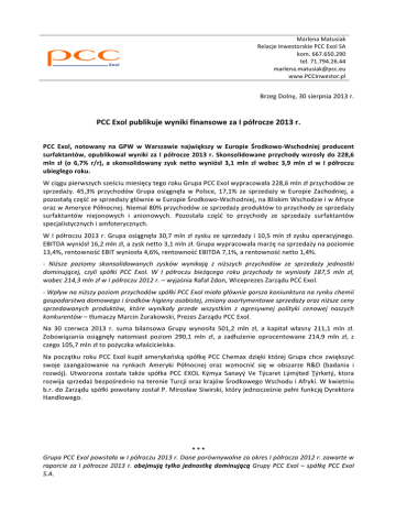 Marlena Matusiak Relacje Inwestorskie PCC Exol SA kom. 667.650.290 tel. 71.794.26.44 [email protected] www.PCCInwestor.pl Brzeg Dolny, 30 sierpnia 2013 r. PCC Exol publikuje wyniki finansowe za I półrocze 2013 r. PCC Exol, notowany na GPW w Warszawie największy w Europie Środkowo-‐Wschodniej producent surfaktantów, opublikował wyniki za I półrocze 2013 r. Skonsolidowane przychody wzrosły do 228,6 mln zł (o 6,7% r/r), a skonsolidowany zysk netto wyniósł 3,1 mln zł wobec 3,9 mln zł w I półroczu ubiegłego roku. W ciągu pierwszych sześciu miesięcy tego roku Grupa PCC Exol wypracowała 228,6 mln zł przychodów ze sprzedaży. 45,3% przychodów Grupa osiągnęła w Polsce, 17,1% ze sprzedaży w Europie Zachodniej, a pozostałą część ze sprzedaży głównie w Europie Środkowo-‐Wschodniej, na Bliskim Wschodzie i w Afryce oraz w Ameryce Północnej. Niemal 80% przychodów ze sprzedaży produktów to przychody ze sprzedaży surfaktantów niejonowych i anionowych. Pozostała część to przychody ze sprzedaży surfaktantów specjalistycznych i amfoterycznych. W I półroczu 2013 r. Grupa osiągnęła 30,7 mln zł zysku ze sprzedaży i 10,5 mln zł zysku operacyjnego. EBITDA wyniósł 16,2 mln zł, a zysk netto 3,1 mln zł. Grupa wypracowała marżę na sprzedaży na poziomie 13,4%, rentowność EBIT wyniosła 4,6%, rentowność EBITDA 7,1%, a rentowność netto 1,4%. -‐ Niższe poziomy skonsolidowanych zysków wynikają z niższych przychodów ze sprzedaży jednostki dominującej, czyli spółki PCC Exol. W I półroczu bieżącego roku przychody te wyniosły 187,5 mln zł, wobec 214,3 mln zł w I półroczu 2012 r. – wyjaśnia Rafał Zdon, Wiceprezes Zarządu PCC Exol. -‐ Wpływ na niższy poziom przychodów spółki PCC Exol miała głównie gorsza koniunktura na rynku chemii gospodarstwa domowego i środków higieny osobistej, zmiany asortymentowe sprzedaży oraz niższe ceny sprzedawanych produktów, które wynikały przede wszystkim z agresywnej polityki cenowej naszych konkurentów – tłumaczy Marcin Żurakowski, Prezes Zarządu PCC Exol. Na 30 czerwca 2013 r. suma bilansowa Grupy wynosiła 501,2 mln zł, a kapitał własny 211,1 mln zł. Zobowiązania osiągnęły natomiast poziom 290,1 mln zł, a zadłużenie oprocentowane 214,9 mln zł, z czego 105,7 mln zł to pożyczka właścicielska. Na początku roku PCC Exol kupił amerykańską spółkę PCC Chemax dzięki której Grupa chce zwiększyć swoje zaangażowanie na rynkach Ameryki Północnej oraz wzmocnić się w obszarze R&D (badania i rozwój). Utworzona została także spółka PCC EXOL Kýmya Sanayý Ve Týcaret Lýmýted Ţýrketý, ktora rozwija sprzedaż bezpośrednio na terenie Turcji oraz krajów Środkowego Wschodu i Afryki. W kwietniu b.r. do Zarządu spółki powołany został P. Mirosław Siwirski, który jednocześnie pełni funkcję Dyrektora Handlowego. * * * Grupa PCC Exol powstała w I półroczu 2013 r. Dane porównywalne za okres I półrocza 2012 r. zawarte w raporcie za I półrocze 2013 r. obejmują tylko jednostkę dominującą Grupy PCC Exol – spółkę PCC Exol S.A. PCC Exol S.A. strona 2 O spółce PCC Exol jest największym producentem środków powierzchniowo czynnych (surfaktantów) w Polsce i regionie Europy Środkowo-‐Wschodniej. PCC Exol jest jedynym producentem surfaktantów anionowych i niejonowych w Polsce. Główna siedziba firmy zlokalizowana jest w Brzegu Dolnym (w pobliżu Wrocławia). W swojej ofercie Grupa PCC Exol posiada ok. 160 produktów i 300 formulacji wykorzystywanych w różnorodnych gałęziach przemysłu. Surfaktanty wytwarzane przez PCC Exol są np. istotnym składnikiem detergentów i środków ̨ higieny osobistej. Stosowane są ̨ także w produkcji środków do czyszczenia i mycia przemysłowego, tworzyw sztucznych, farb, lakierów i klejów, obróbki metalu, w przemyśle budowlanym, celulozowo-‐papierniczym i włókienniczym oraz są ̨ składnikiem agrochemikaliów. PCC Exol świadczy także usługi w zakresie produkcji chemicznej surfaktantów na specjalne zamówienie klienta. Tak szerokie zastosowanie środków powierzchniowo czynnych powoduje, że przychody PCC Exol są ̨ w znacznym stopniu zdywersyfikowane. W skład Grupy Kapitałowej PCC Exol wchodzą dwie spółki zależne – PCC Chemax z siedzibą w Piedmont (Karolina Południowa, USA) oraz PCC EXOL Kýmya Sanayý Ve Týcaret Lýmýted Ţýrketý (PCC EXOL Przemysł Chemiczny i Handel sp. z o.o.) z siedzibą w Stambule, Turcja. PCC Chemax zajmuje się opracowywaniem surfaktantów specjalistycznych, wykorzystywanych jako dodatki w różnych gałęziach przemysłu. PCC EXOL Kýmya Sanayý Ve Týcaret Lýmýted Ţýrketý rozwija sprzedaż bezpośrednio na terenie Turcji oraz krajów Środkowego Wschodu i Afryki. PCC Exol jest od sierpnia 2012 r. notowana na Giełdzie Papierów Wartościowych w Warszawie S.A. Strategicznym akcjonariuszem PCC Exol jest PCC Spółka Europejska z siedzibą w Duisburgu, która kieruje grupą ponad 70 spółek zależnych działających w 16 krajach. PCC SE posiada 94,25% udziału w kapitale zakładowym PCC Exol. Jedynym akcjonariuszem PCC SE jest pan Waldemar Preussner, który w 2009 r. został uhonorowany Polsko-‐ Niemiecką Nagrodą Gospodarczą za szczególne zasługi w rozwoju współpracy gospodarczej pomiędzy obydwoma krajami.