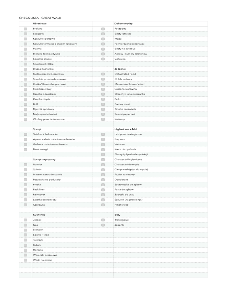CHECK LISTA - GREAT WALK Ubraniowe Dokumenty itp. Bielizna Poszporty Skarpetki Bilety lotnicze Koszulki sportowe Mapa Koszulki termalne z długim rękawem Potwierdzenie rezerwacji Piżama Bilety na autobus Bielizna termoaktywna Adresy i numery telefonów Spodnie długie Gotówka Spodenki krótkie Bluza z kapturem Jedzenie Kurtka przeciwdeszczowa Dehydrated Food Spodnie przeciwdeszczowe Chleb tostowy Kurtka/ Kamizelka puchowa Masło orzechowe / miód Strój kąpielowy Suszona wołowina Czapka z daszkiem Orzechy i inna mieszanka Czapka ciepła Żelki Buff Batony musli Ręcznik sportowy Gorzka czekolada Mały ręcznik (frotte) Salami peperonii Okulary przeciwsłoneczne Krakersy Sprzęt Higieniczne + leki Telefon + ładowarka Leki przeciwalergiczne Aparat + dwie naładowane baterie Ibuprom GoPro + naładowana bateria Voltaren Bank energii Krem do opalania Plastry i płyn do dezynfekcji Sprzęt turystyczny Chusteczki higieniczne Namiot Chusteczki do mycia Śpiwór Camp wash (płyn do mycia) Mata/materac do spania Papier toaletowy Poszewka na poduszkę Deodorant Plecka Szczoteczka do zębów Pack liner Pasta do zębów Raincover Zatyczki do uszu Latarka do namiotu Sznurek (na pranie itp.) Czołówka Hiker’s wool Kuchenne Buty Jetboil Trekingowe Gas Japonki Steripen Sporks + nóż Talerzyk Kubek Herbata Woreczki próżniowe Worki na śmieci