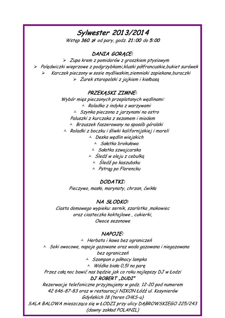 Sylwester 201 3/201 4 Wstęp 360 zł od pary, godz. 21 : 00 do 5: 00 DANIA GORĄCE: Zupa krem z pomidorów z groszkiem ptysiowym Polędwiczki wieprzowe z podgrzybkami,kluski półfrancuskie,bukiet surówek Karczek pieczony w sosie myśliwskim,ziemniaki zapiekane,buraczki Żurek staropolski z jajkiem i kiełbasą PRZEKĄSKI ZIMNE: Wybór mięs pieczonych przeplatanych wędlinami: Roladka z indyka z warzywami Szynka pieczona z jarzynami na ostro Paluszki z kurczaka z sezamem i miodem Brzuszek faszerowany na sposób góralski Roladki z boczku i śliwki kalifornijskiej i moreli Deska wędlin wiejskich Sałatka brokułowa Sałatka szwajcarska Śledź w oleju z cebulką Śledź po kaszubsku Pstrąg po Florencku DODATKI: Pieczywo, masło, marynaty, chrzan, ćwikła NA SŁODKO: Ciasta domowego wypieku: sernik, szarlotka ,makowiec oraz ciasteczka koktajlowe , cukierki, Owoce sezonowe NAPOJE: Herbata i kawa bez ograniczeń Soki owocowe, napoje gazowane oraz woda gazowana i niegazowana bez ograniczeń Szampan o północy lampka Wódka biała 0,5l na parę Przez całą noc bawić nas będzie jak co roku najlepszy DJ w Łodzi DJ ROBERT „DUDI” Rezerwacje telefoniczne przyjmujemy w godz. 12-20 pod numerem 42 646-87-83 oraz w restauracji NIKON Łódź ul. Kosynierów Gdyńskich 18 (teren CHKS-u) SALA BALOWA mieszcząca się w ŁODZI przy ulicy DĄBROWSKIEGO 225/243 (dawny zakład POLANIL)