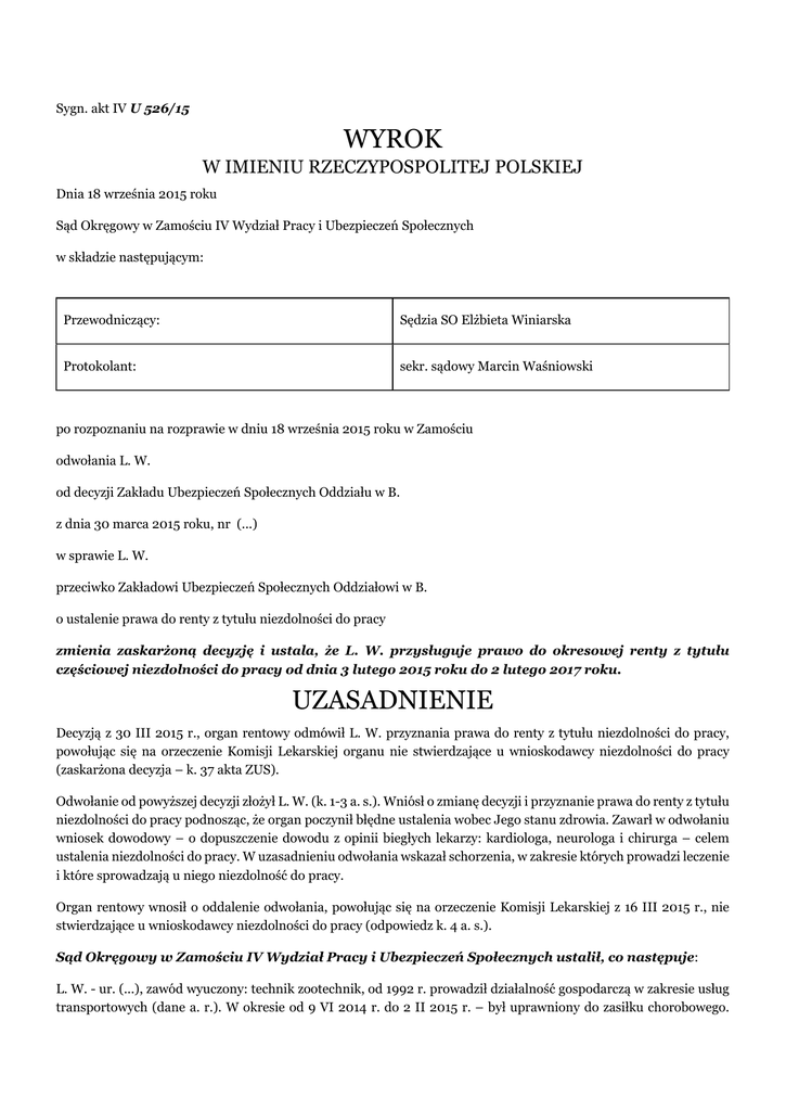 Sygn. akt IV U 526/15 WYROK W IMIENIU RZECZYPOSPOLITEJ POLSKIEJ Dnia 18 września 2015 roku Sąd Okręgowy w Zamościu IV Wydział Pracy i Ubezpieczeń Społecznych w składzie następującym: Przewodniczący: Sędzia SO Elżbieta Winiarska Protokolant: sekr. sądowy Marcin Waśniowski po rozpoznaniu na rozprawie w dniu 18 września 2015 roku w Zamościu odwołania L. W. od decyzji Zakładu Ubezpieczeń Społecznych Oddziału w B. z dnia 30 marca 2015 roku, nr (...) w sprawie L. W. przeciwko Zakładowi Ubezpieczeń Społecznych Oddziałowi w B. o ustalenie prawa do renty z tytułu niezdolności do pracy zmienia zaskarżoną decyzję i ustala, że L. W. przysługuje prawo do okresowej renty z tytułu częściowej niezdolności do pracy od dnia 3 lutego 2015 roku do 2 lutego 2017 roku. UZASADNIENIE Decyzją z 30 III 2015 r., organ rentowy odmówił L. W. przyznania prawa do renty z tytułu niezdolności do pracy, powołując się na orzeczenie Komisji Lekarskiej organu nie stwierdzające u wnioskodawcy niezdolności do pracy (zaskarżona decyzja – k. 37 akta ZUS). Odwołanie od powyższej decyzji złożył L. W. (k. 1-3 a. s.). Wniósł o zmianę decyzji i przyznanie prawa do renty z tytułu niezdolności do pracy podnosząc, że organ poczynił błędne ustalenia wobec Jego stanu zdrowia. Zawarł w odwołaniu wniosek dowodowy – o dopuszczenie dowodu z opinii biegłych lekarzy: kardiologa, neurologa i chirurga – celem ustalenia niezdolności do pracy. W uzasadnieniu odwołania wskazał schorzenia, w zakresie których prowadzi leczenie i które sprowadzają u niego niezdolność do pracy. Organ rentowy wnosił o oddalenie odwołania, powołując się na orzeczenie Komisji Lekarskiej z 16 III 2015 r., nie stwierdzające u wnioskodawcy niezdolności do pracy (odpowiedz k. 4 a. s.). Sąd Okręgowy w Zamościu IV Wydział Pracy i Ubezpieczeń Społecznych ustalił, co następuje: L. W. - ur. (...), zawód wyuczony: technik zootechnik, od 1992 r. prowadził działalność gospodarczą w zakresie usług transportowych (dane a. r.). W okresie od 9 VI 2014 r. do 2 II 2015 r. – był uprawniony do zasiłku chorobowego. Wniosek o ustalenie prawa do renty z tytułu niezdolności do pracy L. W. złożył w organie rentowym dnia 9 XII 2014 r. Do wniosku dołączył dokumentację medyczną (a.r., dok. lek.). Wnioskodawca spełnia warunek posiadania 5 letniego okresu składkowego i nieskładkowego w 10 – leciu przed złożeniem wniosku o rentę. Lekarz Orzecznik organu, orzeczeniem z 13 II 2015 r., nie stwierdził u wnioskodawcy niezdolności do pracy. Po wniesieniu przez wnioskodawcę sprzeciwu - został on skierowany na badanie przez Komisję Lekarską, która orzeczeniem z 16 III 2015 r. także nie stwierdziła niezdolności do pracy (k. 35 – 36 a.r.). W oparciu o to orzeczenie, zaskarżoną decyzją organ rentowy odmówił L. W. przyznania prawa do renty (zask. dec. a.r. w/w). Ustaleń powyższych Sąd dokonał w oparciu o materiał dowodowy zgromadzony w aktach ZUS, co obejmuje też dokumentację medyczną dotyczącą schorzeń wnioskodawcy i dowody prowadzonego leczenia (a. r., a. s. – fakty nie kwestionowane). Uwzględniając dostępną dokumentację medyczną oraz zakres schorzeń skarżącego stwierdzanych przed organem rentowym, Sąd w celu zbadania prawidłowości zaskarżonej decyzji, w zakresie oceny stopnia niezdolności skarżącego do pracy, dopuścił dowód z opinii biegłych lekarzy specjalistów: kardiologa – internisty, diabetologa, chirurga – urologa i neurologa (post. Sądu z 3 VI 2015 r. k. 6 a. s.). Biegłym lekarzom zlecono zapoznanie się z aktami sprawy, przebadanie skarżącego i wydanie opinii określającej stopień niezdolności do pracy z ogólnego stanu zdrowia, daty powstania oraz wskazanie czasokresu trwania tej niezdolności. Biegli lekarze w składzie: neurolog, urolog i kardiolog – internista, po ocenie dokumentacji medycznej i zbadaniu wnioskodawcy, w opinii z 23 VI 2015 r., uznali L. W. za częściowo, okresowo niezdolnego do pracy od 2 II 2015 r. (tj. od wyczerpania zasiłku chorobowego) do 2 II 2017 r. Jak wskazali w/w biegli lekarze – głównym powodem uznania częściowej niezdolności do pracy są stwierdzone zmiany w zakresie układu krążenia, z dużym udziałem cukrzycy i zmian zwyrodnieniowych kręgosłupa. Biegły diabetolog– wypowiedział się w odrębnej opinii z 23 VI 2015 r. W ocenie biegłego kardiologa – internisty, nadciśnienie tętnicze ma charakter zaawansowany i przebiega z uszkodzeniem serca, na co wskazują zmiany w echo serca. Biegły stwierdził: wyraźne objawy choroby niedokrwiennej serca, zmiany w próbie wysiłkowej, bóle wysiłkowe, małą wydolność fizyczną, pojawienie się cech niedokrwienia w czasie wysiłku i pobudzenia dodatkowe komorowe. Biegły kardiolog wskazał na konieczność poszerzonej diagnostyki choroby niedokrwiennej serca, tj. tomografii komputerowej naczyń wieńcowych a nawet koronorografii. Biegły neurolog wskazał, że zmiany zwyrodnieniowe kręgosłupa przebiegają obecnie bez wyraźnej dysfunkcji narządu ruchu, niemniej jednak wnioskodawca miewa stałe bóle kręgosłupa i prawego biodra, wymagające przewlekłego stosowania leków przeciwbólowych. Biegły urolog także wypowiedział się w w/w opinii, uzasadniając swoje stanowisko. Skład w/w biegłych, w łącznej opinii, wskazał na obecnie wyraźnie ograniczoną wydolność fizyczną wnioskodawcy, co kwalifikuje – w ocenie biegłych – do okresowej, częściowej niezdolności do pracy (k. 12 – 13, 14 – 15 v a.s.). Biegły diabetolog nie stwierdził niezdolności do pracy, aczkolwiek podał, że cukrzyca typu II przebiega z wysokimi wartościami stężenia cukru we krwi – ponad 200 mg % i wpływa niekorzystnie na układ krążenia, przy czym stwierdzono początkowe stadium powikłań w postaci polineuropatii cukrzycowej (opinia k. 11 a.s.). Sąd przyjął opinie z 23 VI 2015 r. w poczet dowodów. Zauważyć trzeba, ż