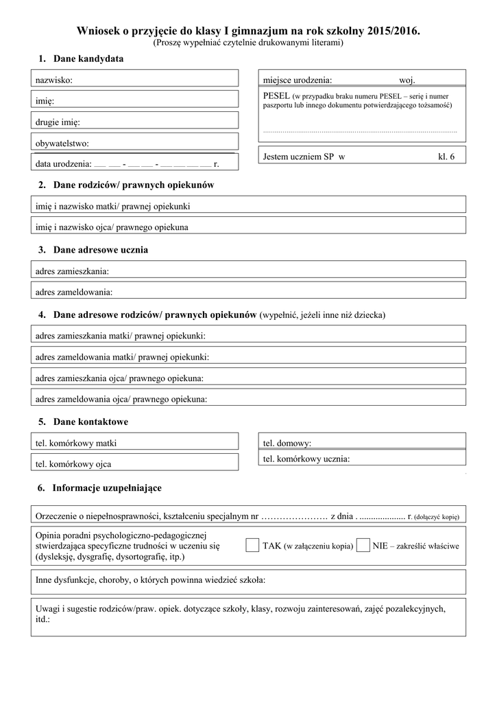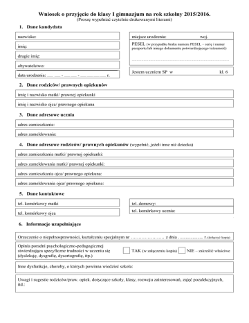 Wniosek o przyjęcie do klasy I gimnazjum na rok szkolny 2015/2016.