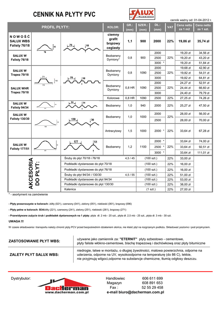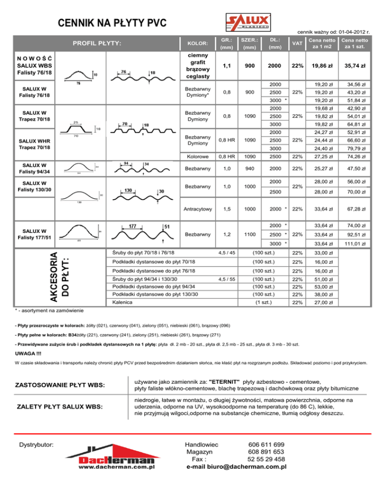 CENNIK NA PŁYTY PVC cennik ważny od: 01-04-2012 r. PROFIL PŁYTY: KOLOR: GR.: SZER.: DŁ.: (mm) (mm) (mm) 2000 NOWOŚĆ SALUX WBS Falisty 76/18 ciemny grafit brązowy ceglasty 1,1 900 SALUX W Falisty 76/18 Bezbarwny Dymiony* 0,8 900 SALUX W Trapez 70/18 VAT Cena netto za 1 m2 Cena netto za 1 szt. 22% 19,86 zł 35,74 zł 19,20 zł 34,56 zł 19,20 zł 43,20 zł 3000 * 19,20 zł 51,84 zł 2000 19,68 zł 42,90 zł 19,82 zł 54,01 zł 3000 19,82 zł 64,81 zł 2000 24,27 zł 52,91 zł 24,44 zł 66,60 zł 2000 Bezbarwny Dymiony 0,8 2500 1090 2500 22% 22% Bezbarwny Dymiony 0,8 HR 1090 24,40 zł 79,79 zł Kolorowe 0,8 HR 1090 2500 22% 27,25 zł 74,26 zł SALUX W Falisty 94/34 Bezbarwny 1,0 940 2000 22% 25,27 zł 47,50 zł SALUX W Falisty 130/30 Bezbarwny 1,0 1000 28,00 zł 56,00 zł 28,00 zł 70,00 zł 33,64 zł 67,28 zł 33,64 zł 74,00 zł 33,64 zł 92,51 zł 33,64 zł 111,01 zł SALUX WHR Trapez 70/18 2500 22% 3000 2000 22% 2500 Antracytowy 1,5 1000 2000 * 22% 2000 * SALUX W Falisty 177/51 Bezbarwny 1,2 1100 2500 * 22% AKCESORIA DO PŁYT: 3000 * Śruby do płyt 70/18 i 76/18 (100 szt.) 22% 33,00 zł Podkładki dystansowe do płyt 70/18 (100 szt.) 22% 16,00 zł Podkładki dystansowe do płyt 76/18 (100 szt.) 22% 16,00 zł 4,5 / 45 Śruby do płyt 94/34 i 130/30 (100 szt.) 22% 51,00 zł Podkładki dystansowe do płyt 94/34 (100 szt.) 22% 53,00 zł Podkładki dystansowe do płyt 130/30 (100 szt.) 22% 38,00 zł (1 szt.) 22% 27,00 zł 4,5 / 55 Kalenica * - asortyment na zamówienie - Płyty przezroczyste w kolorach: żółty (021), czerwony (041), zielony (051), niebieski (061), brązowy (096) - Płyty pełne w kolorach: B34żółty (221), czerwony (241), zielony (251), niebieski (261), brązowy (271) - Przewidywane zużycie śrub i podkładek dystansowych na 1 płytę: płyta dł. 2 mb - 20 szt., płyta dł. 2,5 mb - 25 szt., płyta dł. 3 mb - 30 szt. UWAGA !!! W czasie składowania i transportu należy chronić płyty PCV przed bezpośrednim działaniem słońca, nie kłaść płyt na rozgrzanym podłożu. Składować poziomo i pod przykryciem. ZASTOSOWANIE PŁYT WBS: ZALETY PŁYT SALUX WBS: Dystrybutor: używane jako zamiennik za: "ETERNIT" płyty azbestowo - cementowe, płyty faliste włókno-cementowe, blachę trapezową i dachówkową oraz płyty bitumiczne niedrogie, łatwe w montażu, o długiej żywotności, matowa powierzchnia, odporne na uderzenia, odporne na UV, wysokoodporne na temperaturę (do 86 C), lekkie, nie przyjmują wilgoci,odporne na substancje chemiczne, tłumią odgłosy deszczu. Handlowiec 606 611 699 Magazyn 608 891 653 Fax : 52 55 29 458 e-mail [email protected]