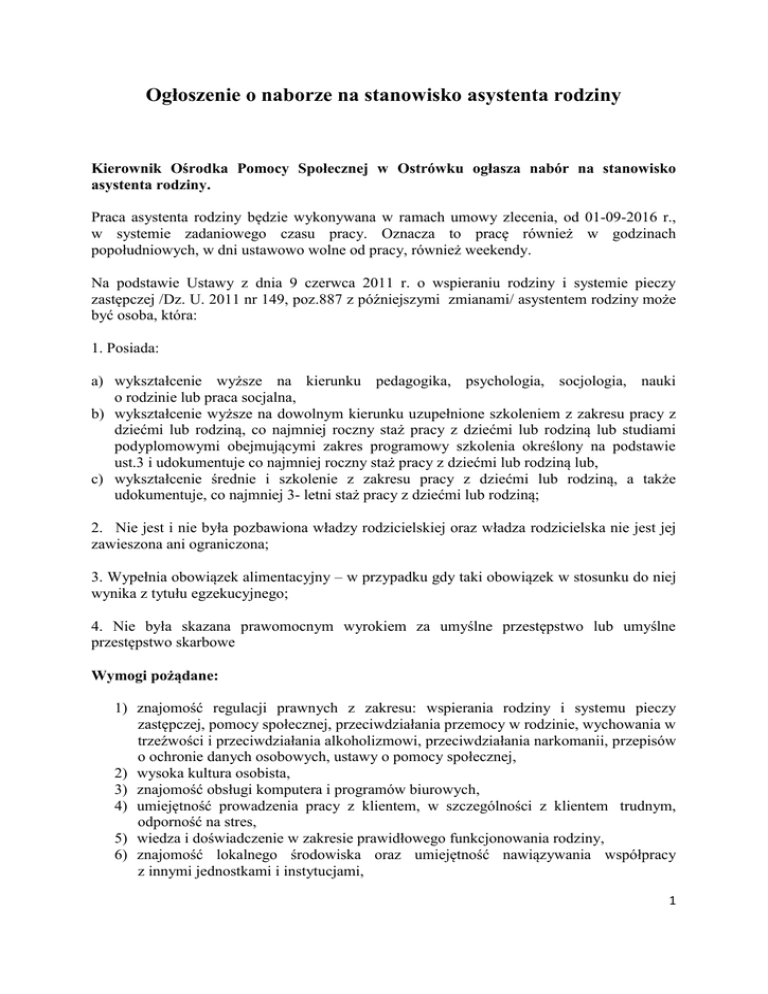Ogłoszenie o naborze na stanowisko asystenta rodziny Kierownik Ośrodka Pomocy Społecznej w Ostrówku ogłasza nabór na stanowisko asystenta rodziny. Praca asystenta rodziny będzie wykonywana w ramach umowy zlecenia, od 01-09-2016 r., w systemie zadaniowego czasu pracy. Oznacza to pracę również w godzinach popołudniowych, w dni ustawowo wolne od pracy, również weekendy. Na podstawie Ustawy z dnia 9 czerwca 2011 r. o wspieraniu rodziny i systemie pieczy zastępczej /Dz. U. 2011 nr 149, poz.887 z późniejszymi zmianami/ asystentem rodziny może być osoba, która: 1. Posiada: a) wykształcenie wyższe na kierunku pedagogika, psychologia, socjologia, nauki o rodzinie lub praca socjalna, b) wykształcenie wyższe na dowolnym kierunku uzupełnione szkoleniem z zakresu pracy z dziećmi lub rodziną, co najmniej roczny staż pracy z dziećmi lub rodziną lub studiami podyplomowymi obejmującymi zakres programowy szkolenia określony na podstawie ust.3 i udokumentuje co najmniej roczny staż pracy z dziećmi lub rodziną lub, c) wykształcenie średnie i szkolenie z zakresu pracy z dziećmi lub rodziną, a także udokumentuje, co najmniej 3- letni staż pracy z dziećmi lub rodziną; 2. Nie jest i nie była pozbawiona władzy rodzicielskiej oraz władza rodzicielska nie jest jej zawieszona ani ograniczona; 3. Wypełnia obowiązek alimentacyjny – w przypadku gdy taki obowiązek w stosunku do niej wynika z tytułu egzekucyjnego; 4. Nie była skazana prawomocnym wyrokiem za umyślne przestępstwo lub umyślne przestępstwo skarbowe Wymogi pożądane: 1) znajomość regulacji prawnych z zakresu: wspierania rodziny i systemu pieczy zastępczej, pomocy społecznej, przeciwdziałania przemocy w rodzinie, wychowania w trzeźwości i przeciwdziałania alkoholizmowi, przeciwdziałania narkomanii, przepisów o ochronie danych osobowych, ustawy o pomocy społecznej, 2) wysoka kultura osobista, 3) znajomość obsługi komputera i programów biurowych, 4) umiejętność prowadzenia pracy z klientem, w szczególności z klientem trudnym, odporność na stres, 5) wiedza i doświadczenie w zakresie prawidłowego funkcjonowania rodziny, 6) znajomość lokalnego środowiska oraz umiejętność nawiązywania współpracy z innymi jednostkami i instytucjami, 1 7) samodzielność w działaniu oraz wykazywanie własnej inicjatywy, kreatywność 8) umiejętność zachowania bezstronności w kontakcie z rodziną, 9) nieposzlakowana opinia, 10) umiejętność pracy w grupie, Do zadań asystenta rodziny należy w szczególności: 1) Opracowanie i realizacja planu pracy z rodzina we współpracy z członkami rodziny i w konsultacji z pracownikiem socjalnym, o którym mowa w art. 11 ust 1: 2) Opracowanie, we współpracy z członkami rodziny i koordynatorem rodziny pieczy zastępczej, planu pracy z rodziną, który jest skoordynowany z planem pomocy dziecku umieszczonym w pieczy zastępczej, 3) Udzielenie pomocy rodzinom w poprawie ich sytuacji życiowej, w tym w zdobywaniu umiejętności prawidłowego prowadzenia gospodarstwa domowego, 4) Udzielenie pomocy rodzinom w rozwiązywaniu problemów socjalnych, 5) Udzielenie pomocy rodzinom w rozwiązywaniu problemów psychologicznych, 6) Udzielenie pomocy rodzinom w rozwiązywaniu problemów wychowawczych z dziećmi, 7) Wsparcie aktywności społecznej rodzin; 8) Motywowanie członków rodzin do podnoszenia kwalifikacji zawodowych, 9) Udzielanie pomocy w poszukiwaniu, podejmowaniu i utrzymywaniu pracy zarobkowej; 10) Motywowanie do udziału w zajęciach grupowych dla rodziców, mających na celu kształtowanie prawidłowych wzorców rodzicielskich i umiejętności psychospołecznych, 11) Udzielanie wsparcia dzieciom, w szczególności poprzez udział w zajęciach psychoedukacyjnych, 12) Podejmowanie działań interwencyjnych i zaradczych w sytuacji zagrożenia, bezpieczeństwa dzieci i rodzin; 13) Prowadzenie indywidualnych konsultacji wychowawczych dla rodziców i dzieci; 14) Prowadzenie dokumentacji dotyczącej pracy z rodziną, 15) Dokonywanie okresowej oceny sytuacji rodziny, nie rzadziej, niż co pół roku i przekazywanie tej oceny OPS, 16) Monitorowanie funkcjonowania rodziny po zakończeniu pracy z rodziną, 17) Sporządzanie na wniosek sądu, opinii o rodzinie i jej członkach 18) Współpraca z jednostkami administracji rządowej i samorządowej, właściwymi organizacjami pozarządowymi oraz innymi podmiotami i osobami specjalizującymi się w działaniach na rzecz dziecka i rodziny, 19) Współpraca z zespołem interdyscyplinarnym lub grupą roboczą, o których mowa w art.9a ustawy z dnia 29 lipca 2005r o przeciwdziałaniu przemocy w rodzinie ( Dz.U. Nr 180, poz.1493, z późn. zm.) lub innymi podmiotami, których pomoc przy wykonywaniu zadań uzna za niezbędna. Informacje dodatkowe: 1) asystent rodziny, wykonuje czynności w ramach swoich obowiązków, korzysta z ochrony przewidzianej dla funkcjonariuszy publicznych, 2) praca asystenta rodziny nie może być łączona z wykonywaniem obowiązków pracownika socjalnego w terenie gminy, w której praca ta jest prowadzona, 2 3) asystent rodziny nie może prowadzić postępowań w zakresu świadczeń realizowanych przez gminę, 4) asystent rodziny jest obowiązany do systematycznego podnoszenia swoich kwalifikacji w zakresie pracy z dziećmi lub rodziną w szczególności przez udział w szkoleniach oraz samokształcenie, 5) asystent rodziny prowadzi prace z rodziną w miejscu jej zamieszkania lub w miejscu wskazanym przez rodzinę, 6) jednostki administracji rządowej i samorządowej właściwe organizacje pozarządowe, podmioty i osoby specjalizujące się w działaniach na rzecz dziecka i rodziny lub podmioty, których pomoc przez wykonywanie zadań uzna za niezbędna – udzielają asystentowi rodziny odpowiedniej pomocy w wykonywaniu czynności zawodowych. Wymagane dokumenty i oświadczenia. 1) CV, list motywacyjny - podpisane odręcznie. 2) Kopie dokumentów potwierdzających posiadane wykształcenie