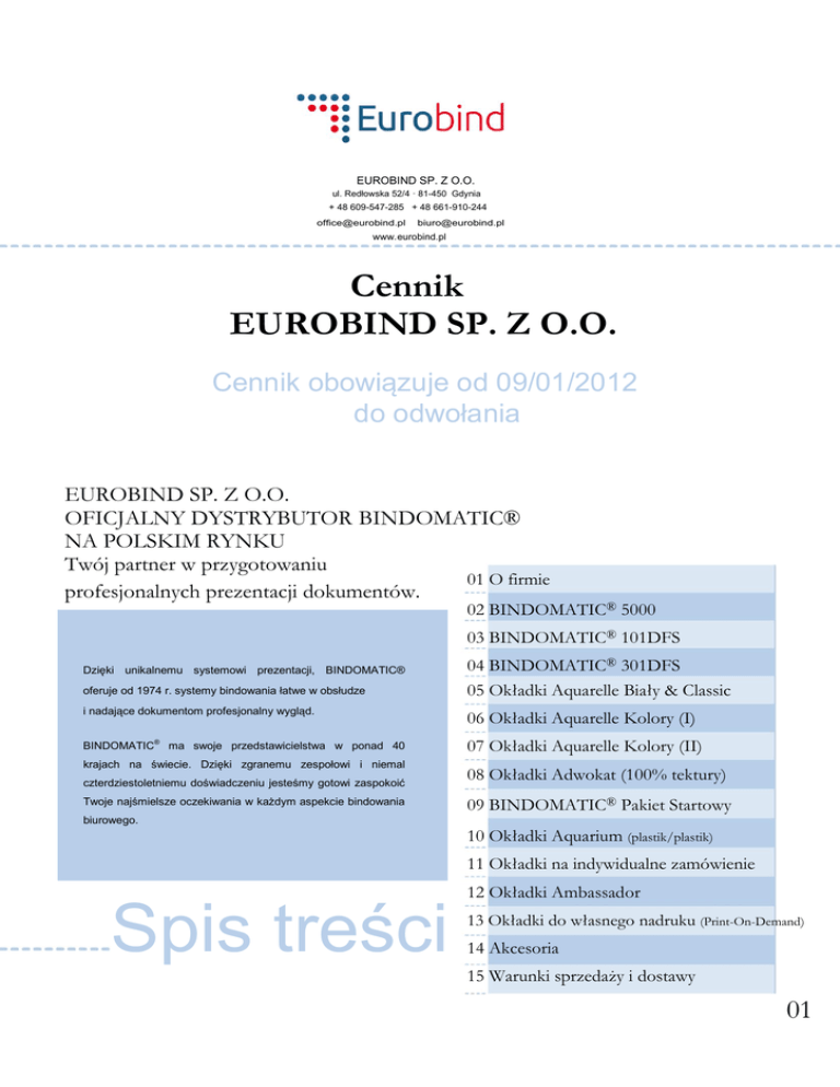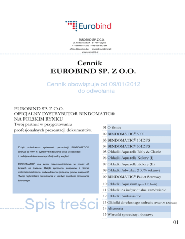 EUROBIND SP. Z O.O. ul. Redłowska 52/4 · 81-450 Gdynia + 48 609-547-285 + 48 661-910-244 [email protected] [email protected] www.eurobind.pl Cennik EUROBIND SP. Z O.O. Cennik obowiązuje od 09/01/2012 do odwołania EUROBIND SP. Z O.O. OFICJALNY DYSTRYBUTOR BINDOMATIC® NA POLSKIM RYNKU Twój partner w przygotowaniu 01 O firmie profesjonalnych prezentacji dokumentów. 02 BINDOMATIC® 5000 03 BINDOMATIC® 101DFS Dzięki unikalnemu systemowi prezentacji, BINDOMATIC® 04 BINDOMATIC® 301DFS oferuje od 1974 r. systemy bindowania łatwe w obsłudze 05 Okładki Aquarelle Biały & Classic i nadające dokumentom profesjonalny wygląd. 06 Okładki Aquarelle Kolory (I) BINDOMATIC® ma swoje przedstawicielstwa w ponad 40 07 Okładki Aquarelle Kolory (II) krajach na świecie. Dzięki zgranemu zespołowi i niemal czterdziestoletniemu doświadczeniu jesteśmy gotowi zaspokoić Twoje najśmielsze oczekiwania w każdym aspekcie bindowania 08 Okładki Adwokat (100% tektury) 09 BINDOMATIC® Pakiet Startowy biurowego. 10 Okładki Aquarium (plastik/plastik) 11 Okładki na indywidualne zamówienie Spis treści 12 Okładki Ambassador 13 Okładki do własnego nadruku (Print-On-Demand) 14 Akcesoria 15 Warunki sprzedaży i dostawy 01 Systemy bindowania Bindomatic® 5000 Stojak z polami chłodzącymi GRATIS Bindowanie spełniające wszelkie potrzeby BINDOMATIC® 5000 jest elektronicznym systemem bindującym o dużym potencjale i elastyczności. Urządzenie oprawia do 540 kartek ( 1080 stron ) wszystkich formatów A3, A4, A5, B5 itd.. Może bindować do 15 okładek w jednym cyklu. Dzięki szerokiej gamie okładek Twoje raporty, prezentacje, instrukcje i oferty będą zawsze wyglądały profesjonalnie. Stojak wraz z polami chłodzącymi posiada praktyczny wskaźnik szerokości grzbietu. Gwarancja - 1 rok. PODSTAWOWE PARAMETRY TECHNICZNE ® 5000 Binduje Formaty A3 / A4 / A5 / B5 maksymalna długość bindowania 370 mm Rodzaje Okładek min. 6 rodzajów okładek BINDOMATIC / miękkie foliowe, kartonowe, twarde 2 Wydajność Bindowania do 540 kartek (1080 stron) 80g/m jednorazowo do 15 dok./ czas bindowania ok. 60 sek. Rozmiary okładek od 1,5mm do 54mm Wykończenie powierzchnia metalowa, płyta grzejna z teflonu Wymiary długość 444 mm / wysokość 132 mm / głębokość 274 mm Waga 5,5 kg Zasilanie 230 V / 700 W www.eurobind.pl Cennik obowiązuje od 09/01/2012 02 Systemy bindowania Bindomatic® 101DFS Automatycznie i szybko BINDOMATIC® 101DFS jest urządzeniem automatycznym, szczególnie polecanym do biur średnich i dużych. Maksymalna wydajność procesu bindowania to nawet 30 dokumentów w ciągu 1 minuty. Idealne rozwiązanie ze względu na łatwość obsługi. Dzięki szerokiej gamie okładek Twoje raporty, prezentacje, instrukcje i oferty będą zawsze wyglądały profesjonalnie. Praktyczny wyświetlacz automatycznie ustala szerokość grzbietu. ® PODSTAWOWE PARAMETRY TECHNICZNE BINDOMATIC 101DFS Binduje Formaty A4 Rodzaje Okładek min. 6 rodzajów okładek BINDOMATIC / miękkie, foliowe, kartonowe, twarde 2 Wydajność Bindowania do 150 kartek (300 stron) 80g/m jednorazowy cykl bindowania/załadowania do 30 dokumentów w czasie 1 minuty Rozmiary okładek od 1,5mm do 15mm Wymiary długość 511 mm / wysokość 475 mm / głębokość 360 mm Waga 27 kg Zasilanie 230 V / 700 W www.eurobind.pl Cennik obowiązuje od 09/01/2012 03 Systemy bindowania Online and Offline Bindomatic® 301DFS Profesjonalny wizerunek stwarza dużą różnicę. Wszechstronność urządzenia BINDOMATIC® 301DFS oferuje to i jeszcze więcej. Dzięki łatwości obsługi, udowodnionej niezawodności oraz wyróżniającej się jakości bindowania, cyfrowy system daje nam efekt oprawy dokumentów, którego wrażenie jest niezbędnym składnikiem sukcesu w biznesie. Wszechstronność pełnej pracy przy naciśnięciu jednego przycisku. Reprezentacyjne dokumenty: raporty, oferty, komunikaty prasowe, instrukcje, prezentacje, albumy itp. BINDOMATIC® 301DFS to gwarancja zaspokojenia potrzeb na profesjonalny wizerunek dokumentów w każdym aspekcie. Praktyczny wyświetlacz, automatyczny dobór rozmiaru okładki. 12 miesięcy gwarancji. Automatyczna kontrola obciążenia w trakcie pracy i auto wyłącznik, z dwiema kasetami do załadowania. ® PODSTAWOWE PARAMETRY TECHNICZNE BINDOMATIC 301DFS Binduje Formaty Wydajność Bindowania Rozmiary okładek Wymiary Waga Zasilanie Okładki A4 (spakowane w specjalne kasety) do 100 dokumentów w czasie krótszym niż 4 minuty od 1,5mm do 13mm szerokość 91 cm x głębokość 60 cm x wysokość 128 cm 210 kg 230 Volt – Przyłącze < 61 db (A) - Operacyjne < 78 db (A) www.eurobind.pl Cennik obowiązuje od 09/01/2012 04 Okładki Bindomatic® Aquarelle Biały & Classic Okładki Aquarelle Biały wykonane są z twardej, 2 fakturowanej tektury o gramaturze 240/m z przezroczystym przodem. Posiadają pasek kleju i linie perforacji z przodu jak i z tyłu okładki, co pozwala na łatwe rozłożenie bindowanego dokumentu. przednia okładka przezroczysta, matowa Art. Nr 24101 24102 24103 24104 24105 24106 24107 24108 24109 24112 24115 26118 26121 26124 26127 26130 26136 26142 26148 26154 Aquarelle White Szerokość grzbietu okładki (mm) Liczba kartek 80gr Liczba okładek w pudełku Cena za 1 szt. okładki 1,5 2 3 4 5 6 7 8 9 12 15 18 21 24 27 30 36 42 48 54 15 20 30 40 50 60 70 80 90 120 150 180 210 240 270 300 360 420 480 540 200 190 180 170 160 160 150 150 140 120 110 100 90 80 70 70 60 60 40 40 3,97 zł 3,97 zł 3,97 zł 3,97 zł 3,97 zł 3,97 zł 3,97 zł 3,97 zł 3,97 zł 3,97 zł 3,97 zł 4,86 zł 4,86 zł 4,86 zł 5,57 zł 5,57 zł 5,57 zł 5,89 zł 5,89 zł 5,89 zł przednia okładka krystalicznie przezroczysta Art. Nr 23101 23103 23106 23109 23112 23115 Classic Szerokość grzbietu okładki (mm) Liczba kartek 80gr Liczba okładek w pudełku Cena za 1 szt. okładki 1,5 3 6 9 12 15 15 30 60 90 120 150 200 180 160 140 120 110 3,97 zł 3,97 zł 3,97 zł 3,97 zł 3,97 zł 3,97 zł www.eurobind.pl Cennik obowiązuje