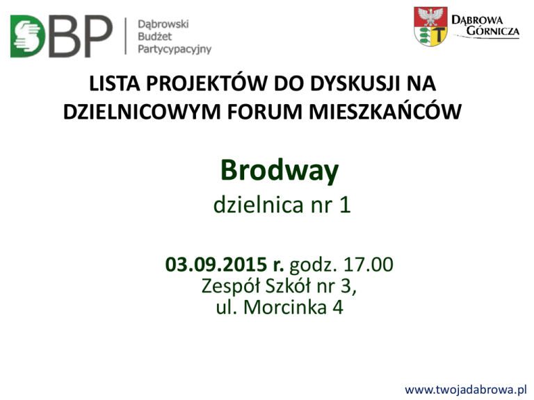 LISTA PROJEKTÓW DO DYSKUSJI NA DZIELNICOWYM FORUM MIESZKAŃCÓW Brodway dzielnica nr 1 03.09.2015 r. godz. 17.00 Zespół Szkół nr 3, ul. Morcinka 4 www.twojadabrowa.pl www.twojadabrowa.pl www.twojadabrowa.pl Projekty realizowane w ramach II edycji Dąbrowskiego Budżetu Partycypacyjnego Nasze otoczenie www.twojadabrowa.pl Podsumowanie weryfikacji i opiniowania wniosków 247 złożonych wniosków •124 wnioski zostały zakwalifikowane jako możliwe do realizacji w założeniu wskazanym przez Wnioskodawcę •42 wnioski zostały uznane jako niemożliwe do wykonania w zaproponowanym kształcie •38 wnioski będą jeszcze rozpatrywane co do ich uściślenia albo modyfikacji •7 wniosków odpadło na etapie weryfikacji formalnej •36 wniosków jest jeszcze w trakcie weryfikacji merytoryczno-prawnej www.twojadabrowa.pl Kwota dla dzielnicy: 307 769,25 zł Liczba złożonych projektów: 4 Łączna kwota złożonych projektów: 568 669,25 zł www.twojadabrowa.pl Autor: Zuzanna Lewsza-Paprocka Tytuł: Wzrastamy w przyszłość Lokalizacja: Zespół Szkół nr 3, ul. Morcinka 4 Koszt szacunkowy: 251 900,00 zł Opis: Projekt zakłada przeprowadzenie modernizacji świetlicy i biblioteki szkolnej (przeprowadzenie prac remontowych, zakup urządzeń multimedialnych tj.: zestaw komputerowy wraz z oprogramowaniem (5 szt.), laptop (2 szt.), tablica multimedialna (2 szt.), rzutnik (2 szt.), zestaw głośników (2 szt.) oraz zakup mebli i książek. Pracownie dostępne będą dla mieszkańców: - raz w tygodniu w godzinach popołudniowych - w ostatnim tygodniu sierpnia, - raz na kwartał prowadzony będzie wolny nabór na zajęcia warsztatowe dot. korzystania z nowoczesnych narzędzi informatycznych oraz zajęć promujących czytelnictwo Opinia: Projekt możliwy do realizacji www.twojadabrowa.pl Lokalizacja: Zespół Szkół nr 3, ul. Morcinka 4 www.twojadabrowa.pl Autor: Ewa Rogacz Miejsca parkingowe dla mieszkańców przy budynkach ul. Tysiąclecia 4 i 6 Tytuł: Lokalizacja: Teren pomiędzy blokami przy ul. Tysiąclecia 4 i Tysiąclecia 6 Koszt szacunkowy: Opis: Projekt zakłada budowę miejsc parkingowych na terenie pomiędzy blokami przy ul. Tysiąclecia 4 i Tysiąclecia 6 Opinia: Projekt niemożliwy do realizacji - na wskazanym obszarze Miejscowy Plan Zagospodarowania Przestrzennego nie dopuszcza budowy miejsc postojowych www.twojadabrowa.pl Lokalizacja: Teren pomiędzy blokami przy ul. Tysiąclecia 4 i Tysiąclecia 6 www.twojadabrowa.pl Autor: Halina Cieślicka Chodnik w miejscu wydeptanej w trawie ścieżki przy ulicy Morcinka Tytuł: Lokalizacja: Ścieżka prowadząca od parkingu przy ul. Morcinka 16 do placu zabaw, siłowni przy ul. Tysiąclecia 6 Koszt szacunkowy: 9 000,00 zł Opis: Projekt zakłada budowę chodnika w miejscu wydeptanej ścieżki (podbudowa z kruszywa, wykonanie nawierzchni z kostki brukowej – ok. 30 m2). Opinia: Projekt możliwy do realizacji www.twojadabrowa.pl Lokalizacja: Ścieżka prowadząca od parkingu przy ul. Morcinka 16 do placu zabaw, siłowni przy ul. Tysiąclecia 6 www.twojadabrowa.pl Autor: Damian Rasała, Grzegorz Guziński Miejsca parkingowe dla mieszkańców osiedla Morcinka Tytuł: Lokalizacja: Teren za blokami ul. Morcinka 8 oraz przy blokach ul. Morcinka 1,3,5,7,9 Koszt szacunkowy: 307 769,25 zł Opis: Projekt zakłada budowę miejsc parkingowych z nawierzchni rozbieralnej. Ilość miejsc zostanie określona projektem wykonawczym. Opinia: Projekt możliwy do realizacji www.twojadabrowa.pl Lokalizacja: Teren za blokami ul. Morcinka 8 oraz przy blokach ul. Morcinka 1,3,5,7,9 * Proponowana przez autorów lokalizacja miejsc postojowych www.twojadabrowa.pl Biuro Organizacji Pozarządowych i Aktywności Obywatelskiej Urząd Miejski w Dąbrowie Górniczej ul. Graniczna 21, tel. 32 295 67 41, 32 295 96 38 [email protected] www.twojadabrowa.pl