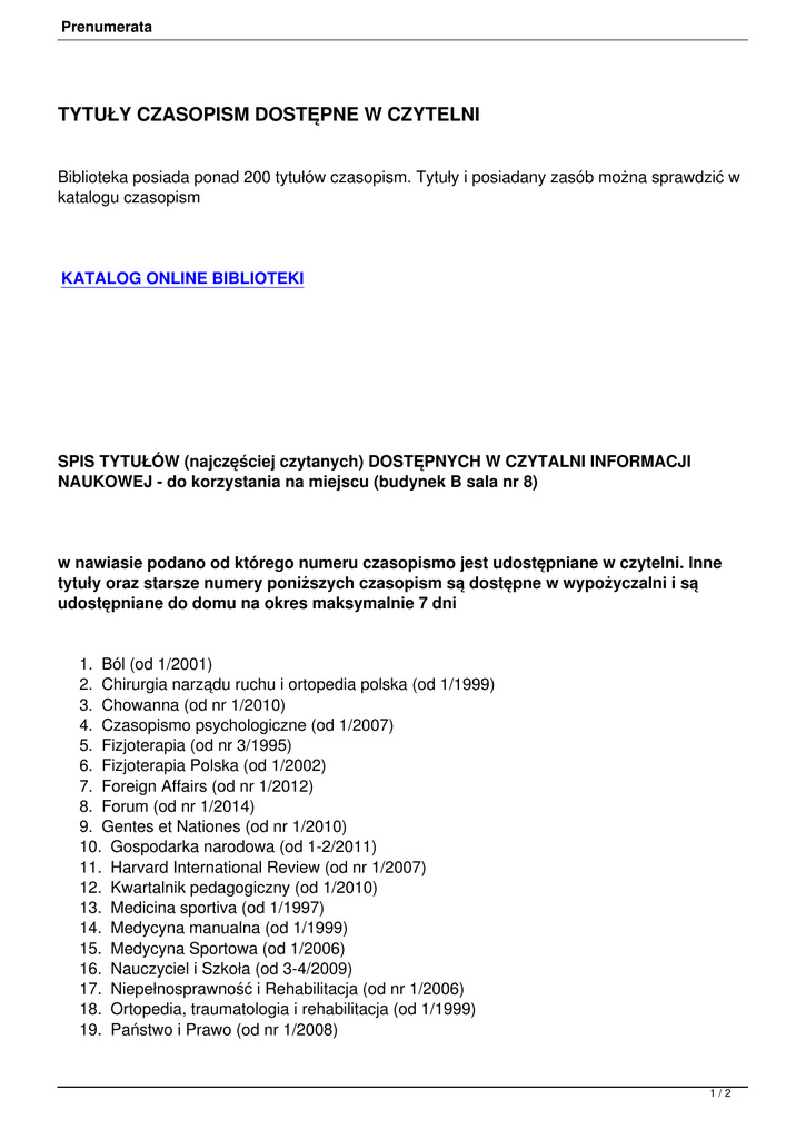 Prenumerata TYTUŁY CZASOPISM DOSTĘPNE W CZYTELNI Biblioteka posiada ponad 200 tytułów czasopism. Tytuły i posiadany zasób można sprawdzić w katalogu czasopism KATALOG ONLINE BIBLIOTEKI SPIS TYTUŁÓW (najczęściej czytanych) DOSTĘPNYCH W CZYTALNI INFORMACJI NAUKOWEJ - do korzystania na miejscu (budynek B sala nr 8) w nawiasie podano od którego numeru czasopismo jest udostępniane w czytelni. Inne tytuły oraz starsze numery poniższych czasopism są dostępne w wypożyczalni i są udostępniane do domu na okres maksymalnie 7 dni 1. Ból (od 1/2001) 2. Chirurgia narządu ruchu i ortopedia polska (od 1/1999) 3. Chowanna (od nr 1/2010) 4. Czasopismo psychologiczne (od 1/2007) 5. Fizjoterapia (od nr 3/1995) 6. Fizjoterapia Polska (od 1/2002) 7. Foreign Affairs (od nr 1/2012) 8. Forum (od nr 1/2014) 9. Gentes et Nationes (od nr 1/2010) 10. Gospodarka narodowa (od 1-2/2011) 11. Harvard International Review (od nr 1/2007) 12. Kwartalnik pedagogiczny (od 1/2010) 13. Medicina sportiva (od 1/1997) 14. Medycyna manualna (od 1/1999) 15. Medycyna Sportowa (od 1/2006) 16. Nauczyciel i Szkoła (od 3-4/2009) 17. Niepełnosprawność i Rehabilitacja (od nr 1/2006) 18. Ortopedia, traumatologia i rehabilitacja (od 1/1999) 19. Państwo i Prawo (od nr 1/2008) 1/2 Prenumerata 20. 21. 22. 23. 24. 25. 26. 27. 28. 29. 30. 31. 32. 33. 34. 35. 36. 37. 38. Politeja (od 1/2004) Polityka (od nr 1/2014) Polityka społeczna (od 1/2010) Polski Przegląd Dyplomatyczny (od1/2009) Postępy rehabilitacji (od nr 1/1995) Praca i zabezpieczenie społeczne (od nr 1/2010) Praca socjalna (od 1/2008) Praktyczna fizjoterapia i rehabilitacja (od 9/2010) Przegląd sądowy (od 1/2010) Rehabilitacja medyczna (od 3/2006) Rehabilitacja w praktyce (od 2/2006) Ruch pedagogiczny (od 1-2/2005) Samorząd terytorialny (od 1/2010) Służba pracownicza (od 1/2010) Sprawy międzynarodowe (od 1/2008) Stosunki międzynarodowe (dwumiesięcznik) (od 1-2/2005) Stosunki międzynarodowe (półrocznik) (od 3-4/2000) Wspólnoty europejskie (od 1/2005) Zeszyty naukowe sądownictwa administracyjnego (od 1/2011) 2/2
