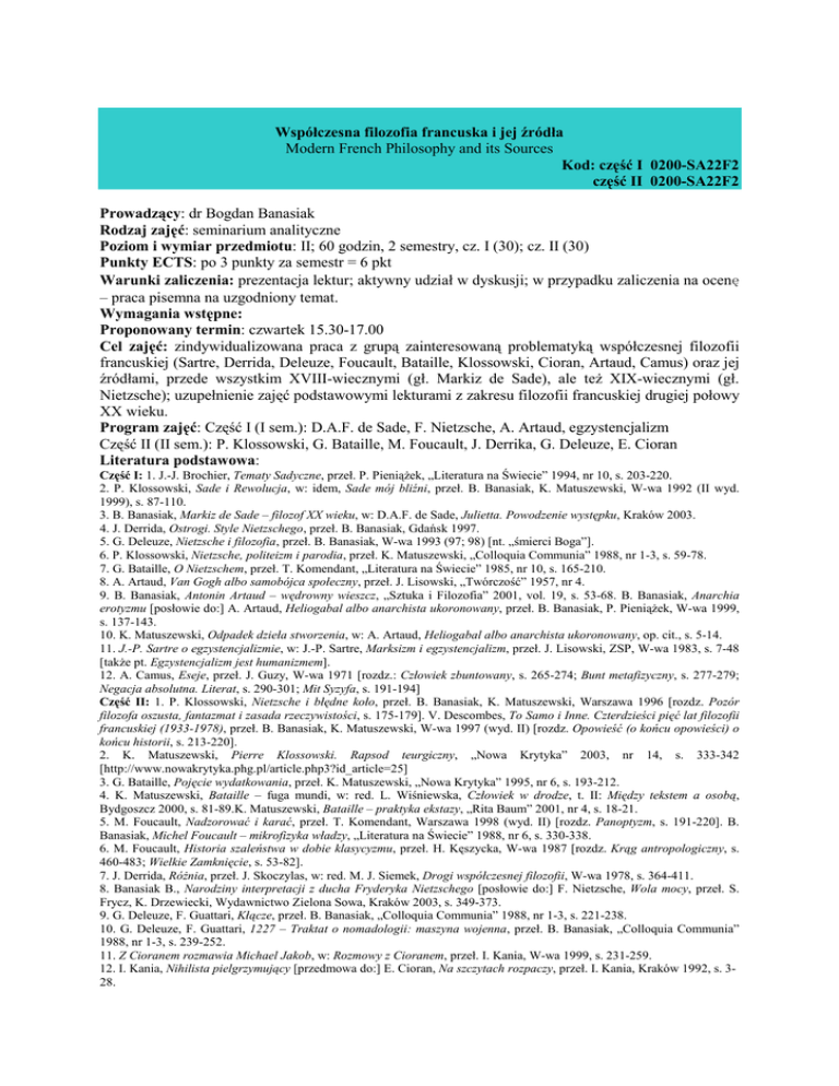 Współczesna filozofia francuska i jej źródła Modern French Philosophy and its Sources Kod: część I 0200-SA22F2 część II 0200-SA22F2 Prowadzący: dr Bogdan Banasiak Rodzaj zajęć: seminarium analityczne Poziom i wymiar przedmiotu: II; 60 godzin, 2 semestry, cz. I (30); cz. II (30) Punkty ECTS: po 3 punkty za semestr = 6 pkt Warunki zaliczenia: prezentacja lektur; aktywny udział w dyskusji; w przypadku zaliczenia na ocenę – praca pisemna na uzgodniony temat. Wymagania wstępne: Proponowany termin: czwartek 15.30-17.00 Cel zajęć: zindywidualizowana praca z grupą zainteresowaną problematyką współczesnej filozofii francuskiej (Sartre, Derrida, Deleuze, Foucault, Bataille, Klossowski, Cioran, Artaud, Camus) oraz jej źródłami, przede wszystkim XVIII-wiecznymi (gł. Markiz de Sade), ale teŜ XIX-wiecznymi (gł. Nietzsche); uzupełnienie zajęć podstawowymi lekturami z zakresu filozofii francuskiej drugiej połowy XX wieku. Program zajęć: Część I (I sem.): D.A.F. de Sade, F. Nietzsche, A. Artaud, egzystencjalizm Część II (II sem.): P. Klossowski, G. Bataille, M. Foucault, J. Derrika, G. Deleuze, E. Cioran Literatura podstawowa: Część I: 1. J.-J. Brochier, Tematy Sadyczne, przeł. P. PieniąŜek, „Literatura na Świecie” 1994, nr 10, s. 203-220. 2. P. Klossowski, Sade i Rewolucja, w: idem, Sade mój bliźni, przeł. B. Banasiak, K. Matuszewski, W-wa 1992 (II wyd. 1999), s. 87-110. 3. B. Banasiak, Markiz de Sade – filozof XX wieku, w: D.A.F. de Sade, Julietta. Powodzenie występku, Kraków 2003. 4. J. Derrida, Ostrogi. Style Nietzschego, przeł. B. Banasiak, Gdańsk 1997. 5. G. Deleuze, Nietzsche i filozofia, przeł. B. Banasiak, W-wa 1993 (97; 98) [nt. „śmierci Boga”]. 6. P. Klossowski, Nietzsche, politeizm i parodia, przeł. K. Matuszewski, „Colloquia Communia” 1988, nr 1-3, s. 59-78. 7. G. Bataille, O Nietzschem, przeł. T. Komendant, „Literatura na Świecie” 1985, nr 10, s. 165-210. 8. A. Artaud, Van Gogh albo samobójca społeczny, przeł. J. Lisowski, „Twórczość” 1957, nr 4. 9. B. Banasiak, Antonin Artaud – wędrowny wieszcz, „Sztuka i Filozofia” 2001, vol. 19, s. 53-68. B. Banasiak, Anarchia erotyzmu [posłowie do:] A. Artaud, Heliogabal albo anarchista ukoronowany, przeł. B. Banasiak, P. PieniąŜek, W-wa 1999, s. 137-143. 10. K. Matuszewski, Odpadek dzieła stworzenia, w: A. Artaud, Heliogabal albo anarchista ukoronowany, op. cit., s. 5-14. 11. J.-P. Sartre o egzystencjalizmie, w: J.-P. Sartre, Marksizm i egzystencjalizm, przeł. J. Lisowski, ZSP, W-wa 1983, s. 7-48 [takŜe pt. Egzystencjalizm jest humanizmem]. 12. A. Camus, Eseje, przeł. J. Guzy, W-wa 1971 [rozdz.: Człowiek zbuntowany, s. 265-274; Bunt metafizyczny, s. 277-279; Negacja absolutna. Literat, s. 290-301; Mit Syzyfa, s. 191-194] Część II: 1. P. Klossowski, Nietzsche i błędne koło, przeł. B. Banasiak, K. Matuszewski, Warszawa 1996 [rozdz. Pozór filozofa oszusta, fantazmat i zasada rzeczywistości, s. 175-179]. V. Descombes, To Samo i Inne. Czterdzieści pięć lat filozofii francuskiej (1933-1978), przeł. B. Banasiak, K. Matuszewski, W-wa 1997 (wyd. II) [rozdz. Opowieść (o końcu opowieści) o końcu historii, s. 213-220]. 2. K. Matuszewski, Pierre Klossowski. Rapsod teurgiczny, „Nowa Krytyka” 2003, nr 14, s. 333-342 [http://www.nowakrytyka.phg.pl/article.php3?id_article=25] 3. G. Bataille, Pojęcie wydatkowania, przeł. K. Matuszewski, „Nowa Krytyka” 1995, nr 6, s. 193-212. 4. K. Matuszewski, Bataille – fuga mundi, w: red. L. Wiśniewska, Człowiek w drodze, t. II: Między tekstem a osobą, Bydgoszcz 2000, s. 81-89.K. Matuszewski, Bataille – praktyka ekstazy, „Rita Baum” 2001, nr 4, s. 18-21. 5. M. Foucault, Nadzorować i karać, przeł. T. Komendant, Warszawa 1998 (wyd. II) [rozdz. Panoptyzm, s. 191-220]. B. Banasiak, Michel Foucault – mikrofizyka władzy, „Literatura na Świecie” 1988, nr 6, s. 330-338. 6. M. Foucault, Historia szaleństwa w dobie klasycyzmu, przeł. H. Kęszycka, W-wa 1987 [rozdz. Krąg antropologiczny, s. 460-483; Wielkie Zamknięcie, s. 53-82]. 7. J. Derrida, RóŜnia, przeł. J. Skoczylas, w: red. M. J. Siemek, Drogi współczesnej filozofii, W-wa 1978, s. 364-411. 8. Banasiak B., Narodziny interpretacji z ducha Fryderyka Nietzschego [posłowie do:] F. Nietzsche, Wola mocy, przeł. S. Frycz, K. Drzewiecki, Wydawnictwo Zielona Sowa, Kraków 2003, s. 349-373. 9. G. Deleuze, F. Guattari, Kłącze, przeł. B. Banasiak, „Colloquia Communia” 1988, nr 1-3, s. 221-238. 10. G. Deleuze, F. Guattari, 1227 – Traktat o nomadologii: maszyna wojenna, przeł. B. Banasiak, „Colloquia Communia” 1988, nr 1-3, s. 239-252. 11. Z Cioranem rozmawia Michael Jakob, w: Rozmowy z Cioranem, przeł. I. Kania, W-wa 1999, s. 231-259. 12. I. Kania, Nihilista pielgrzymujący [przedmowa do:] E. Cioran, Na szczytach rozpaczy, przeł. I. Kania, Kraków 1992, s. 328.