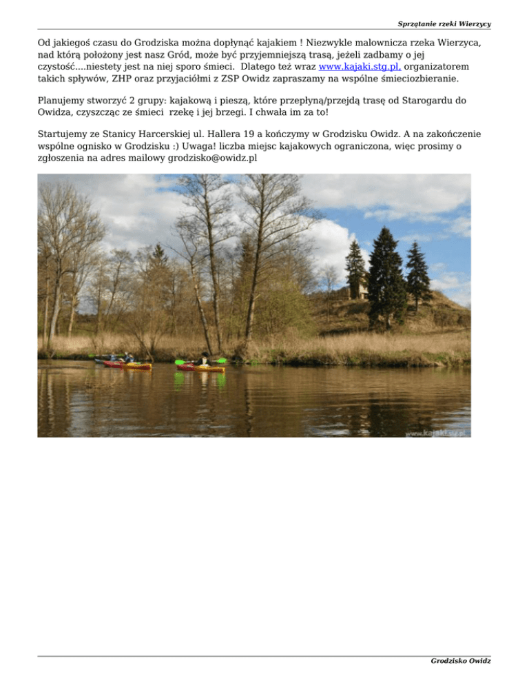 Sprzątanie rzeki Wierzycy Od jakiegoś czasu do Grodziska można dopłynąć kajakiem ! Niezwykle malownicza rzeka Wierzyca, nad którą położony jest nasz Gród, może być przyjemniejszą trasą, jeżeli zadbamy o jej czystość....niestety jest na niej sporo śmieci. Dlatego też wraz www.kajaki.stg.pl, organizatorem takich spływów, ZHP oraz przyjaciółmi z ZSP Owidz zapraszamy na wspólne śmieciozbieranie. Planujemy stworzyć 2 grupy: kajakową i pieszą, które przepłyną/przejdą trasę od Starogardu do Owidza, czyszcząc ze śmieci rzekę i jej brzegi. I chwała im za to! Startujemy ze Stanicy Harcerskiej ul. Hallera 19 a kończymy w Grodzisku Owidz. A na zakończenie wspólne ognisko w Grodzisku :) Uwaga! liczba miejsc kajakowych ograniczona, więc prosimy o zgłoszenia na adres mailowy [email protected] Grodzisko Owidz