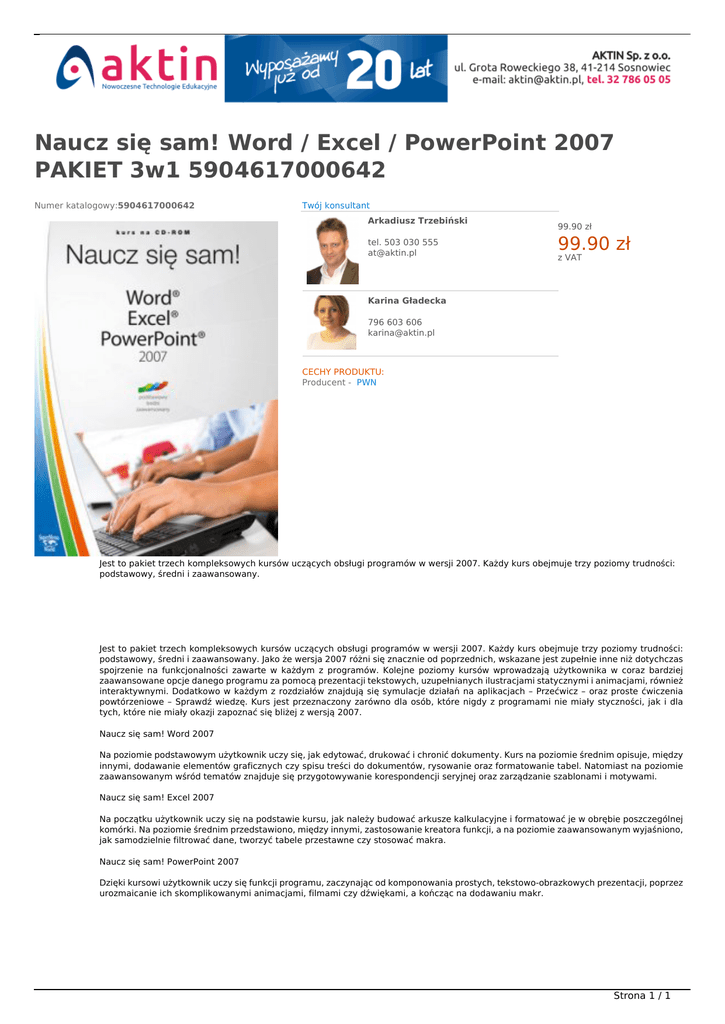 Naucz się sam! Word / Excel / PowerPoint 2007 PAKIET 3w1 5904617000642 Numer katalogowy:5904617000642 Twój konsultant Arkadiusz Trzebiński tel. 503 030 555 [email protected] NOWOŚĆ W OFERCIE 99.90 zł 99.90 zł z VAT Karina Gładecka 796 603 606 [email protected] CECHY PRODUKTU: Producent - PWN Jest to pakiet trzech kompleksowych kursów uczących obsługi programów w wersji 2007. Każdy kurs obejmuje trzy poziomy trudności: podstawowy, średni i zaawansowany. Jest to pakiet trzech kompleksowych kursów uczących obsługi programów w wersji 2007. Każdy kurs obejmuje trzy poziomy trudności: podstawowy, średni i zaawansowany. Jako że wersja 2007 różni się znacznie od poprzednich, wskazane jest zupełnie inne niż dotychczas spojrzenie na funkcjonalności zawarte w każdym z programów. Kolejne poziomy kursów wprowadzają użytkownika w coraz bardziej zaawansowane opcje danego programu za pomocą prezentacji tekstowych, uzupełnianych ilustracjami statycznymi i animacjami, również interaktywnymi. Dodatkowo w każdym z rozdziałów znajdują się symulacje działań na aplikacjach – Przećwicz – oraz proste ćwiczenia powtórzeniowe – Sprawdź wiedzę. Kurs jest przeznaczony zarówno dla osób, które nigdy z programami nie miały styczności, jak i dla tych, które nie miały okazji zapoznać się bliżej z wersją 2007. Naucz się sam! Word 2007 Na poziomie podstawowym użytkownik uczy się, jak edytować, drukować i chronić dokumenty. Kurs na poziomie średnim opisuje, między innymi, dodawanie elementów graficznych czy spisu treści do dokumentów, rysowanie oraz formatowanie tabel. Natomiast na poziomie zaawansowanym wśród tematów znajduje się przygotowywanie korespondencji seryjnej oraz zarządzanie szablonami i motywami. Naucz się sam! Excel 2007 Na początku użytkownik uczy się na podstawie kursu, jak należy budować arkusze kalkulacyjne i formatować je w obrębie poszczególnej komórki. Na poziomie średnim przedstawiono, między innymi, zastosowanie kreatora funkcji, a na poziomie zaawansowanym wyjaśniono, jak samodzielnie filtrować dane, tworzyć tabele przestawne czy stosować makra. Naucz się sam! PowerPoint 2007 Dzięki kursowi użytkownik uczy się funkcji programu, zaczynając od komponowania prostych, tekstowo-obrazkowych prezentacji, poprzez urozmaicanie ich skomplikowanymi animacjami, filmami czy dźwiękami, a kończąc na dodawaniu makr. Strona 1 / 1 Powered by TCPDF (www.tcpdf.org)