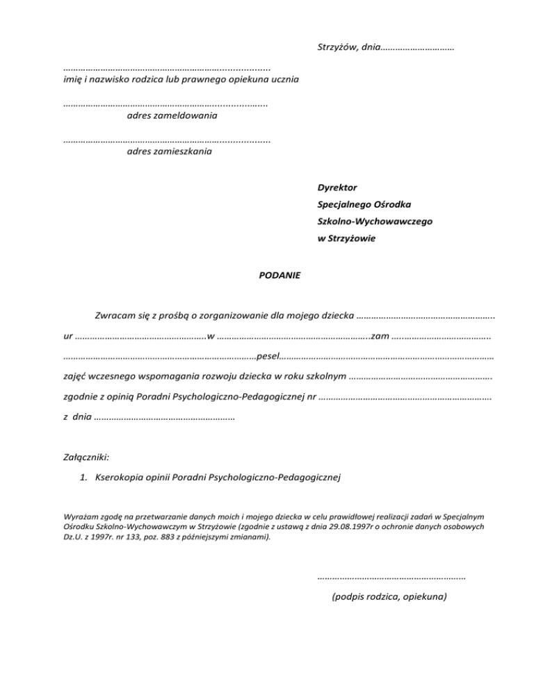 Strzyżów, dnia………………………… ………………………………………………………................... imię i nazwisko rodzica lub prawnego opiekuna ucznia ……………………………………………………..............….... adres zameldowania ………………………………………………………................... adres zamieszkania Dyrektor Specjalnego Ośrodka Szkolno-Wychowawczego w Strzyżowie PODANIE Zwracam się z prośbą o zorganizowanie dla mojego dziecka ……………………………………………….. ur ……………………………………………..w ……………………………………………………..zam …..…………………………….. ……………………………………………………………………pesel…………………………………………………………………………… zajęć wczesnego wspomagania rozwoju dziecka w roku szkolnym …………………………………………………. zgodnie z opinią Poradni Psychologiczno-Pedagogicznej nr ……………………………………………………………. z dnia ………………………………………………… Załączniki: 1. Kserokopia opinii Poradni Psychologiczno-Pedagogicznej Wyrażam zgodę na przetwarzanie danych moich i mojego dziecka w celu prawidłowej realizacji zadań w Specjalnym Ośrodku Szkolno-Wychowawczym w Strzyżowie (zgodnie z ustawą z dnia 29.08.1997r o ochronie danych osobowych Dz.U. z 1997r. nr 133, poz. 883 z późniejszymi zmianami). …………………………………………………… (podpis rodzica, opiekuna)