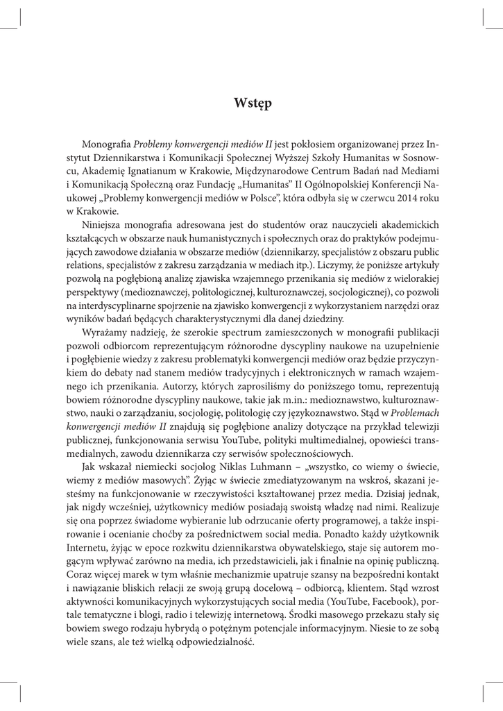 Wstęp Monografia Problemy konwergencji mediów II jest pokłosiem organizowanej przez Instytut Dziennikarstwa i Komunikacji Społecznej Wyższej Szkoły Humanitas w Sosnowcu, Akademię Ignatianum w Krakowie, Międzynarodowe Centrum Badań nad Mediami i Komunikacją Społeczną oraz Fundację „Humanitas” II Ogólnopolskiej Konferencji Naukowej „Problemy konwergencji mediów w Polsce”, która odbyła się w czerwcu 2014 roku w Krakowie. Niniejsza monografia adresowana jest do studentów oraz nauczycieli akademickich kształcących w obszarze nauk humanistycznych i społecznych oraz do praktyków podejmujących zawodowe działania w obszarze mediów (dziennikarzy, specjalistów z obszaru public relations, specjalistów z zakresu zarządzania w mediach itp.). Liczymy, że poniższe artykuły pozwolą na pogłębioną analizę zjawiska wzajemnego przenikania się mediów z wielorakiej perspektywy (medioznawczej, politologicznej, kulturoznawczej, socjologicznej), co pozwoli na interdyscyplinarne spojrzenie na zjawisko konwergencji z wykorzystaniem narzędzi oraz wyników badań będących charakterystycznymi dla danej dziedziny. Wyrażamy nadzieję, że szerokie spectrum zamieszczonych w monografii publikacji pozwoli odbiorcom reprezentującym różnorodne dyscypliny naukowe na uzupełnienie i pogłębienie wiedzy z zakresu problematyki konwergencji mediów oraz będzie przyczynkiem do debaty nad stanem mediów tradycyjnych i elektronicznych w ramach wzajemnego ich przenikania. Autorzy, których zaprosiliśmy do poniższego tomu, reprezentują bowiem różnorodne dyscypliny naukowe, takie jak m.in.: medioznawstwo, kulturoznawstwo, nauki o zarządzaniu, socjologię, politologię czy językoznawstwo. Stąd w Problemach konwergencji mediów II znajdują się pogłębione analizy dotyczące na przykład telewizji publicznej, funkcjonowania serwisu YouTube, polityki multimedialnej, opowieści transmedialnych, zawodu dziennikarza czy serwisów społecznościowych. Jak wskazał niemiecki socjolog Niklas Luhmann – „wszystko, co wiemy o świecie, wiemy z mediów masowych”. Żyjąc w świecie zmediatyzowanym na wskroś, skazani jesteśmy na funkcjonowanie w rzeczywistości kształtowanej przez media. Dzisiaj jednak, jak nigdy wcześniej, użytkownicy mediów posiadają swoistą władzę nad nimi. Realizuje się ona poprzez świadome wybieranie lub odrzucanie oferty programowej, a także inspirowanie i ocenianie choćby za pośrednictwem social media. Ponadto każdy użytkownik Internetu, żyjąc w epoce rozkwitu dziennikarstwa obywatelskiego, staje się autorem mogącym wpływać zarówno na media, ich przedstawicieli, jak i finalnie na opinię publiczną. Coraz więcej marek w tym właśnie mechanizmie upatruje szansy na bezpośredni kontakt i nawiązanie bliskich relacji ze swoją grupą docelową – odbiorcą, klientem. Stąd wzrost aktywności komunikacyjnych wykorzystujących social media (YouTube, Facebook), portale tematyczne i blogi, radio i telewizję internetową. Środki masowego przekazu stały się bowiem swego rodzaju hybrydą o potężnym potencjale informacyjnym. Niesie to ze sobą wiele szans, ale też wielką odpowiedzialność. Wyrażamy nadzieję, że zamieszczone w niniejszym tomie artykuły skłonią Czytelników do dyskusji nad ciągle zagadkową przyszłością mediów w czasach ich nieustannej konwergencji. Piotr Celej Krystian Dudek Magdalena Boczkowska Małgorzata Koszembar-Wiklik