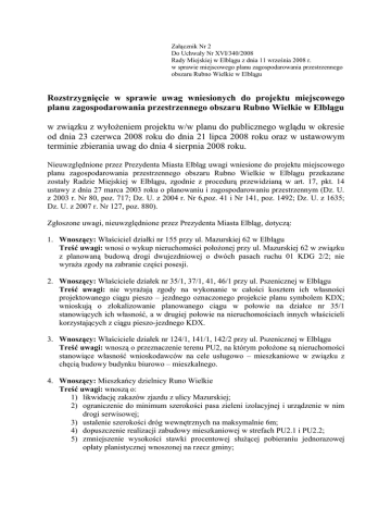 Załącznik Nr 2 Do Uchwały Nr XVI/340/2008 Rady Miejskiej w Elblągu z dnia 11 września 2008 r. w sprawie miejscowego planu zagospodarowania przestrzennego obszaru Rubno Wielkie w Elblągu Rozstrzygnięcie w sprawie uwag wniesionych do projektu miejscowego planu zagospodarowania przestrzennego obszaru Rubno Wielkie w Elblągu w związku z wyłożeniem projektu w/w planu do publicznego wglądu w okresie od dnia 23 czerwca 2008 roku do dnia 21 lipca 2008 roku oraz w ustawowym terminie zbierania uwag do dnia 4 sierpnia 2008 roku. Nieuwzględnione przez Prezydenta Miasta Elbląg uwagi wniesione do projektu miejscowego planu zagospodarowania przestrzennego obszaru Rubno Wielkie w Elblągu przekazane zostały Radzie Miejskiej w Elblągu, zgodnie z procedurą przewidzianą w art. 17, pkt. 14 ustawy z dnia 27 marca 2003 roku o planowaniu i zagospodarowaniu przestrzennym (Dz. U. z 2003 r. Nr 80, poz. 717; Dz. U. z 2004 r. Nr 6,poz. 41 i Nr 141, poz. 1492; Dz. U. z 1635; Dz. U. z 2007 r. Nr 127, poz. 880). Zgłoszone uwagi, nieuwzględnione przez Prezydenta Miasta Elbląg, dotyczą: 1. Wnoszący: Właściciel działki nr 155 przy ul. Mazurskiej 62 w Elblągu Treść uwagi: wnosi o wykup nieruchomości położonej przy ul. Mazurskiej 62 w związku z planowaną budową drogi dwujezdniowej o dwóch pasach ruchu 01 KDG 2/2; nie wyraża zgody na zabranie części posesji. 2. Wnoszący: Właściciele działek nr 35/1, 37/1, 41, 46/1 przy ul. Pszenicznej w Elblągu Treść uwagi: nie wyrażają zgody na wykonanie w całości kosztem ich własności projektowanego ciągu pieszo – jezdnego oznaczonego projekcie planu symbolem KDX; wnioskują o zlokalizowanie planowanego ciągu w połowie na działce nr 35/1 stanowiących ich własność, a w drugiej połowie na nieruchomościach innych właścicieli korzystających z ciągu pieszo-jezdnego KDX. 3. Wnoszący: Właściciele działek nr 124/1, 141/1, 142/2 przy ul. Pszenicznej w Elblągu Treść uwagi: wnoszą o przeznaczenie terenu PU2, na którym położone są nieruchomości stanowiące własność wnioskodawców na cele usługowo – mieszkaniowe w związku z chęcią budowy budynku biurowo – mieszkalnego. 4. Wnoszący: Mieszkańcy dzielnicy Runo Wielkie Treść uwagi: wnoszą o: 1) likwidację zakazów zjazdu z ulicy Mazurskiej; 2) ograniczenie do minimum szerokości pasa zieleni izolacyjnej i urządzenie w nim drogi serwisowej; 3) ustalenie szerokości dróg wewnętrznych na maksymalnie 6m; 4) dopuszczenie realizacji zabudowy mieszkaniowej w strefach PU2.1 i PU2.2; 5) zmniejszenie wysokości stawki procentowej służącej pobieraniu jednorazowej opłaty planistycznej wnoszonej na rzecz gminy; 6) wykup terenu przeznaczonego na poszerzenie ul. Mazurskiej i pasa zieleni izolacyjnej lub przyznanie nieruchomości zamiennych – w przypadku niespełnienia powyższych żądań. 5. Wnoszący: Właściciele działki nr 102 przy ul. Słonecznikowej w Elblągu Treść uwagi: żądają przeznaczenia działki stanowiącej ich własność na cele mieszkaniowe. 6. Wnoszący: Właściciel działki nr 157/1 przy ul. Mazurskiej w Elblągu Treść uwagi: wnioskodawca zgłasza następujące uwagi dotyczące całego obszaru objętego planem: 1) brak systemu zabezpieczenia przed zalaniem obszaru objętego planem; 2) brak rezerwy terenowej pod sieć ciepłowniczą, sieć z ciepłą wodą, sieć gazowniczą; 3) umieszczenie kolektora ściekowego wzdłuż ul. Pszenicznej tak, że ścieki z zabudowań przy ul. Mazurskiej będą płynęły pod górę w stronę ul. Pszenicznej, co gwarantuje ciągłe awarie; 4) brak przy ul. Mazurskiej zatok dla autobusów, ogólnodostępnych miejsc postojowych wzdłuż ulic Mazurskiej i Pszenicznej (na terenach miejskich); 5) wysokość jednorazowej opłaty wnoszonej na rzecz gminy jest stanowczo za wysoka; 6) pozostawienie domów mieszkalnych w strefie zabudowy produkcyjnej (PU1) to tworzenie getta w Europie XXIw.; 7. Wnoszący: Właściciel działki nr 44/2 przy ul. Pszenicznej w Elblągu Treść uwagi: Nie wyrażają zgody na budowę drogi 02 KDD1/2 o zaproponowanych parametrach, pozbawiającej właścicieli części nieruchomości. Rada Miejska w Elblągu po przeanalizowaniu powyższych uwag, wniesionych do projektu miejscowego planu zagospodarowania przestrzennego obszaru Rubno Wielkie w Elblągu rozstrzyga, iż nie uwzględnia się ich w planie. PRZEWODNICZĄCY Rady Miejskiej w Elblągu Janusz NOWAK UZASADNIENIE rozstrzygnięć zawartych w Załączniku Nr 2 Rozstrzygnięcie Rady Miejskiej w Elblągu w sprawie uwag wniesionych do projektu miejscowego planu zagospodarowania przestrzennego obszaru Rubno Wielkie w Elblągu uzasadnia się następująco: Ad.1 Zapisy ustawy o planowaniu i zagospodarowaniu przestrzennym nie mówią o obowiązku wprowadzania do ustaleń miejscowego planu zagospodarowania przestrzennego zapisu o obowiązku wykupu nieruchomości, które nie są przeznaczone przez miasto na cele publiczne. Do żądania wykupu nieruchomości w przypadku ograniczenia sposobu korzystania z nieruchomości stosuje się zasady i tryb określone w ustawie 21 sierpnia 1997 r. o gospodarce nieruchomościami (Dz..U. z 2000 r. Nr 46, poz. 543). W miejsce istniejących terenów zabudowy mieszkaniowej, upraw rolniczych narażonych na uciążliwości ze strony oczyszczalni ścieków i ZUO projektanci planu miejscowego obszaru Rubna Wielkiego zaplanowali przeznaczenie ich na tereny obiektów produkcyjnych, składów i magazynów oraz zabudowy usługowej. Mieszkańcy i właściciele nieruchomości mają w związku z tym szansę sprzedaży nieruchomości na cele produkcyjne lub przekwalifikowanie się z produkcji rolnej na produkcyjną. Droga 01 KDG2/2 zajmuje tylko fragmenty nieruchomości sąsiadujących z nią, które z uwagi na przeznaczenie na cel publiczny zostaną wykupione przed rozpoczęciem realizacji inwestycji. W związku z planowaną przebudową ul. Mazurskiej w drogę kategorii G planuje się równocześnie budowę drogi serwisowej