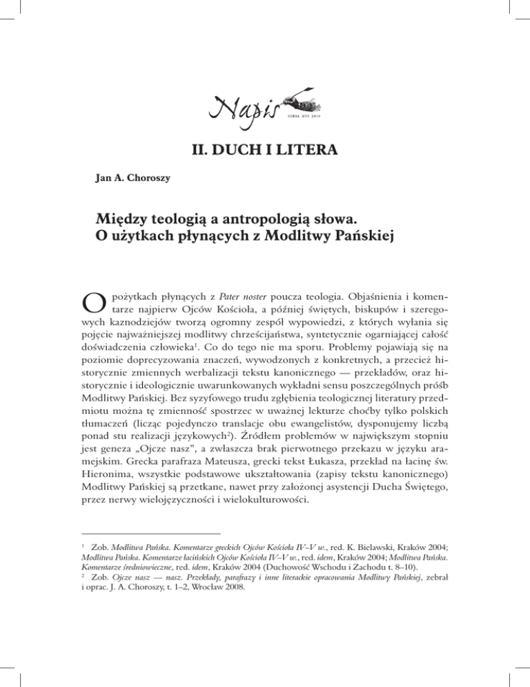 II. DUCH I LITERA Jan A. Choroszy Między teologią a antropologią słowa. O użytkach płynących z Modlitwy Pańskiej O pożytkach płynących z Pater noster poucza teologia. Objaśnienia i komentarze najpierw Ojców Kościoła, a później świętych, biskupów i szeregowych kaznodziejów tworzą ogromny zespół wypowiedzi, z których wyłania się pojęcie najważniejszej modlitwy chrześcijaństwa, syntetycznie ogarniającej całość doświadczenia człowieka1. Co do tego nie ma sporu. Problemy pojawiają się na poziomie doprecyzowania znaczeń, wywodzonych z konkretnych, a przecież historycznie zmiennych werbalizacji tekstu kanonicznego — przekładów, oraz historycznie i ideologicznie uwarunkowanych wykładni sensu poszczególnych próśb Modlitwy Pańskiej. Bez syzyfowego trudu zgłębienia teologicznej literatury przedmiotu można tę zmienność spostrzec w uważnej lekturze choćby tylko polskich tłumaczeń (licząc pojedynczo translacje obu ewangelistów, dysponujemy liczbą ponad stu realizacji językowych2). Źródłem problemów w największym stopniu jest geneza „Ojcze nasz”, a zwłaszcza brak pierwotnego przekazu w języku aramejskim. Grecka parafraza Mateusza, grecki tekst Łukasza, przekład na łacinę św. Hieronima, wszystkie podstawowe ukształtowania (zapisy tekstu kanonicznego) Modlitwy Pańskiej są przetkane, nawet przy założonej asystencji Ducha Świętego, przez nerwy wielojęzyczności i wielokulturowości. Zob. Modlitwa Pańska. Komentarze greckich Ojców Kościoła IV–V w., red. K. Bielawski, Kraków 2004; Modlitwa Pańska. Komentarze łacińskich Ojców Kościoła IV–V w., red. idem, Kraków 2004; Modlitwa Pańska. Komentarze średniowieczne, red. idem, Kraków 2004 (Duchowość Wschodu i Zachodu t. 8–10). 2 Zob. Ojcze nasz — nasz. Przekłady, parafrazy i inne literackie opracowania Modlitwy Pańskiej, zebrał i oprac. J. A. Choroszy, t. 1–2, Wrocław 2008. 1 44 Jan A. Choroszy W jeszcze większej skali wskazane problemy występują w literackich opracowaniach, które można nazwać wyznawczymi. Warto przypomnieć, że tradycja parafrazowania Pater noster sięga do antyku chrześcijańskiego (Juwenkus), bardzo żywo rozwijała się w średniowieczu, a od XVI wieku była i ciągle jest kultywowana w dwóch odmianach: poetyckiej (wierszowej) i pieśniowej (melicznej). W tym, pobożnym, nurcie europejskiej tradycji we wszystkich stosowanych formach (utwory krótkie o charakterze mnemotechnicznym, dłuższe i bardzo długie poematy, wypełnione uczoną refleksją teologiczną lub swobodniejszym rozmyślaniem, dialogi renesansowe, barokowe cykle medytacyjne, hymny, wiersze i cykle liryczne) parafraza Modlitwy Pańskiej mieści się w ramach — by skorzystać ze współczesnego określenia — dozwolonego użytku: jest kontemplacją lub objaśnieniem, wiedzie do przeżycia i zrozumienia. Jak w wypadku dzieł teologicznych, tak i tu można mówić o nagminnym zestawianiu tekstu kanonicznego ze szczególną, indywidualną sytuacją modlitewną czy egzystencjalną, czego skutkiem bywa „odnowienie słowa” (termin Jana Błońskiego), lecz w istocie mamy do czynienia ze słowa potwierdzeniem, z odwołaniem do jego autorytetu, wartości, właściwej mu transcendencji. Na granicy wskazanego, czyli uprawnionego użytku lokują się rozmaite teksty bluźniercze, ponieważ zaledwie w niektórych można odnaleźć tę samą postawę epistemiczną: odwołanie do kanonicznego tekstu „Ojcze nasz” prowokuje autorów do konfrontacji z osobistym (lub grupowym) obrazem świata, a spostrzeżony dysonans wyraża się w serii pytajników (wzmocnionych wykrzyknikami) albo zaprzeczeń. Najlepiej demonstruje tę postawę, i ten mechanizm, całkiem współczesny tekst Oriany Fallaci z Nic, i niech tak się stanie (Niente e cosi` sia): Ojcze nasz, który jesteś w niebie, rzezi naszej codziennej daj nam dzisiaj, zbaw nas od wszelkiego miłosierdzia, wszelkiej miłości i wszystkiego, czego nas nauczył syn twój, bo to i tak zawsze mieliśmy za nic, mamy za nic i mieć będziemy za nic, i niech tak się stanie3. Zupełnie inne postawy, motywacje i funkcje są właściwe dla drugiego, doczesnego, nurtu tradycji. W nim mieszczą się teksty, które w literaturze przedmiotu określano najpierw jako parodie, a obecnie — trawestacje4. Ze średniowiecza pochodzą najstarsze zachowane utwory satyryczne, które wykorzystują retoryczny schemat Modlitwy Pańskiej w konstrukcjach bardzo dalekich od teologii. Do najpopularniejszych należa- Ibidem, t. 1, s. 902–903 (tłum. W. Soliński). Zob. F. Novati, La parodia sacra nelle letterature moderne, w: idem, Studi critici e letterari, Torino 1889, s. 177–310; P. Lehmann, Die Parodie im Mittelalter, Stuttgart 1963; E. Ilvonen, Parodies de thèmes pieux dans la poésie française du Moyen Âge. Pater — Credo — Ave Maria — Laetabundus, Genève 1975; M. Bachtin, Z prehistorii słowa powieściowego, w: idem, Problemy literatury i estetyki, tłum. W. Grajewski, Warszawa 1982, s. 526–536. 3 4 Między teologią a antropologią słowa. O użytkach płynących z Modlitwy Pańskiej 45 ły łacińskie pacierze pijackie, nierzadko wkomponowane w większe struktury literackie (msze), a najjaskrawszym przykładem skontrastowania Słowa ze słowem wydaje się starofrancuski Pacierzyk Syfilityków ze skargą na medyków (La Patenostre des Verollez avec une complaincte contre les medecins). W najdawniejszych takich opracowaniach Pa ter noster przewijały się motywy społecznej i stanowej niesprawiedliwości oraz akcenty antyklerykalne, zaktualizowane na początku XVII wieku w postaci pacierzy antyjezuickich. Trawestacje okazywały się szczególnie produktywne w okresach napięć i konfliktów religijnych, a zwłaszcza wtedy, kiedy w tle istniał poważny spór polityczny. Albo odwrotnie. Juliusz Nowak–Dłużewski zwrócił przed laty uwagę na pojedynek trawestatorów, reprezentujących dwa stronnictwa polityczne w okr
