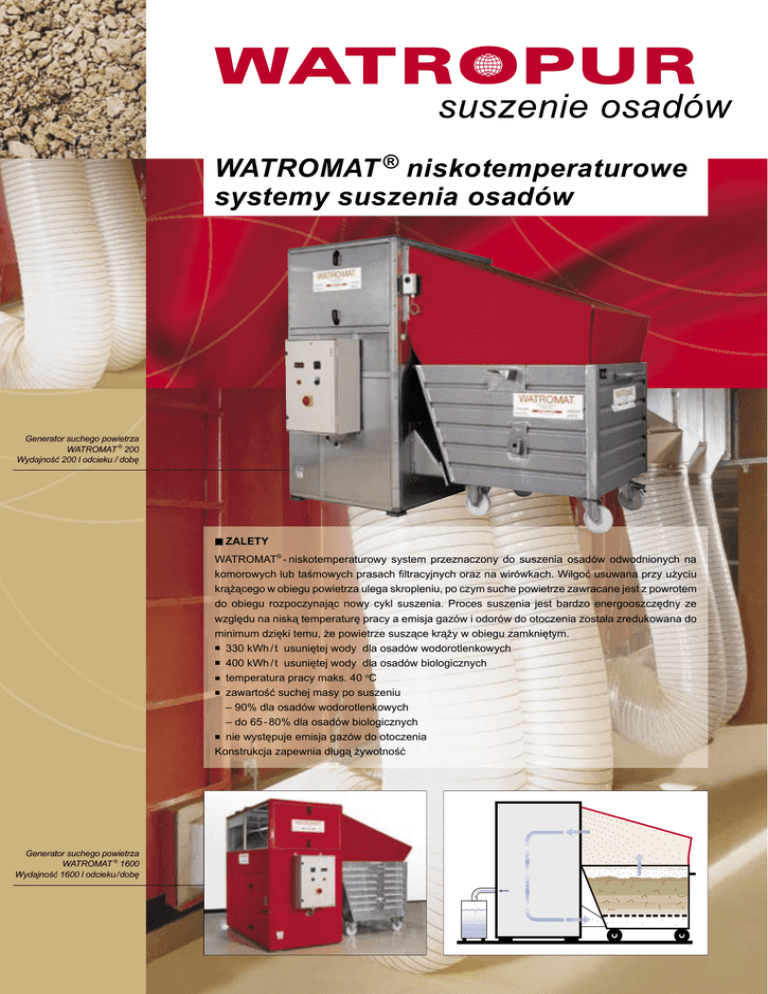 WATROMAT ® niskotemperaturowe systemy suszenia osadów Generator suchego powietrza WATROMAT ® 200 Wydajność 200 l odcieku / dobę ZALETY WATROMAT® - niskotemperaturowy system przeznaczony do suszenia osadów odwodnionych na komorowych lub taśmowych prasach filtracyjnych oraz na wirówkach. Wilgoć usuwana przy użyciu krążącego w obiegu powietrza ulega skropleniu, po czym suche powietrze zawracane jest z powrotem do obiegu rozpoczynając nowy cykl suszenia. Proces suszenia jest bardzo energooszczędny ze względu na niską temperaturę pracy a emisja gazów i odorów do otoczenia została zredukowana do minimum dzięki temu, że powietrze suszące krąży w obiegu zamkniętym. 330 kWh / t usuniętej wody dla osadów wodorotlenkowych 400 kWh / t usuniętej wody dla osadów biologicznych temperatura pracy maks. 40 oC zawartość suchej masy po suszeniu – 90% dla osadów wodorotlenkowych – do 65 - 80% dla osadów biologicznych nie występuje emisja gazów do otoczenia Konstrukcja zapewnia długą żywotność WATROMAT ® Generator suchego powietrza WATROMAT ® 1600 Wydajność 1600 l odcieku / dobę Linia suszenia osadu WATROMAT® została skonstruowana i wyprodukowana przez szwajcarską firmę WATROPUR. Zarówno koszty inwestycyjne jak i eksploatacyjne są w technologii WATROMAT® niższe od 50 do 70% od kosztów w technologiach wysokotemperaturowych. Doskonale sprawdza się przy suszeniu osadów biologicznych. Typ Wydajność Moc l/dobę kW [cale] WATROMAT ® 50 50 l 1.6 0.67 / 0.98 / 1.44 WATROMAT ® 100 100 l 2.6 0.67 / 0.98 / 1.44 WATROMAT ® 200 200 l 4.6 0.98 / 1.29 / 2.04 WATROMAT ® 400 400 l 7.0 0.98 / 1.29 / 2.04 WATROMAT ® 600 600 l 9.9 1.29 / 1.91 / 2.04 WATROMAT ® 800 800 l 12.6 1.29 / 1.91 / 2.04 WATROMAT ® 1200 1200 l 20 1.29 / 2.67 / 2.04 WATROMAT ® 1600 1600 l 26 1.29 / 2.67 / 2.04 WATROMAT ® 2000 2000 l 33 1.60 / 3.90 / 2.04 WATROMAT ® 2400 2400 l 40 1.60 / 3.90 / 2.04 WATROMAT ® 3000 3000 l 50 1.63 / 4.50 / 2.79 WATROMAT ® 3600 3600 l 60 1.63 / 5.12 / 2.79 WATROMAT ® 4800 4800 l 80 1.94 / 5.74 / 3.20 WATROMAT ® 6000 6000 l 100 1.94 / 6.36 / 3.20 WATROMAT ® 8000 8000 l 133 1.94 / 6.36 / 3.20 WATROMAT ® 10000 10 000 l 166 2.25 / 5.66 / 3.20 WATROMAT ® 15000 15 000 l 250 2.25 / 6.28 / 3.20 WATROMAT ® 20000 20 000 l 333 2.25 / 6.90 / 3.20 WATROMAT ® 25000 25 000 l 420 2.25 / 7.52 / 3.20 WATROMAT ® 30000 30 000 l 500 2.25 / 8.14 / 3.20 generatora Generator suchego powietrza WATROMAT® 6000 z kontenerem 30 m3 Generator suchego powietrza WATROMAT® 20000 z tunelem suszarniczym do pracy ciągłej Wydajność 20000l odcieku / dobę WATROPUR AG suszenie osadów Eichzun 5 3800 Unterseen /Interlaken Switzerland Tel. 0041 33 823 47 57 Fax 0041 33 823 47 58 [email protected] www.watropur.ch O FIRMIE Firma WATROPUR założona w 1992 produkuje niskotemperaturowe linie do suszenia osadow przemysłowych i biologicznych. W ciągu pierwszych 10 lat działalności zainstalowanych zostało ponad 450 linii suszących w 30 krajach świata. Wymiary (d 3 / szer / wys) Häner & Partner, Thun/Switzerland 12.02 O URZĄDZENIU