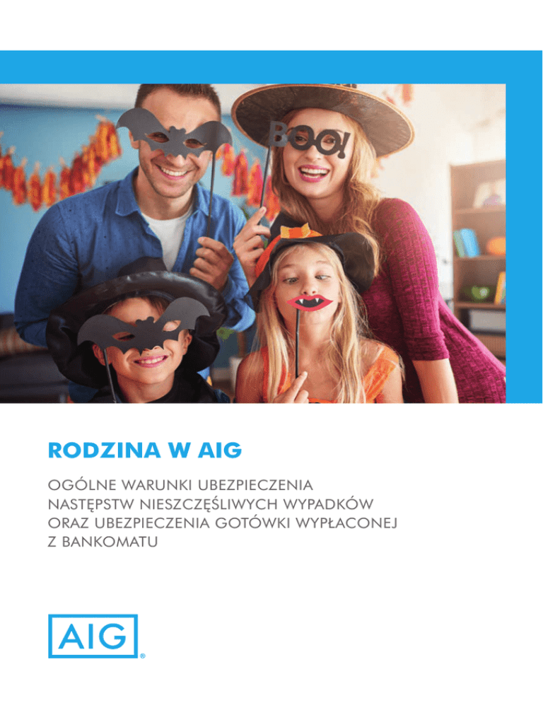 RODZINA W AIG OGÓLNE WARUNKI UBEZPIECZENIA NASTĘPSTW NIESZCZĘŚLIWYCH WYPADKÓW ORAZ UBEZPIECZENIA GOTÓWKI WYPŁACONEJ Z BANKOMATU Informacje na temat wypłaty świadczeń oraz ograniczeń i wyłączeń w Twojej ochronie ubezpieczeniowej zawarte są w następujących miejscach w poniższym dokumencie: § 2. Zawieranie umowy ubezpieczenia § 3. Rozpoczęcie i zakończenie ochrony ubezpieczeniowej § 4. Zdarzenia objęte ubezpieczeniem § 5. Definicje: beneficjent, dzień początku ubezpieczenia, nieszczęśliwy wypadek, rozbój (rabunek), uszkodzenie ciała § 6. Ubezpieczenie następstw nieszczęśliwych wypadków pkt 6.1. Warunki wypłaty z tytułu trwałego inwalidztwa pkt 6.2. Wyłączenia odpowiedzialności pkt 6.3. Ograniczenia § 7. Ubezpieczenie gotówki wypłaconej z bankomatu pkt 7.1. Warunki pkt 7.2. Wyłączenia odpowiedzialności pkt 7.3. Obowiązki Ubezpieczającego w przypadku zdarzenia OGÓLNE WARUNKI UBEZPIECZENIA NASTĘPSTW NIESZCZĘŚLIWYCH WYPADKÓW ORAZ UBEZPIECZENIA GOTÓWKI WYPŁACONEJ Z BANKOMATU 1. WPROWADZENIE Niniejsze ogólne warunki ubezpieczenia dotyczą umowy ubezpieczenia zawartej pomiędzy Tobą a AIG jako Ubezpieczycielem. Osobom wskazanym w polisie zobowiązujemy się zapewnić ochronę ubezpieczeniową określoną w niniejszych ogólnych warunkach ubezpieczenia (OWU) oraz polisie. Polisa oraz niniejsze OWU wskazują zakres ochrony ubezpieczeniowej oraz warunki mające zastosowanie do umowy ubezpieczenia. Zapoznaj się z treścią polisy i niniejszych OWU oraz upewnij się, że zakres ochrony ubezpieczeniowej jest dla Ciebie zrozumiały. 2. ZAWIERANIE UMOWY UBEZPIECZENIA Możesz zawrzeć umowę ubezpieczenia, jeśli masz ukończone 18 lat a nie ukończyłeś 69 lat. Umowa ubezpieczenia zostaje zawarta z dniem wskazanym w polisie. Umowa zostaje zawarta na czas nieokreślony. Zawarcie umowy ubezpieczenia jest dobrowolne. 3. ROZPOCZĘCIE I ZAKOŃCZENIE OCHRONY UBEZPIECZENIOWEJ Ochrona ubezpieczeniowa rozpocznie się w dniu początku ubezpieczenia określonym w polisie. Ubezpieczenie zapewnia ochronę ubezpieczeniową ważną na całym świecie. Ochrona ubezpieczeniowa pozostaje nieprzerwanie w mocy i wygasa wyłącznie w jednym ze wskazanych poniżej przypadków, w zależności od tego, który z nich wystąpi wcześniej: a)w razie braku zapłaty składki po uprzednim wezwaniu do jej zapłaty – w terminie 7 dni, zgodnie z pkt 8 niniejszych OWU; b)w przypadku ukończenia przez Ciebie 70 lat – z ostatnim dniem okresu ubezpieczenia, za który należna była składka i w którym przypadły Twoje 70. urodziny; c) w razie Twojej rezygnacji – z dniem wskazanym w pkt 9 niniejszych OWU; d) w dniu Twojej śmierci. W przypadku objęcia ochroną ubezpieczeniową współmałżonka lub partnera ochrona ubezpieczeniowa wygasa w stosunku do tych osób: a)w przypadku ukończenia przez współmałżonka lub partnera 70 lat – z ostatnim dniem okresu ubezpieczenia, za który należna była składka i w którym przypadły 70. urodziny współmałżonka lub partnera; RODZINA W AIG • OGÓLNE WARUNKI UBEZPIECZENIA NASTĘPSTW NIESZCZĘŚLIWYCH WYPADKÓW ORAZ UBEZPIECZENIA GOTÓWKI WYPŁACONEJ Z BANKOMATU RODZINA W AIG 1 b)kiedy poinformujesz nas na piśmie o wyłączeniu współmałżonka lub partnera z ochrony ubezpieczeniowej – z ostatnim dniem okresu ubezpieczenia, za który należna była składka i w którym otrzymaliśmy od Ciebie informację o wyłączeniu współmałżonka lub partnera z ochrony ubezpieczeniowej. Twoje dziecko może być objęte ochroną ubezpieczeniową w ramach wybranego planu (indywidualnego z dzieckiem bądź rodzinnego), o ile ukończyło 6. miesiąc życia i nie ukończyło 18 lat. 4. ZDARZENIA OBJĘTE UBEZPIECZENIEM AIG wypłaci świadczenie w wysokości określonej w polisie wówczas, gdy niezależnie od miejsca pobytu na świecie Ubezpieczony ulegnie nieszczęśliwemu wypadkowi, w wyniku którego w ciągu dwóch lat, niezależnie od innych przyczyn, nastąpi śmierć, trwałe inwalidztwo, trwałe inwalidztwo całkowite lub uszkodzenie ciała wymienione w sekcji B tabeli sum ubezpieczenia. W przypadku uszkodzeń ciała określonych w sekcji B tabeli sum ubezpieczenia, trwałego inwalidztwa (sekcja C tabeli sum ubezpieczenia), trwałego inwalidztwa całkowitego (sekcja D tabeli sum ubezpieczenia) wypłata świadczenia przysługuje Tobie. W przypadku śmierci Ubezpieczonego wypłata świadczenia z tytułu śmierci wskutek nieszczęśliwego wypadku oraz dodatkowe świadczenie przysługują beneficjentowi. W przypadku gdy zdarzenie objęte ubezpieczeniem dotyczy dziecka, należne świadczenie wypłacimy Tobie, jeżeli dziecko pozostaje pod Twoją władzą rodzicielską, lub opiekunowi prawnemu dziecka, jeżeli dziecko nie pozostaje pod Twoją władzą rodzicielską. 5. DEFINICJE W niniejszych OWU, tabeli sum ubezpieczenia i polisie poniższe terminy mają następujące znaczenie: beneficjent – osoba uprawniona do otrzymania świadczenia z tytułu śmierci Ubezpieczonego; świadczenie przysługuje współmałżonkowi, chyba że Ubezpieczony pozostaje w nieformalnym związku – w takim przypadku świadczenie przysługuje partnerowi; w razie braku współmałżonka/partnera świadczenie zostanie wypłacone spadkobiercom ustawowym Ubezpieczonego, chyba że Ubezpieczony postanowi inaczej i na piśmie powiadomi o tym AIG; data płatności składki – wskazana w polisie data wymagalności pierwszej składki i daty wymagalności kolejnych składek; daty wymagalności kolejnych składek – przypadają w kolejnych miesiącach w dniach, które datą odpowiadają dacie wymagalności pierwszej składki, a gdyby takiego dnia w danym miesiącu nie było – w ostatnim dniu tego miesiąca; dodatkowe świadczenie – dodatkowe świadczenie określone w sekcji E tabeli sum ubezpieczenia, wypła- cane przez AIG beneficjentowi, którego celem jest zrekompensowanie kosztów pogrzebu Ubezpieczonego; dzień początku ubezpieczenia – wskazany w polisie pi