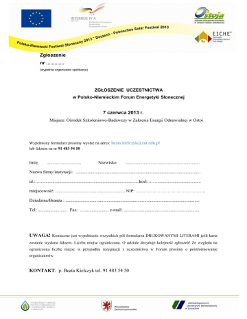 Zgłoszenie nr ............. (wypełnia organizator spotkania) ZGŁOSZENIE UCZESTNICTWA w Polsko-Niemieckim Forum Energetyki Słonecznej 7 czerwca 2013 r. Miejsce: Ośrodek Szkoleniowo-Badawczy w Zakresie Energii Odnawialnej w Ostoi Wypełniony formularz prosimy wysłać na adres: [email protected] lub faksem na nr 91 483 54 50 Imię .............................. Nazwisko ................................................................. Nazwa firmy/instytucji: ............................................................................................................. ul.:….......................................................................................kod:.……...................................... miejscowość: ............................................................. NIP: ………………………………………. Dziedzina/Branża : ..................................................................................................................... Tel: .......................... Fax: ......................... e-mail: .................................................................. UWAGA! Konieczne jest wypełnienie wszystkich pól formularza DRUKOWANYMI LITERAMI jeśli karta zostanie wysłana faksem. Liczba miejsc ograniczona. O udziale decyduje kolejność zgłoszeń! Ze względu na ograniczoną liczbę miejsc w przypadku rezygnacji z uczestnictwa w Forum prosimy o poinformowanie organizatorów. KONTAKT: p. Beata Kielczyk tel. 91 483 54 50