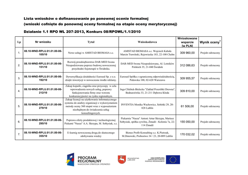 Lista wniosków o dofinansowanie po ponownej ocenie formalnej (wnioski cofnięte do ponownej oceny formalnej na etapie oceny merytorycznej) Działanie 1.1 RPO WL 207-2013, Konkurs 08/RPOWL/1.1/2010 Wnioskowane wsparcie Wynik oceny1 [w PLN] Lp Nr wniosku Tytuł Wnioskodawca 1. 08.10-WND-RPLU.01.01.00-06105/10 Nowe usługi w AMISTAD BIOMASA s.c. AMISTAD BIOMASA s.c. Wojciech Kabała Marcin Trawiński, Rejowiecka 183, 22-100 Chełm 309 960,00 Projekt odrzucony 2. 08.10-WND-RPLU.01.01.00-06151/10 Rozwój przedsiębiorstwa DAR-MED Iwona Niespodziewana poprzez budowę nowoczesnej przychodni fizjoterapii w Świdniku. DAR-MED Iwona Niespodziewana, Al. Lotników Polskich 35, 21-040 Świdnik 312 086,63 Projekt odrzucony 3. 08.10-WND-RPLU.01.01.00-06192/10 Dywersyfikacja działalności Eurosed Sp. z o.o. dzięki inwestycji w nowoczesne środki reklamy. Eurosed Spółka z ograniczoną odpowiedzialnością, Puławska 100, 02-620 Warszawa 309 955,57 Projekt odrzucony 4. 08.10-WND-RPLU.01.01.00-06212/10 Inga Chlebek-Bielecka "Zakład Przeróbki Drewna", Bednarzówka 33, 21-211 Dębowa Kłoda 309 810,00 Projekt odrzucony 5. 08.10-WND-RPLU.01.01.00-06279/10 INVENTIA Monika Wachowicz, Sobótki 29, 20828 Lublin 61 506,00 Projekt odrzucony 6. Piekarnia "Nasza" Antoni Artur Skrzypa, Mariusz 08.10-WND-RPLU.01.01.00-06Poprawa oferty produktowej i technologicznej Sołtysiuk, spółka cywilna, śmudź - Kolonia 7a, 22Piekarni "Nasza" A.A. Skrzypa, M. Sołtysiuk, s.c. 295/10 114 śmudź 155 050,00 Projekt odrzucony 7. 08.10-WND-RPLU.01.01.00-06355/10 170 032,02 Projekt odrzucony Zakup koparki, ciągnika oraz przyczepy w celu wprowadzenia nowych usług, poprawy funkcjonowania firmy oraz wzrostu konkurencyjności na rynku regionalnym. Zakup licencji na uŜytkowanie informatycznego systemu do analizy organizacji z wykorzystaniem metody oceny 360 stopni wraz z wyposaŜeniem niezbędnym do świadczenia usług konsultingowych. E-learnig nowoczesną drogą do skutecznego zdobywania wiedzy Biznes Profit Konsulting s.c. K.Pietrzak, M.Dmowski, Probostwo 34 / 23, 20-089 Lublin 08.10-WND-RPLU.01.01.00-06367/10 „Budowa pakietu franczyzowego z innowacyjnymi systemami – fundamentem wysokiej konkurencyjności Marant sp. z o.o.” MARANT SPÓŁKA Z OGRANICZONĄ ODPOWIEDZIALNOŚCIĄ, Tarasowa 4 / 48, 20819 Lublin 309 960,00 Projekt odrzucony 9. 08.10-WND-RPLU.01.01.00-06380/10 Zwiększenie zdolności inwestycyjnej i innowacyjnej nowopowstałego mikroprzedsiębiorstwa K.F.TOUR poprzez wdroŜenie strategii jego rozwoju i rozbudowę obiektu szkoleniowego. Kamil Fil / K.F.TOUR, Stefanówka 3 , 21-050 Piaski 309 971,67 Projekt odrzucony 10. 08.10-WND-RPLU.01.01.00-06396/10 Wzrost konkurencyjności firmy poprzez zakup nowoczesnego sprzętu nagłaśniającego i oświetleniowego” Piotr Wołnysz/ PIOTR WOŁNYSZ, Błotna 49, 21110 Ostrów Lubelski 103 569,87 Projekt odrzucony 11. 08.10-WND-RPLU.01.01.00-06397/10 Wzrost konkurencyjności firmy przez wprowadzenie na rynek nowych usług reklamowych Michał Grel/ MM-media sp. z o.o., Rapackiego 25, 20-150 Lublin 161 378,70 Projekt odrzucony 12. 08.10-WND-RPLU.01.01.00-06457/10 Utworzenie Niepublicznego Zakładu Opieki Zdrowotnej w Okrzei Piotr Gogłoza "Prywatna Praktyka Lekarska", Kolonia Rowiny 6, 21-480 Okrzeja 312 787,96 Projekt odrzucony 13. 08.10-WND-RPLU.01.01.00-06480/10 Modernizacja zaplecza technicznego firmy Tararara- Jarosław Koziara w Lublinie Jarosław Koziara / Tararara- Jarosław Koziara, Olejna 10 / 4, 20-114 Lublin 48 942,61 Projekt odrzucony 14. 08.10-WND-RPLU.01.01.00-06493/10 Wzrost konkurencyjności nowopowstałego mikroprzedsiębiortwa poprzez wprowadzenie nowych usług Produkcja- Usługi- Handel DREWMARK- PLUS Beata Wolińska , Zimna Woda 114 A, 21-400 Łuków 499 252,88 Projekt odrzucony 15. Wzrost konkurencyjności firmy Es – soft 08.10-WND-RPLU.01.01.00-06Doradztwo Sp. z o.o. poprzez rozwój infrastruktury przedsiębiorstwa oraz zastosowanie 534/10 ICT Es-soft Doradztwo Sp. z o.o. , Bursztynowa 15 / 196, 20-576 Lublin 309 754,20 Projekt odrzucony 16. 08.10-WND-RPLU.01.01.00-06550/10 Utworzenie nowoczesnej przychodni lekarskiej w Wandalinie drogą do sukcesu firmy CENTRUM MEDYCZNE MEDISTOM. CENTRUM MEDYCZNE MEDISTOM J. i P. ŚWIEĆ Spółka Jawna, Judyma 49, 20-716 Lublin 328 127,06 Projekt odrzucony 17. 08.10-WND-RPLU.01.01.00-06- Wzrost konkurencyjności firmy ECOMASA Sp. z ECOMASA Sp. z o.o., Machnów Stary 33 , 22-680 o.o. poprzez zakup innowacyjnych urządzeń Lubycza Królewska 561/10 301 000,00 Projekt odrzucony 8. 1 projekt odrzucony/projekt skierowany do oceny merytorycznej/projekt wycofany przez Wnioskodawcę Zatwierdził: Dyrektor Lubelskiej Agencji Wspierania Przedsiębiorczości w Lublinie Izabela Byzdra 31.05.2011