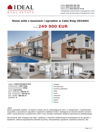 telefon 0034 603 390 766 telefon 0034 616 954 502 telefon biuro 0034 865 68 79 45 [email protected] www.nieruchomosci-hiszpania.com Nowe wille z basenem i ogrodem w Cabo Roig (ID1694) cena: region: COSTA BLANCA PLD. miejscowość: Cabo Roig typ nieruchomości: Willa rynek: pierwotny pow. użytkowa: 188.00 m2 pow. konstrukcji: 130.00 m2 pow. działki: 188.00 m2 sypialnie: 3 249 900 EUR działka klimatyzacja kuchnia oddzielna AGD taras solarium parking ogród basen Opis: Nowo powstałe osiedle, na którym mieści się 31 wolnostjących willi z 3 sypialniami i 3 łazienkami, wszystkie z prywatnym ogrodem i basenem wielkości 6x3m. Dostępne są również działki narożne, wille z dużą piwnicą o powierzchni 26m² oraz istnieje możliwość dodania ogrzewania podłogowego. Na parterze willi znajduje się salon / jadalnia z drzwiami balkonowymi prowadzącymi do ogrodu z basenem, dobrze wyposażona otwarta kuchnia, dwuosobowa sypialnia i łazienka rodzinna. Na Side 1 / 2 pierwszym piętrze znajdują się dwie kolejne sypialnie, dwie łazienki, obszar szeregowy ze schodami prowadzącymi do solarium na dachu. Bardzo dobra lokalizacja w odległości spaceru od centrum handlowego Zenia Boulevard i zaledwie kilka minut jazdy do pięknych plaż Campoamor, Cabo Roig i La Zenia oznaczonych błękitną flagą a w odlegości 10 minut drogi znajdują się trzy najwyższej klasy pola golfowe. W razie dodatkowych pytań proszę o kontakt. www.nieruchomosci-hiszpania.com Side 2 / 2 Powered by TCPDF (www.tcpdf.org)