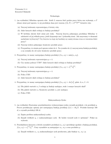 (b) Jeżeli w1 = 2, w2 = 1 oraz p = 4 znajdź x1 i x2 . Znajdź y i zysk.