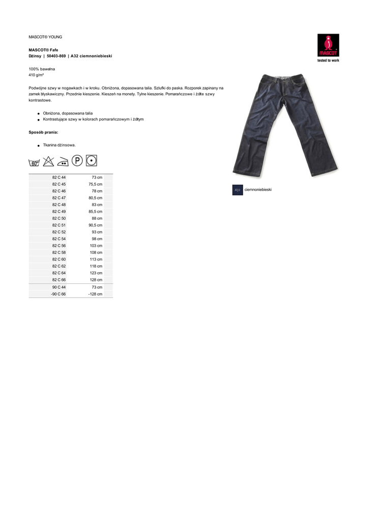 MASCOT® YOUNG MASCOT® Fafe Dżinsy | 50403-869 | A32 ciemnoniebieski 100% bawełna 410 g/m² Podwójne szwy w nogawkach i w kroku. Obniżona, dopasowana talia. Szlufki do paska. Rozporek zapinany na zamek błyskawiczny. Przednie kieszenie. Kieszeń na monety. Tylne kieszenie. Pomarańczowe i żółte szwy kontrastowe. l Obniżona, dopasowana talia l Kontrastujące szwy w kolorach pomarańczowym i żółtym Sposób prania: l Tkanina dżinsowa. 82 C 44 73 cm 82 C 45 75,5 cm 82 C 46 78 cm 82 C 47 80,5 cm 82 C 48 83 cm 82 C 49 85,5 cm 82 C 50 88 cm 82 C 51 90,5 cm 82 C 52 93 cm 82 C 54 98 cm 82 C 56 103 cm 82 C 58 108 cm 82 C 60 113 cm 82 C 62 118 cm 82 C 64 123 cm 82 C 66 128 cm 90 C 44 73 cm -90 C 66 -128 cm ciemnoniebieski