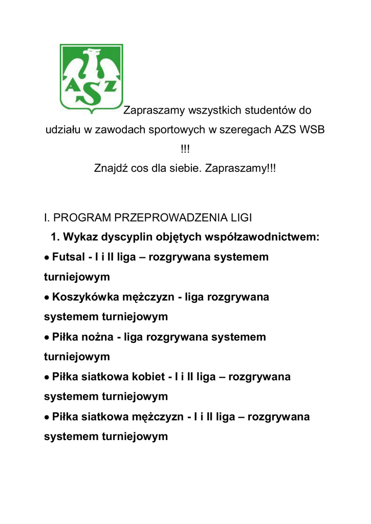 Zapraszamy wszystkich studentów do udziału w zawodach sportowych w szeregach AZS WSB !!! Znajdź cos dla siebie. Zapraszamy!!! I. PROGRAM PRZEPROWADZENIA LIGI 1. Wykaz dyscyplin objętych współzawodnictwem: Futsal - I i II liga – rozgrywana systemem turniejowym Koszykówka mężczyzn - liga rozgrywana systemem turniejowym Piłka nożna - liga rozgrywana systemem turniejowym Piłka siatkowa kobiet - I i II liga – rozgrywana systemem turniejowym Piłka siatkowa mężczyzn - I i II liga – rozgrywana systemem turniejowym Badminton Biegi przełajowe kobiet Biegi przełajowe mężczyzn Brydż sportowy Curling Dart Ergometr wioślarski kobiet Ergometr wioślarski mężczyzn Judo kobiet Judo mężczyzn Karate kyokushin Kolarstwo górskie kobiet Kolarstwo górskie mężczyzn Lekkoatletyka kobiet Lekkoatletyka mężczyzn Narciarstwo kobiet Narciarstwo mężczyzn Pływanie kobiet Pływanie mężczyzn Siatkówka plażowa kobiet Siatkówka plażowa mężczyzn Snowboard kobiet Snowboard mężczyzn Streetbasket kobiet Streetbasket mężczyzn Szachy Tenis stołowy kobiet Tenis stołowy mężczyzn Tenis ziemny kobiet Tenis ziemny mężczyzn Trójbój siłowy Windsurfing Wspinaczka halowa mężczyzn Wspinaczka halowa kobiet Żeglarstwo Kontakt: mgr Maciej Sadowski Kierownik Studium Kultury Fizycznej WSB [email protected]