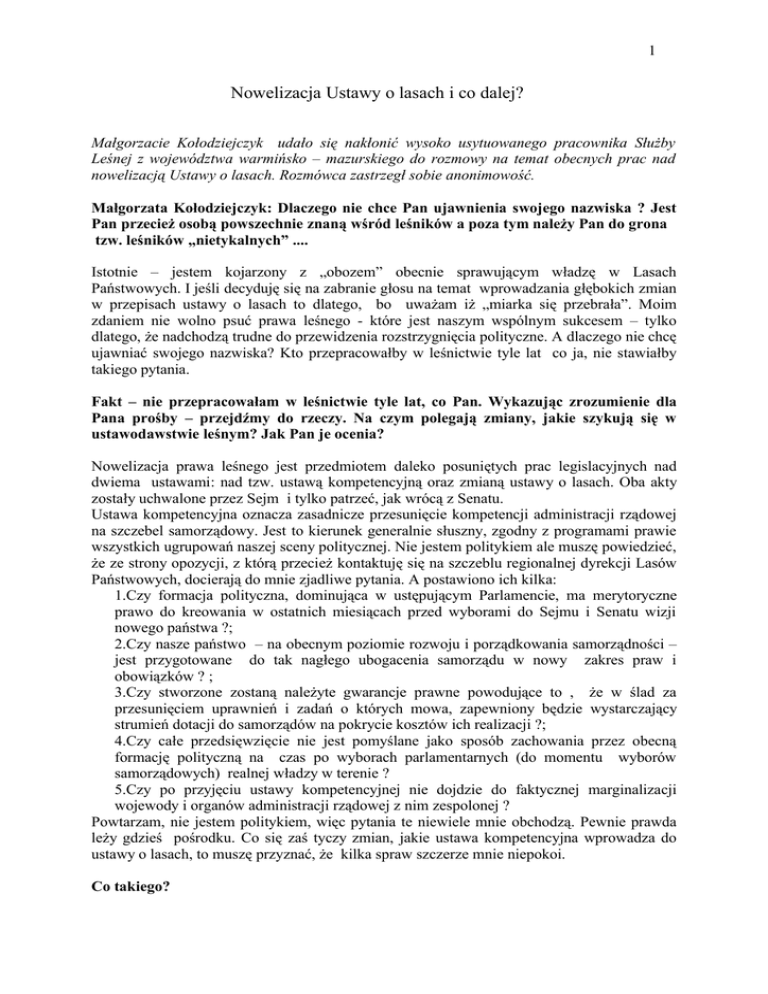 1 Nowelizacja Ustawy o lasach i co dalej? Małgorzacie Kołodziejczyk udało się nakłonić wysoko usytuowanego pracownika Służby Leśnej z województwa warmińsko – mazurskiego do rozmowy na temat obecnych prac nad nowelizacją Ustawy o lasach. Rozmówca zastrzegł sobie anonimowość. Małgorzata Kołodziejczyk: Dlaczego nie chce Pan ujawnienia swojego nazwiska ? Jest Pan przecież osobą powszechnie znaną wśród leśników a poza tym należy Pan do grona tzw. leśników „nietykalnych” .... Istotnie – jestem kojarzony z „obozem” obecnie sprawującym władzę w Lasach Państwowych. I jeśli decyduję się na zabranie głosu na temat wprowadzania głębokich zmian w przepisach ustawy o lasach to dlatego, bo uważam iż „miarka się przebrała”. Moim zdaniem nie wolno psuć prawa leśnego - które jest naszym wspólnym sukcesem – tylko dlatego, że nadchodzą trudne do przewidzenia rozstrzygnięcia polityczne. A dlaczego nie chcę ujawniać swojego nazwiska? Kto przepracowałby w leśnictwie tyle lat co ja, nie stawiałby takiego pytania. Fakt – nie przepracowałam w leśnictwie tyle lat, co Pan. Wykazując zrozumienie dla Pana prośby – przejdźmy do rzeczy. Na czym polegają zmiany, jakie szykują się w ustawodawstwie leśnym? Jak Pan je ocenia? Nowelizacja prawa leśnego jest przedmiotem daleko posuniętych prac legislacyjnych nad dwiema ustawami: nad tzw. ustawą kompetencyjną oraz zmianą ustawy o lasach. Oba akty zostały uchwalone przez Sejm i tylko patrzeć, jak wrócą z Senatu. Ustawa kompetencyjna oznacza zasadnicze przesunięcie kompetencji administracji rządowej na szczebel samorządowy. Jest to kierunek generalnie słuszny, zgodny z programami prawie wszystkich ugrupowań naszej sceny politycznej. Nie jestem politykiem ale muszę powiedzieć, że ze strony opozycji, z którą przecież kontaktuję się na szczeblu regionalnej dyrekcji Lasów Państwowych, docierają do mnie zjadliwe pytania. A postawiono ich kilka: 1.Czy formacja polityczna, dominująca w ustępującym Parlamencie, ma merytoryczne prawo do kreowania w ostatnich miesiącach przed wyborami do Sejmu i Senatu wizji nowego państwa ?; 2.Czy nasze państwo – na obecnym poziomie rozwoju i porządkowania samorządności – jest przygotowane do tak nagłego ubogacenia samorządu w nowy zakres praw i obowiązków ? ; 3.Czy stworzone zostaną należyte gwarancje prawne powodujące to , że w ślad za przesunięciem uprawnień i zadań o których mowa, zapewniony będzie wystarczający strumień dotacji do samorządów na pokrycie kosztów ich realizacji ?; 4.Czy całe przedsięwzięcie nie jest pomyślane jako sposób zachowania przez obecną formację polityczną na czas po wyborach parlamentarnych (do momentu wyborów samorządowych) realnej władzy w terenie ? 5.Czy po przyjęciu ustawy kompetencyjnej nie dojdzie do faktycznej marginalizacji wojewody i organów administracji rządowej z nim zespolonej ? Powtarzam, nie jestem politykiem, więc pytania te niewiele mnie obchodzą. Pewnie prawda leży gdzieś pośrodku. Co się zaś tyczy zmian, jakie ustawa kompetencyjna wprowadza do ustawy o lasach, to muszę przyznać, że kilka spraw szczerze mnie niepokoi. Co takiego? 2 Dotychczas nadzór nad gospodarką leśną w lasach nie stanowiących własności Skarbu Państwa sprawował: starosta oraz w zakresie określonym w ustawie - wojewoda. Po nowelizacji odpowiedni zapis będzie brzmiał: „1. Nadzór nad gospodarką leśną sprawują: (...) starosta – w lasach nie stanowiących własności Skarbu Państwa”. Jest to rozstrzygnięcie w zasadzie prawidłowe. W ustawie o lasach wojewoda ma szczątkowe uprawnienia do sprawowania bezpośredniego nadzoru nad gospodarką leśną w lasach nie państwowych. Unormowania te w ustawie o lasach pozostały. W związku z tym rzeczywiście nie ma większego sensu powtarzać w art. 5. ust.1, że wojewoda sprawuje nadzór nad gospodarką leśną w zakresie określonym w ustawie o lasach. Przy okazji zauważmy, że według kodeksu postępowania administracyjnego oraz innych przepisów ogólnych – dotychczas w sprawach decyzji administracyjnych, wydawanych przez nadleśniczego w imieniu starosty, w ramach nadzoru nad gospodarką leśną – występował wojewoda jako organ drugiej instancji. W toku prac nad ustawą należałoby się upewnić, czy ten stan faktyczny i prawny nie ulegnie zmianie. Inna zmiana wiąże się z dotychczasową regulacją: „Wojewoda może powierzyć, w drodze porozumienia, prowadzenie w jego imieniu spraw z zakresu nadzoru, o którym mowa w ust. 1, w tym wydawanie decyzji administracyjnych w pierwszej instancji, dyrektorowi regionalnej dyrekcji Lasów Państwowych.” Po nowelizacji stosowny przepis będzie miał następującą treść: „W przypadku lasu, który obejmuje obszar więcej niż jednego powiatu, właściwym miejscowo jest starosta powiatu, na którego terenie znajduje się większa część tego lasu. Starosta ten może powierzyć, w drodze porozumienia, prowadzenie w jego imieniu spraw z zakresu nadzoru, o którym mowa w ust. 1 pkt 2, w tym wydawanie decyzji administracyjnych w pierwszej instancji, dyrektorowi regionalnej dyrekcji Lasów Państwowych.”, Nie mam wątpliwości, że nowa regulacja będzie praktycznie niewykonalna. Dla każdego, kto zna realia działalności leśnej nie powinno ulegać wątpliwości, że sprawowanie nadzoru nad gospodarką leśną w lasach nie stanowiących własności Skarbu Państwa nie może odbywać się z poziomu regionalnej dyrekcji Lasów Państwowych. W praktyce – dyrektor regionalnej dyrekcji Lasów Państwowych i tak musiałby posiłkować się wewnętrznymi usługami, sprawowanymi na jego rzecz przez nadleśniczych. Wątpliwości budzi to, czy uprawnienie dyrektora rdLp do wydawania w imieniu starosty decyzji administracyjnych można uważać za zbywalne (nie jest wcale oczywiste, że dyrektor regionalnej dyrekcji LP swoje prawo do stanowienia decyzji administracy