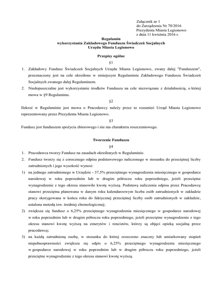 Załącznik nr 1 do Zarządzenia Nr 70/2016 Prezydenta Miasta Legionowo z dnia 11 kwietnia 2016 r. Regulamin wykorzystania Zakładowego Funduszu Świadczeń Socjalnych Urzędu Miasta Legionowo Przepisy ogólne §1 1. Zakładowy Fundusz Świadczeń Socjalnych Urzędu Miasta Legionowo, zwany dalej "Funduszem", przeznaczony jest na cele określone w niniejszym Regulaminie Zakładowego Funduszu Świadczeń Socjalnych zwanego dalej Regulaminem. 2. Niedopuszczalne jest wykorzystanie środków Funduszu na cele niezwiązane z działalnością, o której mowa w §9 Regulaminu. §2 Ilekroć w Regulaminie jest mowa o Pracodawcy należy przez to rozumieć Urząd Miasta Legionowo reprezentowany przez Prezydenta Miasta Legionowo. §3 Fundusz jest funduszem spożycia zbiorowego i nie ma charakteru roszczeniowego. Tworzenie Funduszu §4 1. Pracodawca tworzy Fundusz na zasadach określonych w Regulaminie. 2. Fundusz tworzy się z corocznego odpisu podstawowego naliczonego w stosunku do przeciętnej liczby zatrudnionych i jego wysokość wynosi: 1) na jednego zatrudnionego w Urzędzie - 37,5% przeciętnego wynagrodzenia miesięcznego w gospodarce narodowej w roku poprzednim lub w drugim półroczu roku poprzedniego, jeżeli przeciętne wynagrodzenie z tego okresu stanowiło kwotę wyższą. Podstawę naliczenia odpisu przez Pracodawcę stanowi przeciętna planowana w danym roku kalendarzowym liczba osób zatrudnionych w zakładzie pracy skorygowana w końcu roku do faktycznej przeciętnej liczby osób zatrudnionych w zakładzie, ustalona metodą tzw. średniej chronologicznej; 2) zwiększa się fundusz o 6,25% przeciętnego wynagrodzenia miesięcznego w gospodarce narodowej w roku poprzednim lub w drugim półroczu roku poprzedniego, jeżeli przeciętne wynagrodzenie z tego okresu stanowi kwotę wyższą na emerytów i rencistów, którzy są objęci opieką socjalną przez pracodawcę; 3) na każdą zatrudnioną osobę, w stosunku do której orzeczono znaczny lub umiarkowany stopień niepełnosprawności zwiększa się odpis o 6,25% przeciętnego wynagrodzenia miesięcznego w gospodarce narodowej w roku poprzednim lub w drugim półroczu roku poprzedniego, jeżeli przeciętne wynagrodzenie z tego okresu stanowi kwotę wyższą. §5 1. Środki Funduszu gromadzone są na odrębnym rachunku bankowym. 2. Środki Funduszu zwiększa się o: 1) odsetki od środków Funduszu zgromadzonych na rachunku bankowym, 2) wpływy z oprocentowania pożyczek udzielonych na cele mieszkaniowe. 3. Środki Funduszu niewykorzystane w danym roku kalendarzowym przechodzą na rok następny. §6 1. W celu racjonalnego i jawnego gospodarowania Funduszem Pracodawca powołuje Komisję Zakładowego Funduszu Świadczeń Socjalnych, zwaną dalej „Komisją”. 2. Komisja działa na podstawie Regulaminu Pracy Komisji Zakładowego Funduszu Świadczeń Socjalnych przy Urzędzie Miasta Legionowo, który stanowi załącznik nr 2 do niniejszego Zarządzenia. §7 1. Podstawą do prowadzenia działalności socjalnej w Urzędzie Miasta Legionowo jest roczny plan prowadzenia działalności socjalnej (preliminarz). 2. W uzasadnionych przypadkach preliminarz, o którym mowa w ust. 1, może być zmieniony. Osoby uprawnione do korzystania ze świadczeń socjalnych §8 1. Ilekroć jest mowa o osobach uprawnionych do korzystania ze środków Funduszu należy przez to rozumieć: 1) pracowników zatrudnionych na podstawie umowy o pracę na czas określony i nieokreślony, powołania, wyboru w pełnym i niepełnym wymiarze czasu pracy oraz członków ich rodzin, 2) pracowników korzystających z urlopu wychowawczego oraz członków ich rodzin, 3) emerytów - byłych pracowników zakładu pobierających emeryturę, na którą przeszły po okresie zatrudnienia w Urzędzie Miasta Legionowo, bezpośrednio po zakończeniu umowy o pracę w związku z przejściem na emeryturę lub pośrednio, np. po okresie pobierania renty, 4) członków rodzin pracownika, który zmarł w czasie zatrudnienia. 2. Członkami rodziny osób uprawnionych, o których mowa w ust. 1 pkt 1-4 są: współmałżonkowie pracownika, emeryta i rencisty, dzieci własne, dzieci współmałżonka, dzieci przysposobione, przyjęte na wychowanie w rodzinie zastępczej oraz inne osoby pozostające z uprawnionym we wspólnym gospodarstwie domowym i będące na jego utrzymaniu. 3. Dziećmi w rozumieniu ust. 2 są dzieci pozostające na utrzymaniu osób uprawnionych, do ukończenia 18-go roku życia. Przeznaczenie Środków Funduszu §9 1. Środki z Zakładowego Funduszu Świadczeń Socjalnych mogą być wykorzystane na: 1) dofinansowanie krajowego lub zagranicznego wypoczynku osobom uprawnionym, organizowanego w formie: a) turnusów wypoczynkowych w ośrodkach wczasowych wykupionych indywidualnie przez osobę uprawnioną, b) turnusów leczniczo – rehabilitacyjnych w sanatoriach, c) wypoczynku dzieci, o których mowa w §8 ust. 3 Regulaminu, w formie kolonii letnich i zimowych, obozów, zielonych szkół. d) wyjazdu na wycieczkę organizowanego przez Pracodawcę, e) wypoczynku organizowanego przez osobę uprawnioną we własnym zakresie; 2) dofinansowanie biletów wstępu na imprezy artystyczne, kulturalne, rozrywkowe, sportowe, zajęć rekreacyjno-sportowych, imprez integracyjnych oraz kosztów transportu osób uprawnionych na wymienione imprezy; 3) udzielanie osobom uprawnionym pomocy materialnej - rzeczowej lub finansowej w formie zapomóg bezzwrotnych, w przypadku wystąpienia zdarzeń losowych, klęsk żywiołowych, długotrwałej choroby lub śmierci członka rodziny, uzależnionej od sytuacji życiowej, rodzinnej i materialnej osoby uprawnionej do korzystania z Funduszu; 4) udzielanie osobom uprawnionym pomocy materialnej, rzeczowej lub finansowej w formie zapomóg bezzwrotnych nielosowych, uzależnionej od sytuacji życiowej, rodzinnej i materialnej osoby uprawnionej do korzystania z Funduszu; 5) zakup paczek świątecznych lub bezzwrotnej świątecznej pomocy finansowej dla osób uprawnion