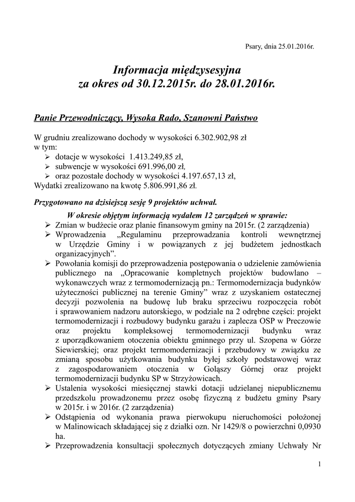 Psary, dnia 25.01.2016r. Informacja międzysesyjna za okres od 30.12.2015r. do 28.01.2016r. Panie Przewodniczący, Wysoka Rado, Szanowni Państwo W grudniu zrealizowano dochody w wysokości 6.302.902,98 zł w tym: ➢ dotacje w wysokości 1.413.249,85 zł, ➢ subwencje w wysokości 691.996,00 zł, ➢ oraz pozostałe dochody w wysokości 4.197.657,13 zł, Wydatki zrealizowano na kwotę 5.806.991,86 zł. Przygotowano na dzisiejszą sesję 9 projektów uchwał. ➢ ➢ ➢ ➢ ➢ ➢ W okresie objętym informacją wydałem 12 zarządzeń w sprawie: Zmian w budżecie oraz planie finansowym gminy na 2015r. (2 zarządzenia) Wprowadzenia „Regulaminu przeprowadzania kontroli wewnętrznej w Urzędzie Gminy i w powiązanych z jej budżetem jednostkach organizacyjnych”. Powołania komisji do przeprowadzenia postępowania o udzielenie zamówienia publicznego na „Opracowanie kompletnych projektów budowlano – wykonawczych wraz z termomodernizacją pn.: Termomodernizacja budynków użyteczności publicznej na terenie Gminy” wraz z uzyskaniem ostatecznej decyzji pozwolenia na budowę lub braku sprzeciwu rozpoczęcia robót i sprawowaniem nadzoru autorskiego, w podziale na 2 odrębne części: projekt termomodernizacji i rozbudowy budynku garażu i zaplecza OSP w Preczowie oraz projektu kompleksowej termomodernizacji budynku wraz z uporządkowaniem otoczenia obiektu gminnego przy ul. Szopena w Górze Siewierskiej; oraz projekt termomodernizacji i przebudowy w związku ze zmianą sposobu użytkowania budynku byłej szkoły podstawowej wraz z zagospodarowaniem otoczenia w Goląszy Górnej oraz projekt termomodernizacji budynku SP w Strzyżowicach. Ustalenia wysokości miesięcznej stawki dotacji udzielanej niepublicznemu przedszkolu prowadzonemu przez osobę fizyczną z budżetu gminy Psary w 2015r. i w 2016r. (2 zarządzenia) Odstąpienia od wykonania prawa pierwokupu nieruchomości położonej w Malinowicach składającej się z działki ozn. Nr 1429/8 o powierzchni 0,0930 ha. Przeprowadzenia konsultacji społecznych dotyczących zmiany Uchwały Nr 1 VII/74/2015 Rady Gminy Psary z dnia 28 maja 2015r. w sprawie szczegółowych warunków przyznawania i odpłatności za usługi opiekuńcze i specjalistyczne usługi opiekuńcze, z wyłączeniem specjalistycznych usług opiekuńczych dla osób z zaburzeniami psychicznymi, oraz szczegółowych warunków częściowego lub całkowitego zwolnienia od opłat, jak również trybu ich pobierania. ➢ Przeprowadzenia z mieszkańcami wsi Grodków konsultacji społecznych, dotyczących zmiany urzędowej nazwy miejscowości „Grodków”, na „Gródków”. ➢ Przeprowadzenia z mieszkańcami wsi Goląsza Dolna i wsi Goląsza Biska konsultacji społecznych, dotyczących połączenia wsi Goląsza Dolna i wsi Goląsza Biska w jedną wieś o nazwie Goląsza Dolna i zniesienie urzędowej nazwy miejscowości Goląsza Biska. ➢ Przeprowadzenia z mieszkańcami wsi Chrobakowe konsultacji społecznych, dotyczących zmiany urzędowej nazwy miejscowości wsi „Chrobakowe”, na wieś „Dąbie Chrobakowe”. ➢ Przeprowadzenia z mieszkańcami Brzękowic Dolnych tworzących część wsi Brzękowice – Wał, konsultacji społecznych, dotyczących zmiany określenia rodzajowego miejscowości Brzękwoice Dolne – stanowiących obecnie część wsi Brzękowice – Wał, na Brzękowice Dolne – wieś. W okresie objętym informacją zawarłem 9 umów: ➢ Z Panem Arturem Wątorem prowadzącym działalność gospodarczą jako „Archemia projektowane” na opracowanie kompletnych projektów budowlano – wykonawczych dla obiektów wskazanych w warunkach konkursu na koncepcję zagospodarowania terenu byłej szkoły w Malinowicach w Gminie Psary wraz z uzyskaniem obowiązujących pozwoleń i zgód budowlanych i sprawowaniem nadzoru autorskiego w trakcie realizacji zadania. Termin realizacji zadania do 28.03.2016r. Umowa została zawarta na kwotę brutto: 29 000,00 zł. ➢ Z Panem Przemysławem Jędrzejczykiem prowadzącym działalność gospodarczą jako „Jędrzejczyk Przemysław Zakład Remontowo – Budowlany” na wykonanie zamówienia dodatkowego na roboty budowlane dotyczące zadania pn.: „przebudowa wiaty na budynek socjalny dla OSP w Dąbiu”. Termin realizacji zadania do 31.03.2016r. Umowa została zawarta na kwotę brutto: 26 000,00 zł. ➢ Z Pocztą Polską Spółka akcyjna do świadczenia usług powszechnych i niepowszechnych w obrocie krajowym i zagranicznym. ➢ Z firmą Juko Sp.zo.o. z siedzibą w Zawierciu na wyłapywanie bezdomnych zwierząt z terenu Gminy Psary. Ponadto, zawarłem: ➢ Z powiatem będzińskim umowę użyczenia lokalu położonego w Psarach w siedzibie OPS w celu prowadzenia punktu nieodpłatnej pomocy prawnej. 2 ➢ Umowę zlecenia na „przeprowadzenie audytu i sprawdzenia dokumentacji budowlanej, pełnienie funkcji inspektora nadzoru” (m.in.: ul. Wspólna Psary/Gródków, ul. Rogoźnicka, projekt budowy żłobka w Psarach, projekt modernizacji kuchni i zaplecza pomieszczeń dodatkowych w ZSP w Dąbiu, 7 projektów budowlano wykonawczych remontu nawierzchni dróg gminnych, projekt termomodernizacji i przebudowy OSP w Górze Siewierskiej). ➢ Porozumienie z rodzicem dziecka realizującego kształcenie specjalne w Niepublicznym Przedszkolu „Zakątek marzeń” w Będzinie. ➢ Umowę zlecenia do wykonywania czynności związanych z promocją Gminy. ➢ Umowę użyczenia stojaka trzystanowiskowego na worki foliowe do selektywnego zbierania odpadów komunalnych. W poszczególnych komórkach organizacyjnych Urzędu zrealizowano m.in. następujące zadania: W zakresie ewidencji ludności: ➢ zameldowało się na pobyt stały 21 osób, na pobyt czasowy 54 osoby, ➢ zameldowano 12 noworodków, odnotowano 9 zgonów mieszkańców naszej gminy; ➢ przyjęto 95 wniosków o wydanie dowodu osobistego i wydano 114 dowodów osobistych. W zakresie działalności gospodarczej zostało wprowadzonych: ➢ 66 zaświadczenia o wpisie do ewid