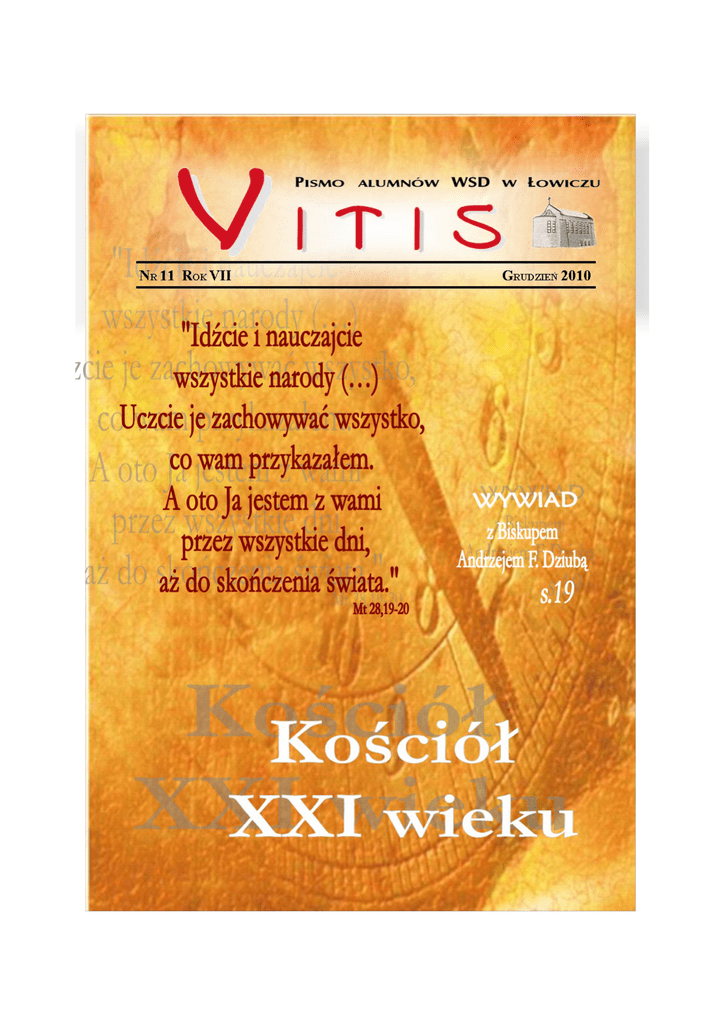 yjemy w czasach nowoczesności. Świat rozwija się w bardzo szybkim tempie. Kościół już dwudziesty pierwszy wiek głosi ciągle tę samą Ewangelię. Epoka, w której przyszło nam żyć jest pełna przepychu, w którym niejednokrotnie brakuje miejsca dla Tego, który przyszedł, aby zbawić człowieka i który nadaje sens ludzkiemu istnieniu – Jezusa Chrystusa. Dlatego niniejsze wydanie czasopisma Vitis pragniemy poświęcić przede wszystkim temu, jak wygląda sytuacja Kościoła w obecnych czasach. Świat potrzebuje modlitwy. Wielu jest takich, którzy ofiarowują Panu Bogu swoją samotność, zamykając się za klauzurą klasztorów kontemplacyjnych i tam oddają się rozmowie z Bogiem. Niektórzy ludzie uważają, że taki styl życia jest szaleństwem. Czy tak naprawdę jest? Czym jest prawdziwa samotność? Czym jest szeroko pojęte piękno dla dzisiejszego człowieka? Na te i inne pytania nasi klerycy starali się dawać jak najbardziej wyczerpujące odpowiedzi. W naszym Seminarium mamy po raz pierwszy tzw. rok propedeutyczny. Odpowiemy, zatem na pytanie, czym ten rok jest i w jakim celu został ustanowiony. W obecnym numerze Vitis oprócz wielu artykułów znalazł się także szczególny wywiad. Otóż Pasterz naszej diecezji w tym roku obchodził jubileusz sześćdziesiątych urodzin. Z tej okazji zamieszczamy obszerną rozmowę z ks. bp Andrzejem F. Dziubą, w której min. opowie o swojej młodości, współpracy z Prymasem Polski, planach na przyszłość; odniesie się także do bieżącej sytuacji Kościoła. Oddajemy, więc w Wasze ręce jedenaste już wydanie czasopisma Vitis, głęboko ufając, iż będzie ono dla Was pożyteczną lekturą oraz elementem przybliżającym Was w stronę Stworzyciela. 1 Tytułem wstępu 1 Redakcja Okres propedeutyczny 3 Rafał Kaczmarek Rozsiewać woń piękna Boga w świecie 8 Paweł Olszewski 10 Piotr Miazek 12 Dominik Napora 15 Robert Błaszczyk 60 urodziny Biskupa Łowickiego 19 Piotr Jarota Michał Szkupiński Skąd, po co i dla kogo fundacja CARITAS 31 Sebastian Antosik Sekty zgubą człowieka 34 Paweł Pawlak Tomasz Gawarecki Samotność w nie samotności 36 Rafał Nawrocki Czy służba w Kościele tylko dla duchownych? 39 Maciej Białkowski Komercjalizacja Świąt Bożego Narodzenia 44 Jakub Świerczyński Mateusz Podkowiński Kronika seminaryjna 46 Łukasz Gawrzydek Godne uwagi INFORMACJE diecezji łowickiej 48 Redakcja Życie w zakonach kontemplacyjnych – szaleństwo czy błogosławieństwo Rok św. Jakuba - tradycja pielgrzymowania do Santiago de Compostela Kobieta - ksiądz Dlaczego kościół mówi nie? ul. Seminaryjna 6 99-400 Łowicz tel.: 46 837-60-16 e-mail: [email protected] Zakład Poligraficzny Halina Puchalska ul. Oporowska 14 99-300 Kutno tel.: 24 254-25-00 2 WYDANIA: Łukasz Lesiak, Tomasz Stępniak Stępniak OPIEKUN WYDANIA: Ks. Dariusz Kuźmiński TECHNICZNY/OKŁADKA: Tomasz Wszelki postęp oraz zmiany cywilizacyjne zobowiązują, aby zmieniła się choć trochę metoda przygotowania kandydatów do kapłaństwa. Jednym z owoców refleksji Kościoła nad formacją przyszłych kapłanów był postulat sformułowany przez Synod Biskupów z 1990 roku, aby właściwą formację alumnów w seminarium poprzedzał odpowiedni okres przygotowawczy. Dwa lata później, w roku 1992 kwestię okresu propedeutycznego w seminariach duchownych poruszył Jan Paweł II w adhortacji „Pastores dabo Vobis”. Ponad rok temu, 2 maja 2009 roku na Jasnej Górze miały miejsce obrady Rady Stałej i biskupów diecezjalnych, na których zostało poruszone zagadnienie wprowadzenia tzw. okresu propedeutycznego w zwyczajny cykl formacji seminaryjnej. Sekretarz generalny Konferencji Episkopatu Polski bp Stanisław Budzik tłumaczył, że okres propedeutyczny jest czymś istotnym, bowiem przygotowuje do wejścia na drogę radykalnie odmienną od dotychczasowej’’. Okres propedeutyczny to przede wszystkim czas, który obejmuję formację duchową, ułatwiającą rozeznanie powołania, pozwala także na uzupełnienie braków w formacji intelektualnej, religijnej i kulturowej kandydata. Zdecydowanie jest to pomocne w rozwoju duchowym, ponieważ kandydaci przychodzą z miast i terenów wiejskich. Okres propedeutyczny to również czas, aby zewnętrzna pobożność młodego człowieka przerodziła się w autentyczne życie wiarą. Po raz pierwszy okres propedeutyczny został rozpoczęty wraz z nowym rokiem akademickim 2010. Czas trwania tegoż okresu i sposób jego przeprowadzania zależy tylko i wyłącznie od biskupa danej diecezji. W seminarium łowickim jest to okres jednego roku. To czas ubogacający pobyt czterech kleryków roku pierwszego. Celem okresu propedeutycznego w łowickim seminarium jest wprowadzenie kleryka w życie duchowe prowadzące do spotkania z Bogiem. Odkrycie mocy Słowa Bożego i życie liturgią. Stąd też klerycy 3 pierwszego roku mają trzy razy w tygodniu lekturę Pisma Świętego w Oratorium w obecności Najświętszego Sakramentu. Okres ten ma pomóc w zdobywaniu dojrzałości ludzkiej i integracji osobowej w oparciu o klasyczną kulturę humanistyczną. Część zajęć jest wykładami dodatkowymi, które już są, np. kultura łacińska kultura hebrajska i archeologia biblijna, spotkania z polonistami na temat literatury polskiej w aspekcie religijnym, spotkania na temat kultury języka polskiego oraz wiele innych zagadnień: tj. podstawowe zagadnienia z duchowości i moralności chrześcijańskiej. Klerycy I roku mają raz w miesiącu oddzielną Mszę Świętą. Innymi elementami, które były i w dalszym ciągu są praktykowane to wspólna lektura duchowa i co miesięczne rozmowy z ojcem duchownym a także spotkania z panią psycholog, księdzem Rektorem oraz Vice-rektorem w ramach legesu. Kolejnym celem jest doświadczenie Kościoła partykularnego, chociażby przez różnorakie wyjazdy do miejsc historycznych diecezji łowickiej. Aby wszystkie te cele mogły być osiągnięte przez kleryków przechod