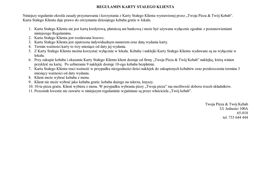 REGULAMIN KARTY STAŁEGO KLIENTA Niniejszy regulamin określa zasady przyznawania i korzystania z Karty Stałego Klienta wystawionej przez „Twoja Pizza & Twój Kebab”. Karta Stałego Klienta daje prawo do otrzymania dziesiątego kebaba gratis w lokalu. 1. Karta Stałego Klienta nie jest kartą kredytową, płatniczą ani bankową i może być używana wyłącznie zgodnie z postanowieniami niniejszego Regulaminu. 2. Karta Stałego Klienta jest rozdawana losowo. 3. Karta Stałego Klienta jest opatrzona indywidualnym numerem oraz datą wydania karty. 4. Termin ważności karty to trzy miesiące od daty jej wydania. 5. Z Karty Stałego Klienta można korzystać wyłącznie w lokalu. Kebaby i naklejki Karty Stałego Klienta wydawane są na wyłącznie w lokalu. 6. Przy zakupie kebaba i okazaniu Karty Stałego Klienta klient dostaje od firmy „Twoja Pizza & Twój Kebab” naklejkę, którą winien przykleić na kartę. Po uzbieraniu 9 naklejek dostaje 10-ego kebaba bezpłatnie. 7. Karta Stałego Klienta traci ważność w przypadku niezgodności ilości naklejek do zakupionych kebabów oraz przekroczenia terminu 3 miesięcy ważności od daty wydania. 8. Klient może wybrać kebaba z menu. 9. Klient nie może wybrać jako kebaba gratis: kebaba dużego na talerzu, knyszy. 10. 10-ta pizza gratis. Klient wybiera z menu. W przypadku wybrania pizzy „Twoja pizza” ma możliwość doboru trzech składników. 11. Pozostałe kwestie nie zawarte w niniejszym regulaminie wyjaśniane są przez właściciela „Twój kebab”. Twoja Pizza & Twój Kebab Ul. Jedności 100A 65-018 tel. 733 644 444