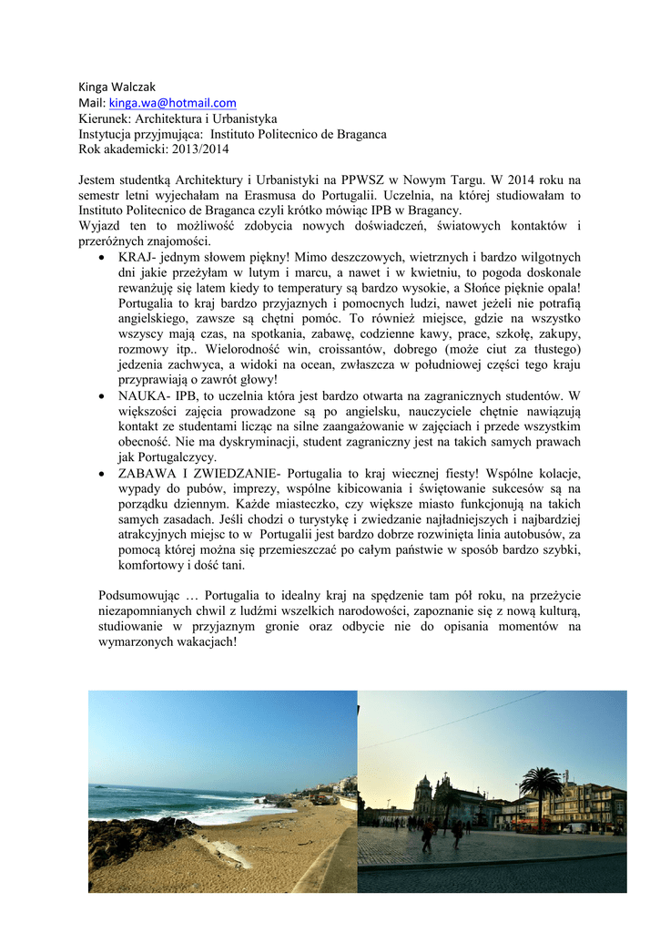 Kinga Walczak Mail: [email protected] Kierunek: Architektura i Urbanistyka Instytucja przyjmująca: Instituto Politecnico de Braganca Rok akademicki: 2013/2014 Jestem studentką Architektury i Urbanistyki na PPWSZ w Nowym Targu. W 2014 roku na semestr letni wyjechałam na Erasmusa do Portugalii. Uczelnia, na której studiowałam to Instituto Politecnico de Braganca czyli krótko mówiąc IPB w Bragancy. Wyjazd ten to możliwość zdobycia nowych doświadczeń, światowych kontaktów i przeróżnych znajomości. KRAJ- jednym słowem piękny! Mimo deszczowych, wietrznych i bardzo wilgotnych dni jakie przeżyłam w lutym i marcu, a nawet i w kwietniu, to pogoda doskonale rewanżuję się latem kiedy to temperatury są bardzo wysokie, a Słońce pięknie opala! Portugalia to kraj bardzo przyjaznych i pomocnych ludzi, nawet jeżeli nie potrafią angielskiego, zawsze są chętni pomóc. To również miejsce, gdzie na wszystko wszyscy mają czas, na spotkania, zabawę, codzienne kawy, prace, szkołę, zakupy, rozmowy itp.. Wielorodność win, croissantów, dobrego (może ciut za tłustego) jedzenia zachwyca, a widoki na ocean, zwłaszcza w południowej części tego kraju przyprawiają o zawrót głowy! NAUKA- IPB, to uczelnia która jest bardzo otwarta na zagranicznych studentów. W większości zajęcia prowadzone są po angielsku, nauczyciele chętnie nawiązują kontakt ze studentami licząc na silne zaangażowanie w zajęciach i przede wszystkim obecność. Nie ma dyskryminacji, student zagraniczny jest na takich samych prawach jak Portugalczycy. ZABAWA I ZWIEDZANIE- Portugalia to kraj wiecznej fiesty! Wspólne kolacje, wypady do pubów, imprezy, wspólne kibicowania i świętowanie sukcesów są na porządku dziennym. Każde miasteczko, czy większe miasto funkcjonują na takich samych zasadach. Jeśli chodzi o turystykę i zwiedzanie najładniejszych i najbardziej atrakcyjnych miejsc to w Portugalii jest bardzo dobrze rozwinięta linia autobusów, za pomocą której można się przemieszczać po całym państwie w sposób bardzo szybki, komfortowy i dość tani. Podsumowując … Portugalia to idealny kraj na spędzenie tam pół roku, na przeżycie niezapomnianych chwil z ludźmi wszelkich narodowości, zapoznanie się z nową kulturą, studiowanie w przyjaznym gronie oraz odbycie nie do opisania momentów na wymarzonych wakacjach!
