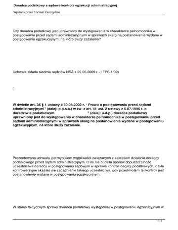 Doradca podatkowy a sądowa kontrola egzekucji administracyjnej Wpisany przez Tomasz Burczyński Czy doradca podatkowy jest uprawniony do występowania w charakterze pełnomocnika w postępowaniu przed sądami administracyjnymi w sprawach skarg na postanowienia wydane w postępowaniu egzekucyjnym, na które służy zażalenie? Uchwała składu siedmiu sędziów NSA z 29.06.2009 r. (I FPS 1/09) W świetle art. 35 § 1 ustawy z 30.08.2002 r. - Prawo o postępowaniu przed sądami administracyjnymi 1 (dalej: p.p.s.a.) w zw. z art. 41 ust. 2 ustawy z 5.07.1996 r. o 2 (dalej: u.d.p.) doradca podatkowy doradztwie podatkowym uprawniony jest do występowania w charakterze pełnomocnika w postępowaniu przed sądami administracyjnymi w sprawach skarg na postanowienia wydane w postępowaniu egzekucyjnym, na które służy zażalenie. Prezentowana uchwała jest wynikiem wątpliwości związanych z zakresem działania doradcy podatkowego przed sądem administracyjnym. O ile nie budziła sporów dopuszczalność uczestnictwa doradcy w postępowaniu sądowym w sprawie kontroli decyzji podatkowych, o tyle kontrowersyjne okazało się zagadnienie takiego uczestnictwa, gdy przedmiotem tej kontroli jest postanowienie wydane w postępowaniu egzekucyjnym. W stanie faktycznym sprawy doradca podatkowy występował w postępowaniu egzekucyjnym w 1/3 Doradca podatkowy a sądowa kontrola egzekucji administracyjnej Wpisany przez Tomasz Burczyński sprawie zarzutów dotyczących prowadzenia postępowania egzekucyjnego. Reprezentował także stronę w postępowaniu przed wojewódzkim sądem administracyjnym, zresztą skutecznie. W toku rozpoznawania skargi kasacyjnej organu egzekucyjnego od wyroku tego sądu Naczelny Sąd Administracyjny postanowił przedłożyć składowi powiększonemu następujące zagadnienie prawne: czy na podstawie art. 41 ust. 2 u.d.p. w zw. z art. 35 § 1 p.p.s.a. doradca podatkowy jest uprawniony do występowania w charakterze pełnomocnika w postępowaniu przed sądami administracyjnymi w sprawach skarg na postanowienia wydane w postępowaniu egzekucyjnym, na które służy zażalenie? Udzielając odpowiedzi, skład siedmiu sędziów zauważył, że doradca podatkowy może być przed sądem administracyjnym pełnomocnikiem tylko wtedy, gdy sprawa dotyczy obowiązków podatkowych. Wobec tak ogólnego sformułowania normatywnego uprawniony staje się wniosek, że doradca podatkowy może być przed sądem administracyjnym pełnomocnikiem strony we wszelkich sprawach, które bezpośrednio lub pośrednio mają swe źródło w obowiązku podatkowym, zdefiniowanym w art. 4 o.p. Innymi słowy, legitymacja do działania doradcy podatkowego obejmuje sprawy, których przedmiotem jest zarówno ściśle rozumiany obowiązek podatkowy, jak i pochodne od niego, czyli takie, które jedynie mają związek z obowiązkiem podatkowym. Doradca podatkowy traci natomiast legitymację do działania w postępowaniu sądowo-administracyjnym w przypadku, gdy źródłem sprawy jest inny, niepowiązany z zobowiązaniem podatkowym, obowiązek publicznoprawny, na przykład obowiązek wynikający z długu celnego. W rezultacie Sąd uznał, że sprawy egzekucji należności publicznoprawnych wynikających z ciążących na stronie obowiązków podatkowych mieszczą się w zakresie analizowanej normy prawnej. W dalszych wywodach skład siedmiu sędziów odniósł się do drugiego kryterium, warunkującego udział doradcy podatkowego w postępowaniu sądowo-administracyjnym, tj. rodzaju rozstrzygnięcia administracyjnego poddanego sądowej kontroli, którym - expressis verbis - ma być decyzja. Zdaniem Sądu jest poza dyskusją, że doradca podatkowy posiada legitymację do działania przed sądem administracyjnym w charakterze pełnomocnika strony w przypadku, gdy kontroli poddana została decyzja administracyjna dotycząca obowiązku podatkowego. Otwarty pozostaje jednak problem, czy doradca podatkowy może przed sądem reprezentować strony w sprawach, w których kontroli poddane zostały postanowienia. 2/3 Doradca podatkowy a sądowa kontrola egzekucji administracyjnej Wpisany przez Tomasz Burczyński Naczelny Sąd Administracyjny, odwołując się do zasad logiki, w szczególności argumentu a maiori ad minus , stwierdził, że skoro prawodawca zezwolił doradcy podatkowemu na reprezentowanie strony w sądowej kontroli orzeczeń dalej idących (decyzji), to tym samym, mimo ewidentnych mankamentów legislacyjnych, zezwolenie to obejmuje także udział w sądowej kontroli procesowo mniej ważkich postanowień. Wniosek przeciwny, oparty wyłącznie na dosłownym brzmieniu analizowanego przepisu, prowadziłby bowiem do absurdalnych konkluzji. Trudno znaleźć racjonalną argumentację tłumaczącą powody, dla których doradcy podatkowemu zezwolono wyłącznie na występowanie przed sądem administracyjnym w sprawach, w których kontrolowane są tylko decyzje administracyjne, a pozbawiono go tego prawa w przypadkach, gdy kontrola dotyczy zaskarżalnych w toku instancyjnym postanowień. Zdaniem Sądu tego poglądu nie podważa spodziewana nowelizacja ustawy o doradztwie podatkowym, która ma jednoznacznie określić kompetencję doradcy podatkowego do reprezentacji strony w zakresie sądowej kontroli postanowień podjętych w postępowaniu egzekucyjnym. Nowela ta ma w istocie charakter porządkujący dotychczasowy stan prawny, skoro można z niego wywieść, jak uczyniono powyżej, logiczne wnioski tożsame z proponowanym kierunkiem zmian. 1. Dz. U. Nr 153, poz. 1270 ze zm. 2. Dz. U. z 2008 r. Nr 73, poz. 443. 3/3