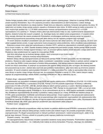 Przełącznik Kickstartu 1.3/3.5 do Amigi CDTV Robert Krajcarz (c) Polski Portal Amigowy (www.ppa.pl) w .p pa .p l Każda Amiga posiada układ, w którym zapisana jest część systemu operacyjnego. Układ ten to pamięć ROM, który został nazwany Kickstartem. Są w nim zapisane procedury odpowiedzialne za start komputera, a także obsługę urządzeń takich jak klawiatura czy stacja dysków. Dzięki temu po włączeniu zasilania, komputer jest gotowy do pracy. W zależności od modelu Amigi wersja systemu zawarta w Kickstarcie była różna. W A500 wersja ta miała oznaczenie 1.3, choć można było spotkać tez 1.2. W A600 zastosowano nowsze oprogramowanie oznaczone 2.0, w A1200 wprowadzono 3.0 a później 3.1. Kolejne zmiany jakie były dokonywane miały na celu: wyeliminowanie zauważonych błędów, dodanie funkcji dla nowych urządzeń, np. twardego dysku lub ułatwić prace programistom. Z czasem różne firmy zaczęły oferować tak zwane przełączniki Kickstartów umożliwiające podmianę starszej wersji na nowszą z możliwością przywrócenia poprzedniej wersji jeśli jakiś starszy lub źle napisany program tego wymagał. W swoim artykule chciałbym przedstawić opis jak można wykonać taki układ samemu. Od razu napiszę, że choć sam układ wygląda bardzo prosto, to jego wykonanie może przysporzyć wiele problemów, które chciałbym tutaj przedstawić. Wykonany przeze mnie układ jest zamontowany w Amidze CDTV, jednak po odpowiednich zmianach może być użyty też w innym modelu, np. A500. Zasada działania takiego przełącznika jest bardzo prosta. Każda pamięć ROM posiada wejście, dzięki któremu dostaje sygnał mówiący o tym, że procesor główny będzie chciał odczytać z niego pewne dane. Wystarczy więc przekierować ten sygnał do innej pamięci ROM. Jesli ktoś zdecyduje się na budowę takiego układu, niech przeczyta co go może czekać. Pierwszy problem - zdobycie nowszej wersji Kickstartu Niektóre sklepy oferują zaprogramowane już fabrycznie pamięci ROM. W takim przypadku nie ma większego problemu. Wystarczy tylko wyjęcie starego układu z podstawki i wstawienie nowego. Należy tu jednak zwrócić uwagę na to, czy dany typ ROM-u może pracować w Amidze którą posiadamy. Gdy jednak kupienie odpowiedniej wersji jest trudne lub wręcz niemożliwe, to jedynym ze sposobów jest zgranie takiej wersji do pliku od kogoś, kto takową posiada lub poszukanie jej na sieci. Jednak taka czynność jest podobno niedozwolona, gdyż dane takie są chronione prawem autorskim. W swoim projekcie wykorzystałem Kickstart 3.1 z łatką autorstwa Piru. Łatka ta wprowadza kilka zmian do exec.library w wyniku czego Amiga informuje nas, że posiadamy Kickstart w wersji 3.5. Plik z takimi danymi należy zapisać do programowalnegu układu ROM-u zwanego EPROM-em. Ale tu natkniemy się na... w w Problem drugi - odpowiedni EPROM Zastosowany we wszystkich modelach Amigi ROM jest zgodny elektrycznie z EPROM-em 27c4100. W A1200 można zastosować dwa EPROM-y o oznaczeniu 27c2100. Pamięć 27c4100 posiada organizacje 16-bitową o całkowitej pojemności 512 kB a 27c2100 - 256 kB. Jednak zdobycie takich pamięci graniczy z cudem. Bardziej dostępny jest EPROM o oznaczeniu 27c160. Moża go kupić w polskiej sieci TME. Pamięć ta ma pojemność 1 MB, a co za tym idzie ma o dwie linie adresujące więcej. Powoduje to, że po zamontowaniu jej do np. A500 będzie wystawała z podstawek. Aby dodatkowe wyprowadzenia nie wisiały w powietrzu należy połączyć je z masą. EPROM ten idealnie pasuje do A1200, gdzie przewidziano możliwość zamontowania takiej pamięci. Innym wyjściem z tej sytuacji jest zastosowanie innego EPROM-u np 27c4096, który różni się od poprzedniego tylko rozpisaniem wyprowadzeń lub zastosowanie kilku EPROM-ów nawet 8-mio bitowych, tak aby ich łączna pojemność pomieściła wszystkie dane z pliku. Rozwiązanie takie komplikuje jednak cały układ, gdyż głównym problemem jest odpowiedni układ połączeń. Problem trzeci - programator Mnie osobiście całkowicie przypadkowo udało się dostać na giełdzie elektronicznej EPROM o oznaczeniu 27c4100. Jednak tak samo jak zdobycie takiej pamięci, bardzo trudno jest znaleźć kogoś, kto posiada programator zdolny ją zaprogramować. Po długich poszukiwaniach w różnych punktach serwisowych, nawet komputerowych, udało mi się jednak tego dokonać. Pomocy udzielił mi prywatny punkt naprawy telefonów komórkowych. Problem czwarty - nie działa Po zaprogramowaniu natychmiast chciałem sprawdzić działanie nowej wersji Kickstartu. Podmieniłem odpowiednie układy, włączyłem zasilanie i... nic. Całkowity brak reakcji ze strony komputera. Przyczyn, dlaczego nie zadziałało, Strona 1 Przełącznik Kickstartu 1.3/3.5 do Amigi CDTV Robert Krajcarz (c) Polski Portal Amigowy (www.ppa.pl) w w .p pa .p l mogło być kilka: podczas wymiany układów uszkodziłem Amigę, uszkodziłem EPROM (np. ładunkiem elektrostatycznym), zostałem oszukany przez serwisanta. Pierwszą ewentualność wykluczyłem przez zamontowanie starego ROM-u. Dwóch ostatnich przypadków nie miałem jak zweryfikować, więc zrezygnowany włożyłem EPROM do szuflady. Pewnego dnia przyszła mi do głowy pewna myśl: czyżby bajty w 16-tu bitach były inaczej zapisane? Wykonałem prosty adapter, który zamienił zerowy bit z ósmym, pierwszy z dziewiątym itd. Kolejna próba uruchomienia i pełny sukces! Amiga powitała mnie swoją animacją dyskietki wkładanej do stacji. Nie przeprogramowywałem już pamięci tylko odpowiednie zmiany dokonałem w projekcie płytki drukowanej. Powyższy opis można wykorzystać do budowy przełącznika Kickstartów w dowolnym modelu Amigi, jednak jego zainstalowanie w Amidze CDTV wprowadza kolejny problem. Amiga CDTV jest specyficznym komputerem, posiadającym kilka dodatków. Elektrycznie jest w 90% zgodna z A500. Jednak to, co ją wyróżnia, to wbudowany napęd CD-ROM. Niestety, wymian