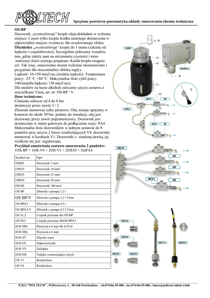 Sprężone powietrze-pneumatyka-układy smarowania-chemia techniczna OS-BP Dozownik „wystrzeliwuje” krople oleju dokładnie w wybrane miejsce. Często tylko kropla środka smarnego dostarczona w odpowiednie miejsce wystarczy dla oczekiwanego efektu. Ölschießer „wystrzeliwuje” krople do 1 metra (zależne od lepkości i częstotliwości). Szczególnie polecamy wszędzie tam, gdzie zależy nam na utrzymaniu czystości i mini-malizacji ilości użytego preparatu. Każda kropla osiągnie cel. Tak więc, smarowanie można wykonać ekonomicznie i przyjaźnie dla otoczenia(bez obłoku mgły). Lepkość: 10-150 mm2/sec.(średnia lepkość). Temperatura pracy: -25 °C +80 °C. Maksymalna ilość cykli pracy: 160/min(dla lepkości 150 mm2/sec). Dla mediów na bazie alkoholi zalecamy użycie zestawu z uszczelkami Viton, art. nr: OS-BP / V. Dane techniczne: Ciśnienie robocze od 4 do 8 bar. dostarczyć przez zawór 3 / 2 Zbiornik montować tylko pionowo. Olej zostaje sprężony w komorze do około 50 bar. podany do instalacji, olej jest dozowany przez zawór pojemnościowy. Dozownik jest dostarczany w stanie gotowym do podłączenia węży: PA4. Maksymalna ilość dozowników w jednym zestawie do 8 punktów przy użyciu 2 listew rozdzielających V4. dozowniki montować w kostkach V1. Dozowniki z ustaloną dawką, jej wielkość nie jest regulowana. Przykład zamówienia zestawu smarowania 2 punktów: 1OS-BP + 1OS-V4 + 2OS-V1 + 2OS10 + 5mPA4 Symbol art. Opis OS005 Dozownik 5 mm³ OS010 Dozownik 10 mm³ OS025 Dozownik 25 mm³ OS050 Dozownik 50 mm³ OS100 Dozownik 100 mm³ OS BP Zbiornik z pompą 1,2 l OS BP/V Zbiornik z pompą 1,2 l Viton OS BP4,5 Zbiornik z pompą 4,5 l OS BP4,5/V Zbiornik z pompą 4,5 l Viton OS S1,5 Czujnik poziomu dla OS-BP OS S4,5 Czujnik poziomu dlaOS-BP4,5 EOS SR6 Pierścień ø 6 mm für S-PA4 EOS SR4 Pierścień ø 4 mm EOS SV Złączka węża EOS ES Odpowietrznik EOS VS Zaślepka EOS EH Tulejka wzmacniająca wężyk OS V1 Rozdzielacz OS V4 Rozdzielacz P.H.U.”POLTECH” , Pl.Dworcowy 2 , 58-160 Świebodzice , tel.074/66-55-086 , fax.074/66-55-086 , biuro@poltech -smar.com