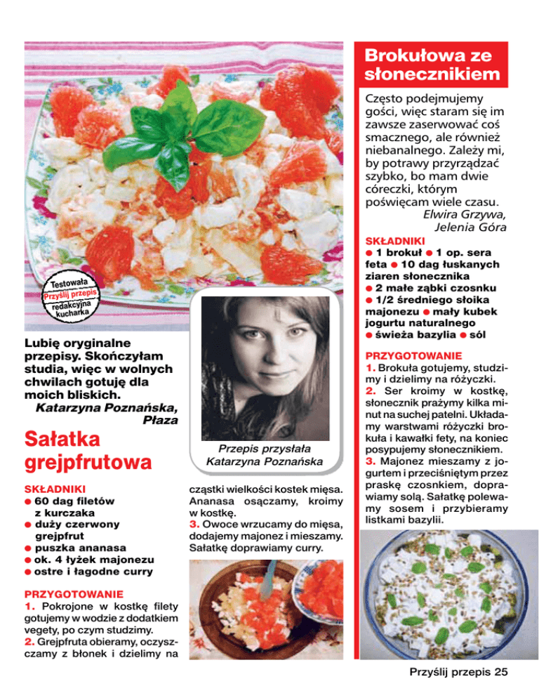 Brokułowa ze słonecznikiem Często podejmujemy gości, więc staram się im zawsze zaserwować coś smacznego, ale również niebanalnego. Zależy mi, by potrawy przyrządzać szybko, bo mam dwie córeczki, którym poświęcam wiele czasu. Elwira Grzywa, Jelenia Góra SKŁADNIKI ● 1 brokuł ● 1 op. sera feta ● 10 dag łuskanych ziaren słonecznika ● 2 małe ząbki czosnku ● 1/2 średniego słoika majonezu ● mały kubek jogurtu naturalnego ● świeża bazylia ● sól Testowała pis Przyślij prze na yj kc reda kucharka Lubię oryginalne przepisy. Skończyłam studia, więc w wolnych chwilach gotuję dla moich bliskich. Katarzyna Poznańska, Płaza Sałatka grejpfrutowa SKŁADNIKI ● 60 dag filetów z kurczaka ● duży czerwony grejpfrut ● puszka ananasa ● ok. 4 łyżek majonezu ● ostre i łagodne curry Przepis przysłała Katarzyna Poznańska cząstki wielkości kostek mięsa. Ananasa osączamy, kroimy w kostkę. 3. Owoce wrzucamy do mięsa, dodajemy majonez i mieszamy. Sałatkę doprawiamy curry. PRZYGOTOWANIE 1. Brokuła gotujemy, studzimy i dzielimy na różyczki. 2. Ser kroimy w kostkę, słonecznik prażymy kilka minut na suchej patelni. Układamy warstwami różyczki brokuła i kawałki fety, na koniec posypujemy słonecznikiem. 3. Majonez mieszamy z jogurtem i przeciśniętym przez praskę czosnkiem, doprawiamy solą. Sałatkę polewamy sosem i przybieramy listkami bazylii. PRZYGOTOWANIE 1. Pokrojone w kostkę filety gotujemy w wodzie z dodatkiem vegety, po czym studzimy. 2. Grejpfruta obieramy, oczyszczamy z błonek i dzielimy na Przyślij przepis 25