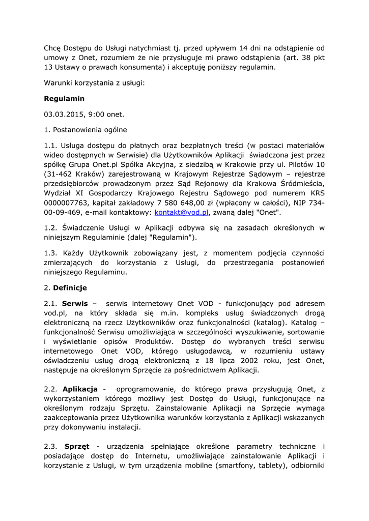 Chcę Dostępu do Usługi natychmiast tj. przed upływem 14 dni na odstąpienie od umowy z Onet, rozumiem że nie przysługuje mi prawo odstąpienia (art. 38 pkt 13 Ustawy o prawach konsumenta) i akceptuję poniższy regulamin. Warunki korzystania z usługi: Regulamin 03.03.2015, 9:00 onet. 1. Postanowienia ogólne 1.1. Usługa dostępu do płatnych oraz bezpłatnych treści (w postaci materiałów wideo dostępnych w Serwisie) dla Użytkowników Aplikacji świadczona jest przez spółkę Grupa Onet.pl Spółka Akcyjna, z siedzibą w Krakowie przy ul. Pilotów 10 (31-462 Kraków) zarejestrowaną w Krajowym Rejestrze Sądowym – rejestrze przedsiębiorców prowadzonym przez Sąd Rejonowy dla Krakowa Śródmieścia, Wydział XI Gospodarczy Krajowego Rejestru Sądowego pod numerem KRS 0000007763, kapitał zakładowy 7 580 648,00 zł (wpłacony w całości), NIP 73400-09-469, e-mail kontaktowy: [email protected], zwaną dalej "Onet". 1.2. Świadczenie Usługi w Aplikacji odbywa się na zasadach określonych w niniejszym Regulaminie (dalej "Regulamin"). 1.3. Każdy Użytkownik zobowiązany jest, z momentem podjęcia czynności zmierzających do korzystania z Usługi, do przestrzegania postanowień niniejszego Regulaminu. 2. Definicje 2.1. Serwis – serwis internetowy Onet VOD - funkcjonujący pod adresem vod.pl, na który składa się m.in. kompleks usług świadczonych drogą elektroniczną na rzecz Użytkowników oraz funkcjonalności (katalog). Katalog – funkcjonalność Serwisu umożliwiająca w szczególności wyszukiwanie, sortowanie i wyświetlanie opisów Produktów. Dostęp do wybranych treści serwisu internetowego Onet VOD, którego usługodawcą, w rozumieniu ustawy oświadczeniu usług drogą elektroniczną z 18 lipca 2002 roku, jest Onet, następuje na określonym Sprzęcie za pośrednictwem Aplikacji. 2.2. Aplikacja oprogramowanie, do którego prawa przysługują Onet, z wykorzystaniem którego możliwy jest Dostęp do Usługi, funkcjonujące na określonym rodzaju Sprzętu. Zainstalowanie Aplikacji na Sprzęcie wymaga zaakceptowania przez Użytkownika warunków korzystania z Aplikacji wskazanych przy dokonywaniu instalacji. 2.3. Sprzęt - urządzenia spełniające określone parametry techniczne i posiadające dostęp do Internetu, umożliwiające zainstalowanie Aplikacji i korzystanie z Usługi, w tym urządzenia mobilne (smartfony, tablety), odbiorniki telewizyjne Smart TV, urządzenia typu Blu-ray i kina domowe z Blu-ray. Dostęp do Usługi wymaga posiadania Sprzętu, spełniającego wymogi określone w punkcie 5.2 niniejszego Regulaminu. 2.4. Użytkownik - osoba korzystająca z Aplikacji, w tym w szczególności uzyskująca Dostęp do Usługi w Aplikacji odpłatnie bądź bez uiszczania opłaty. 2.5. Usługa – (funkcjonalność treści cyfrowych)– dostęp do płatnych i bezpłatnych treści cyfrowych w Aplikacji (katalog materiałów wideo zwanych dalej „Produktami”) świadczony na zasadach określonych w niniejszym Regulaminie. Dostęp jest możliwy tylko dla Użytkowników korzystających z Aplikacji na terytorium Polski, co jest rozumiane jako dostęp dla Użytkowników identyfikowanych polskim IP. 2.6. Produkt – treść (w formie materiału filmowego np. materiał filmowy audiowizualny) udostępniana na indywidualne żądanie Użytkownika, dostępna w ofercie Onet w ramach Usługi. Produkt jest odpowiednio opisany przy jego prezentacji w Aplikacji. 2.7. Dostęp do Usługi – dostęp do płatnych i bezpłatnych treści cyfrowych znajdujących się w Aplikacji (katalog Produktów) w zakresie ujętym w niniejszym Regulaminie. Dostęp do Usługi uzyskiwany jest przez Użytkownika za pośrednictwem Aplikacji zainstalowanej na określonym Sprzęcie. 2.7.1. Dostęp jest możliwy co do zasady tylko dla Użytkowników korzystających z Aplikacji na terytorium Polski, co jest rozumiane jako dostęp dla Użytkowników identyfikowanych polskim IP. W odniesieniu do niektórych materiałów prezentowanych w Serwisie, Onet.pl może umożliwić Dostęp dla Użytkowników identyfikowanych IP również innych niż polskie. 2.7.2. Potwierdzenie Dostępu do Usługi płatnej następuje wraz z aktywacją licencji na dany Produkt (Moje Bilety) za pomocą kodu jednorazowego przesłanego na podany adres email. O uzyskaniu Dostępu Użytkownik zostanie niezwłocznie poinformowany wraz z informacją o dokonanej transakcji poprzez pocztę elektroniczną, na adres e-mail lub kontakt Facebook podany przez Użytkownika podczas procesu uzyskiwania Dostępu. Dostęp do odpłatnej Usługi kończy się w momencie upływu czasu trwania określonej licencji. Potwierdzenie Dostępu do Usługi płatnej następuje wraz z aktywacją licencji na dany Produkt (Moje Bilety). Użytkownik jest o tym informowany w wiadomości przesłanej na podany przez niego adres email. Płatności za Dostęp do usługi płatnej można dokonać dostępnymi metodami w Serwisie lub Aplikacji. W przypadku płatności SMS, wysłanie błędnej treści na podany numer powoduje naliczenie opłaty przez operatora bez uzyskania Dostępu do Usługi. 2.7.3. Dostęp do Usługi, która nie podlega opłatom uzyskiwany jest przez Użytkownika poprzez uruchomienie Produktu w Aplikacji. 2.8. Serwis Facebook, Facebook- Serwis społecznościowy Facebook, prowadzony zgodnie z odpowiednim regulaminem, pod adresem www.facebook.com lub pod inną domeną, pod którą jest publikowany. 2.9. Aplikacja VodPL na Facebooku - aplikacja stworzona przez Onet opisana szczegółowo w Regulaminie zamieszczonym pod adresem http://fb.vod.pl/regulamin.html 2.10. Dane - wszelkie dane dostarczane do Onet przez Użytkowników w trakcie korzystania z Aplikacji bądź Usługi, w szczególności adres e-mail i inne dane przesłane do Onet lub przekazywane telefonicznie. Użytkownicy ponoszą pełną odpowiedzialność za treść przekazywanych Danych i zapewniają że przekazane Dane są zgodne ze stanem faktycznym. Dane będą przetwarzane wyłącznie w cel
