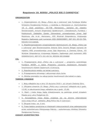Regulamin 10. BIEGU „POLICZ SIĘ Z CUKRZYCĄ” ORGANIZATOR • 1. Organizatorem 10. Biegu „Policz się z cukrzycą” jest Fundacja Wielka Orkiestra Świątecznej Pomocy. z siedzibą w Warszawie ul. Dominikańska 19 C (kod pocztowy: 02-738 Warszawa), wpisana do rejestru Stowarzyszeń, Innych Organizacji Społecznych i Zawodowych, Fundacji i Publicznych Zakładów Opieki Zdrowotnej prowadzonego przez Sąd Rejonowy dla m.st. Warszawy, XIII Wydział Gospodarczy Krajowego Rejestru Sądowego pod numerem KRS 0000030897, NIP 521-30-03-700, REGON 010168068, • 2. Współorganizatorem (organizatorem technicznym) 10. Biegu „Policz się z cukrzycą” jest Stowarzyszenie Zielona Góro Zacznij Biegać wpisana do rejestru KRS prowadzonego przez Sąd Rejonowy w Zielonej Górze, VII Wydział Gospodarczy Krajowego Rejestru Sądowego pod numerem KRS 00000503243, NIP 973-101-69-54, REGON 081200888 CEL • 1. Propagowanie akcji „Policz się z cukrzycą” – programu autorskiego Fundacji WOŚP, a także Programu Leczenia Osobistymi Pompami Insulinowymi Kobiet Ciężarnych z Cukrzycą. • 2. Popularyzacja wiedzy na temat cukrzycy. • 3. Propagowanie zdrowego i aktywnego stylu życia. • 4. Zbiórka pieniędzy na zakup pomp insulinowych dla kobiet w ciąży. TERMIN I MIEJSCE • 1. Bieg odbędzie się w dniu 10 stycznia 2016 r. po ulicach Zielonej Góry. • 2. Oficjalne otwarcie 10. Biegu „Policz się z cukrzycą” odbędzie się o godz. 13.00, a zakończenie biegu odbędzie się o godz. 15.00. • 3. Start i meta biegu będą zlokalizowane na parkingu przed Urzędem Miasta przy ulicy Podgórnej 22. • 4. Szczegółowa trasa biegu znajduje się na stronie internetowej www.wosp.info.pl zakładce „Bieg Policz Się Z Cukrzycą”. • 5. Długość trasy: ok. 5 km. • 6. Trasa będzie oznaczona w miejscach nieoczywistych oraz zabezpieczona przez wolontariuszy Pokojowego Patrolu - wolontariuszy Wielkiej Orkiestry Świątecznej Pomocy. ZASADY UCZESTNICTWA 1 • 1. W 10. Biegu „Policz się z cukrzycą” mogą wziąć udział wszyscy niezależnie od wieku. • 2. Każdy uczestnik biorący udział w 10. Biegu „Policz się z cukrzycą” musi zostać zweryfikowany w Biurze Zawodów. • 3. Warunkiem dopuszczenia zawodnika do biegu będzie własnoręczne podpisanie zaświadczenie o braku przeciwwskazań do uczestnictwa w biegu, albo zaświadczenie lekarskie o braku przeciwwskazań do uczestnictwa w biegu. Jedno ze wskazanych w zdaniu poprzedzającym zaświadczeń powinno zostać złożone przy okazji odbioru przez uczestnika pakietu startowego w miejscu i w terminach określonych w pkt VI. Wzór zaświadczenia o braku przeciwwskazań do uczestnictwa w biegu jest do pobrania na stronie internetowej www.wosp.info.pl. W przypadku osób niepełnoletnich zaświadczenie, które nie jest zaświadczeniem lekarskim powinno być podpisane także rodzica lub opiekuna prawnego uczestnika. • 4. Wszyscy uczestnicy 10. Biegu „Policz się z cukrzycą” są zobowiązani do stosowania się do poleceń osób odpowiedzialnych za bezpieczeństwo, służb porządkowych oraz obsługi z ramienia Organizatora. • 5. Decyzje obsługi medycznej co do kontynuowania biegu są ostateczne i niezmienne. ZGŁOSZENIA I OPŁATA STARTOWA • 1. Zgłoszenia do 10. Biegu „Policz się z cukrzycą” będą przyjmowane poprzez formularz zgłoszeniowy dostępny na stronie internetowej www.pulsarsport.pl. • 2. Zgłoszenia on-line będą przyjmowane do dnia 5 stycznia 2016 r. • 3. Za zgłoszenie uważa się łączne dopełnienie wszystkich poniższych czynności: • - prawidłowe wypełnione formularza zgłoszeniowego na stronie internetowej www.pulsarsport.pl • - dokonanie opłaty startowej, z zastrzeżeniem pkt V.9 poniżej, • - złożenie podpisanego oświadczenia o braku przeciwwskazań do uczestnictwa w biegu lub analogicznego zaświadczenia lekarskiego w Biurze Zawodów zgodnie z procedurą opisaną w pkt IV.3. • 4. W przypadku braku dokonania opłaty startowej w terminie do dnia 7 stycznia 2016 r. warunkiem prawidłowego zgłoszenia jest okazanie dowodu wpłaty przy okazji odbioru pakietu startowego w Biurze Zawodów w miejscu i w terminach określonych w pkt VI. • 5. Limit uczestników w 10. Biegu „Policz się z cukrzycą” wynosi 300 osób. 2 Organizator zastrzega sobie prawo wcześniejszego zamknięcia zapisów w przypadku wypełnienia się limitu zgłoszeń. • 6. Opłata startowa za udział w Biegu WOŚP – Policz się z cukrzycą wynosi minimum 15 PLN i jest w całości przeznaczona na zakup pomp insulinowych dla kobiet w ciąży. • 7. Opłatę należ uiścić na konto: • Stowarzyszenie Zielona Góro Zacznij Biegać ul. Armii Ludowej 4 65-245 Zielona Góra 53 1090 1535 0000 0001 3136 2101 Tytuł przelewu: Opłata startowa Bieg WOŚP ….. (w miejsce kropek wpisać imię i nazwisko oraz rok urodzenia zawodnika). • 8. Każdy uczestnik jest zobowiązany do wniesienia opłaty startowej w ciągu 2 dni od momentu dokonania zgłoszenia. W przeciwnym wypadku jego zgłoszenie zostanie anulowane. • 9. Organizatorzy biegu nie wystawiają faktur VAT. • 10. Dowodem dotarcia opłaty startowej jest pojawienie się potwierdzenia wpłaty przy nazwisku zawodnika na liście startowej. • 11. Istnieje możliwość wniesienia opłaty startowej za większą liczbę Uczestników na jednym blankiecie wpłaty (jednym przelewie). W takim wypadku w tytule przelewu należy wpisać „Opłata grupowa” oraz imiona i nazwiska uczestników, za których wnoszona jest opłata startowa. • 12. Opłata raz uiszczona nie podlega zwrotowi. Nie ma możliwości przeniesienia raz wniesionej opłaty na innego uczestnika. • 13. W ramach opłaty startowej każdy uczestnik biegu otrzymuje: • - numer startowy wraz z czterema agrafkami, • - pamiątkową koszulkę 10. Biegu „Policz się z cukrzycą” • 14. Przedmioty określone w pkt V.13.1) i 2) składają się na pakiet startowy, którego posiadanie jest warunkiem u