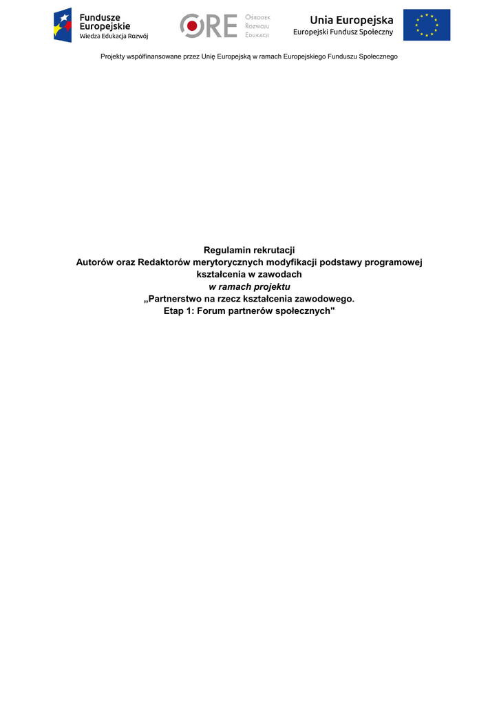 Projekty współfinansowane przez Unię Europejską w ramach Europejskiego Funduszu Społecznego Regulamin rekrutacji Autorów oraz Redaktorów merytorycznych modyfikacji podstawy programowej kształcenia w zawodach w ramach projektu „Partnerstwo na rzecz kształcenia zawodowego. Etap 1: Forum partnerów społecznych" Projekty współfinansowane przez Unię Europejską w ramach Europejskiego Funduszu Społecznego Postanowienia ogólne §1 Użyte w Regulaminie określenia i skróty oznaczają: 1. Autor modyfikacji Podstawy Programowej Kształcenia w Zawodach – przedstawiciel pracodawców (osoba z rynku pracy wykonująca zadania zawodowe na stanowisku pracy w zawodzie i posiada kwalifikacje zawodowe adekwatne do zawodu, w którym aplikuje na autora modyfikacji PPKZ) lub nauczyciel przedmiotów zawodowych w danej grupie zawodowej lub osoba wykonująca zawody przypisane do danej grupy zawodowej, który opracuje modyfikację Podstawy Programowej Kształcenia w Zawodach. 2. Beneficjent projektu – Ośrodek Rozwoju Edukacji (ORE) z siedzibą w Warszawie (00-478) przy Al. Ujazdowskich 28. 3. Formularz zgłoszeniowy – formularz wypełniany przez Kandydata w procesie rekrutacyjnym, w którym wskazuje on podstawowe informacje, spełnienie kryteriów obowiązkowych, posiadane doświadczenie oraz kompetencje, a także szacowany koszt brutto wykonania zamówienia. Na podstawie Formularza zgłoszeniowego Komisja rekrutacyjna dokona oceny zgłoszeń (ofert). 4. Grupa zawodów – grupa, w skład której wchodzą zawody z Klasyfikacji zawodów szkolnictwa zawodowego o wspólnych i/lub zbliżonych kwalifikacjach i/lub umiejętnościach (podział klasyfikacji zawodów szkolnictwa zawodowego na grupy zawodowe stanowi załącznik nr 1 do niniejszego Regulaminu). 5. Kandydat – osoba biorąca udział w Rekrutacji na autora modyfikacji podstawy programowej kształcenia w zawodach i redaktora merytorycznego modyfikacji podstawy programowej kształcenia w zawodach . 6. Komisja Rekrutacyjna – komisja powołana na podstawie decyzji Dyrektora Beneficjenta projektu, w skład której wchodzą pracownicy, którzy dokonają oceny zgłoszeń Kandydatów, na podstawie przesłanych Formularzy zgłoszeniowych, zgodnie z Regulaminem pracy Komisji Rekrutacyjnej. 7. Maksymalny Limit Kosztów – maksymalna wysokość kosztów, które Beneficjent Projektu może przeznaczyć na sfinansowanie poszczególnych działań, wynikająca z wniosku o dofinansowanie Projektu. 8. Podstawa Programowa Kształcenia w Zawodach (PPKZ) – obowiązkowe zestawy celów kształcenia i treści nauczania opisanych w formie oczekiwanych efektów Projekty współfinansowane przez Unię Europejską w ramach Europejskiego Funduszu Społecznego kształcenia: wiedzy, umiejętności zawodowych oraz kompetencji personalnych i społecznych, niezbędnych dla zawodów lub kwalifikacji wyodrębnionych w zawodach, uwzględniane w programach nauczania i umożliwiające ustalenie kryteriów ocen szkolnych i wymagań egzaminacyjnych oraz warunki realizacji kształcenia w zawodach, w tym zalecane wyposażenie w pomoce dydaktyczne i sprzęt oraz minimalna liczba godzin kształcenia zawodowego1. 9. Projekt – projekt pozakonkursowy, koncepcyjny pt.: „Partnerstwo na rzecz kształcenia zawodowego. Etap 1: Forum partnerów społecznych", realizowany w ramach Programu Operacyjnego Wiedza Edukacja Rozwój, Osi priorytetowej II Efektywne polityki publiczne dla rynku pracy, gospodarki edukacji, Działania 2.15 Kształcenie i szkolenie zawodowe dostosowane do potrzeb zmieniającej się gospodarki, Podzadania 2.15.1 Dostosowanie kształcenia i szkolenia zawodowego do potrzeb rynku pracy poprzez zaangażowanie przedstawicieli pracodawców i pracowników na wszystkich etapach jego programowania, przez Ośrodek Rozwoju Edukacji. 10. Redaktor merytoryczny modyfikacji Podstawy Programowej Kształcenia w Zawodach -– Autor modyfikacji Podstawy Programowej Kształcenia w Zawodach, który dokona redakcji wersji ostatecznej zmodyfikowanej modyfikacji Podstawy Programowej Kształcenia w Zawodach. 11. Rekrutacja – nabór Kandydatów na autorów modyfikacji Podstawy Programowej Kształcenia w Zawodach oraz Redaktorów merytorycznych modyfikacji Podstawy Programowej Kształcenia w Zawodach w ramach projektu pt. „Partnerstwo na rzecz kształcenia zawodowego. Etap 1: Forum partnerów społecznych". 12. Regulamin – Regulamin rekrutacji Kandydatów w ramach projektu pt. „Partnerstwo na rzecz kształcenia zawodowego. Etap 1: Forum partnerów społecznych". §2 1. Regulamin określa zasady i warunki uczestnictwa w rekrutacji Kandydatów na Autorów merytorycznych modyfikacji PPKZ oraz Redaktorów merytorycznych modyfikacji PPKZ do prac związanych z modyfikacją PPKZ w celu jej dostosowania do potrzeb rynku pracy, w ramach Projektu pozakonkursowego koncepcyjnego pt.: „Partnerstwo na rzecz kształcenia zawodowego. Etap 1: Forum partnerów społecznych". 1 Rozporządzenie Ministra Edukacji narodowej z dnia 7 lutego 2012 r. w sprawie podstawy programowej kształcenia w zawodach (Dz. U. 2012 r. poz. 184 Projekty współfinansowane przez Unię Europejską w ramach Europejskiego Funduszu Społecznego 2. Projekt realizowany jest przez Ośrodek Rozwoju Edukacji z siedzibą w Warszawie. 3. O zakwalifikowaniu Kandydata na Autora oraz Redaktora Merytorycznego decyduje Komisja Rekrutacyjna na podstawie oceny kryteriów wskazanych w § 4 Regulaminu oraz w Formularzu zgłoszeniowym. 4. Projekt jest współfinansowany ze środków Unii Europejskiej w ramach Europejskiego Funduszu Społecznego. §3 1. Celem Projektu jest przegląd i aktualizacja, we współpracy z Partnerami Społecznymi, klasyfikacji zawodów szkolnictwa zawodowego, podstaw programowych kształcenia w zawodach oraz dostosowanie tych dokumentów do potrzeb rynku pracy w ramach ścisłej współpracy z Przedstawicielami Partnerów Społecznych, jak również przygotowanie suplementów do dyplomów i kwalifikacji do zmoder