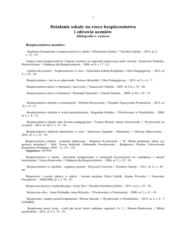 1 Działanie szkoły na rzecz bezpieczeństwa i zdrowia uczniów bibliografia w wyborze Bezpieczeństwo uczniów: Akademia Zarządzania o bezpieczeństwie w szkole / Włodzimierz Kaleta. // Dyrektor Szkoły. - 2013, nr 3, s. 12 - 14. Analiza stanu bezpieczeństwa i higieny uczniów na zajęciach praktycznej nauki zawodu / Katarzyna Dulińska, Marcin Krause. // Edukacja dla Bezpieczeństwa. - 2006, nr 4, s. 17 - 21. Ankieta dla uczniów : bezpieczeństwo w sieci / Aleksandra Kubala-Kulpińska // Głos Pedagogiczny. - 2012, nr 5, s. 25 - 28. Bezpieczeństwo - kto za co odpowiada / Dariusz Skrzyński // Głos Pedagogiczny. - 2012, nr 5, s. 4 - 7. .Bezpieczeństwo dzieci w Internecie / Jan Łysek. // Nauczyciel i Szkoła. - 2007, nr 3/4, s. 33 - 46. Bezpieczeństwo dzieci w Internecie / Romuald Tejszerski. // Gazeta Szkolna. - 2009, nr 42, s 10 - 11. Bezpieczeństwo dziecka w przedszkolu / Elżbieta Korczewska // Doradca Nauczyciela Przedszkola. - 2013, nr 18, s. 6 - 11. Bezpieczeństwo dziecka w wieku przedszkolnym / Bogumiła Osińska. // Wychowanie w Przedszkolu. - 2009, nr 3, s. 9 - 12. Bezpieczeństwo lokalne jako kwestia pedagogiczna / Tomasz Biernat, Janusz Gierszewski. // Wychowanie na co dzień. - 2012, nr 10/11, s. 15 - 20. Bezpieczeństwo młodych internautów w sieci / Katarzyna Zygmunt - Hernandez. // Oświata Mazowiecka. 2012, nr 1, s. 22 - 24. Bezpieczeństwo szkolne - kontekst edukacyjny / Zbigniew Kwiasowski. // W: Młode pokolenie: ofiary czy sprawcy przemocy? / Red. Teresa Sołtysiak, Aleksandra Nowakowska. - Bydgoszcz: Wydaw. Uniwersytetu Kazimierza Wielkiego, 2010. - S. 133 - 132 Sygnatura: 103 939 Bezpieczeństwo w szkole - procedury postępowania w sytuacjach kryzysowych we współpracy z innymi instytucjami / Teresa Kaniowska. // Edukacja dla Bezpieczeństwa. - 2006, nr 3, s. 25 - 34. Bezpieczeństwo w szkołach - regulacje prawne / Krzysztof Lisowski // Dyrektor Szkoły. - 2011, nr 11, s. 56 60. Bezpieczne i wesołe zabawy w szkole - metoda projektu/ Edyta Cudzik, Jolanta Wysocka. // Nauczanie Początkowe. - 2008/2009, nr 1, s. 74 - 87. Bezpieczne przerwy międzylekcyjne / Jacek Stec // Doradca Dyrektora Szkoły. - 2011, nr 4, s. 55 - 56. Bezpieczne ulice / Anna Podsiadła, Anna Różycka. // Wychowanie w Przedszkolu. - 2008, nr 2, s. 41 - 43. Bezpiecznie i mądrze przed komputerem / Dorota Janczak. // Wychowanie w Przedszkolu. - 2013, nr 3, s. 6 - 7 [wkładka]. Bezpiecznie przez życie - czyli jak uczyć dzieci unikania zagrożeń. Cz. 2 / Bożena Rutkowska. // Bliżej przedszkola. - 2011, nr 3, s. 72 - 76. Bezpiecznie w przedszkolu / Helena Prus s. 27 - 31. 2 - Wisniewska. // Wychowanie w Przedszkolu. - 2008, nr 4, Bezpiecznie za progiem domu i przedszkola / Helena Prus-Wiśniewska. // Wychowanie w Przedszkolu. - 2008, nr 5, s. 32 - 37. Ciemna strona sieci / Mira Prajsner. // Remedium. - 2012, nr 9, [wkładka]. [cyberseks] Co zagraża najmłodszym? / Karolina Kossakowska. // Wychowanie w Przedszkolu. - 2012, nr 6, s. 42 - 45. Czas wolny a bezpieczeństwo dziecka / Joanna Karczewska. // Nauczanie Początkowe. - 2008/2009, nr 1, s. 7 14 Czy internet jest bezpieczny dla dziecka? / Agata Grabowska. // Problemy Opiekuńczo-Wychowawcze. - 2010, nr 1, s. 38 - 43. Czynniki zagrażające bezpieczeństwu ucznia w środowisku szkolnym i domowym w opiniach przedstawicieli profesji społecznych / Ryszarda Czerniachowska, Hanna Kubicka. // W: Uczeń wobec szans i zagrożeń edukacyjnych XXI wieku / Pod red. Haliny Gajdamowicz. - Łódź: Wydaw. Uniwersytetu Łodzkiego, 2010. - S. 203 - 210 Sygnatura: 104 941 Dziecięcy uniwersytet bezpieczeństwa. Scenariusz zajęć dla klasy II szkoły podstawowej / Małgorzata Pawełczyk. // Wychowawca. - 2008, nr 7/8, s. 24 - 25. Dziecko w niebezpieczeństwie / Marcin Florkowski. // Wszystko dla Szkoły. - 2010, nr 1, s. 18. E-learning w doradztwie i komplementarnym nauczaniu pierwszej pomocy i edukacji dla bezpieczeństwa / Marian Stebelski // Gazeta Szkolna. - 2010, nr 11/12, s. 18 - 19 Edukacja dla bezpiecznego życia i rozwoju dziecka w warunkach współczesnej cywilizacji / Bogumiła Osińska Bogacka. // Wychowanie na co dzień. - 2011, nr 9, s. I - XI [wkładka]. Grooming - uwodzenie dzieci w Internecie / Radosław Mysior. // Remedium. - 2012, nr 9, s. 4 - 5. Jak przygotować kompleksowy plan awaryjny? / Renata Davidson. // W: Sytuacje kryzysowe w szkole / Red. Katarzyna Koszkiewicz, Małgorzata Taraszkiewicz. - Warszawa: CODN, 2007. - S. 87 - 115 Sygnatura: 97 000-1P Jak skutecznie dbać o bezpieczeństo uczniów? Propozycja działąń podejmowanych w SP 2 we Wrocławiu / Beata Bryś. // Dyrektor Szkoły. - 2008, nr 4, s. 17 - 19. Jestem bezpieczny w sieci / Marzena Oterman. // Życie Szkoły. - 2011, nr 7, s. 39 - 42. Lista kontrolna zadań w zakresie bezpieczeństwa w szkole / Jacek Stec // Głos Pedagogiczny. - 2012, nr 10, s. 30 - 33. Mały ratownik : edukacja dla bezpieczeństwa, elementy ratownictwa i obrony cywilnej w blokach i ścieżkach edukacyjnych: podręcznik dla klas 4 - 6 szkoły podstawowej / Tadeusz Siuda, Marian Steberski, Krzysztof M. Zaczek Zaczyński.- Warszawa: Dom Wydawniczy ELIPSA, 2000 Sygnatura: 86 181 Nastolatki a seks w sieci / Kinga Kaczmarek, Karolina Van Laere. // Remedium. - 2012, nr 9, [wkładka]. Nie igraj z ogniem! Potrafię zachować się w razie pożaru i udzielić pomocy przy oparzeniu / Małgorzata Borek Aleksandrowicz. // Lider. - 2008, nr 5, s. 23 - 26. Niebezpieczna szkoła, czyli strach się bać... / Maciej Osuch // Dyrektor Szkoły. - 2011, nr 9, s. 34 -41. 3 O nowych obszarach działań nauczycieli - zapobieganie zagrożeniom dzieci stwarzanym przez rodziców / Ewa Jarosz. // W: Współprzestrzenie edukacji. Szkoła - rodzina - społeczeństwo - kultura / Pod red. Mirosławy Nyczaj-Drąg i Michała Głażewskiego. - Kraków: Oficyna Wydaw. "Impuls", 2005. - S. 111 - 128 Sygnatura: 95 219 "O swe bezpieczeństwo dbam..." - scenariusze zajęć/ Krystyna Kolowca. // Nauczanie Początkowe. 2008/