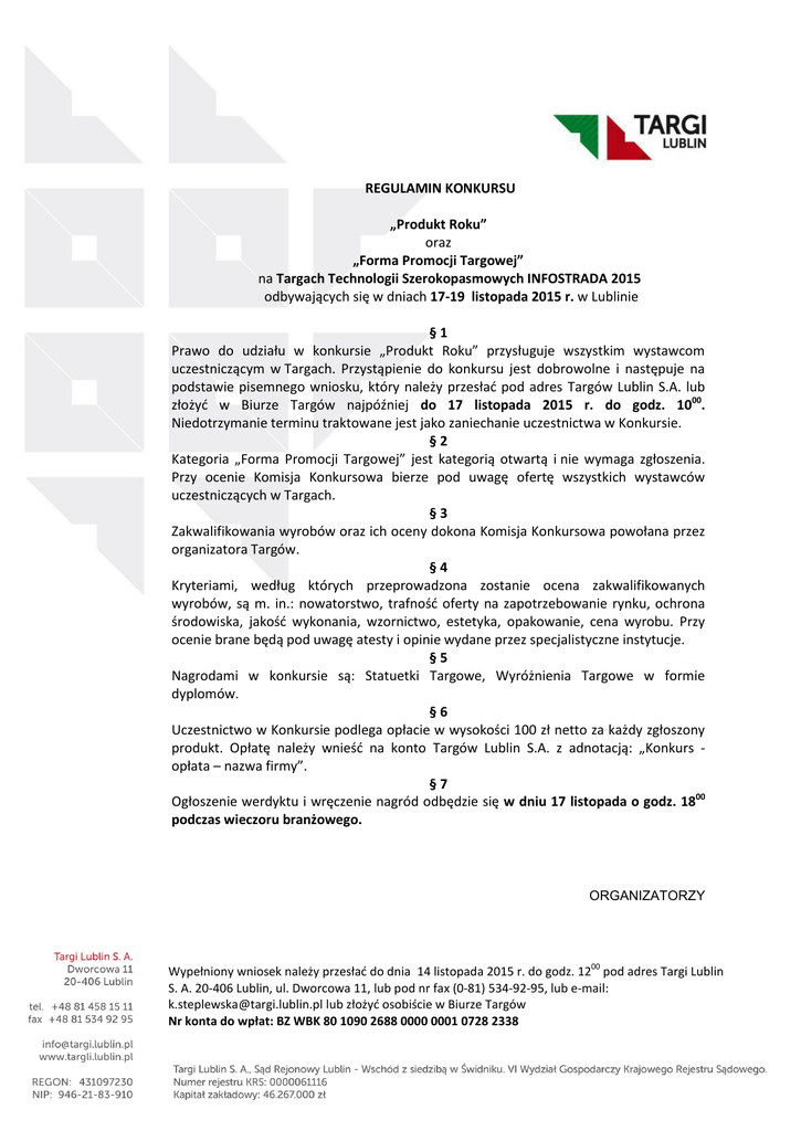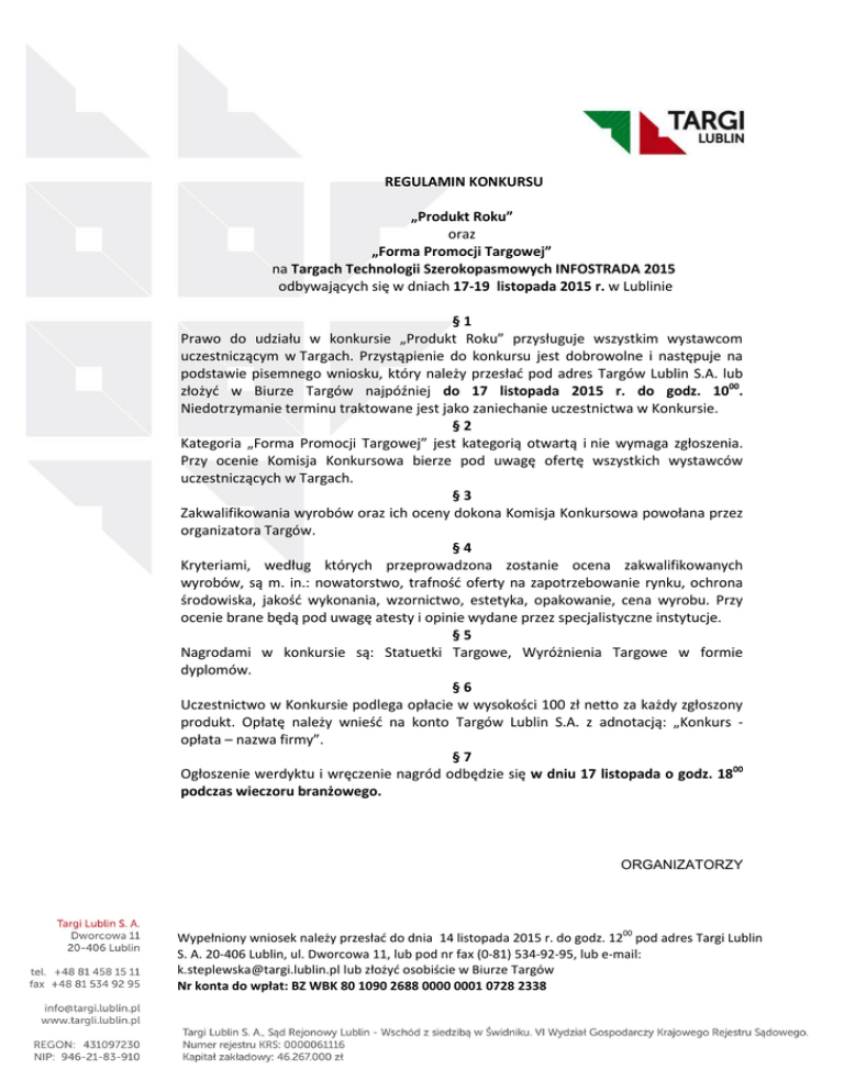 REGULAMIN KONKURSU „Produkt Roku” oraz „Forma Promocji Targowej” na Targach Technologii Szerokopasmowych INFOSTRADA 2015 odbywających się w dniach 17-19 listopada 2015 r. w Lublinie §1 Prawo do udziału w konkursie „Produkt Roku” przysługuje wszystkim wystawcom uczestniczącym w Targach. Przystąpienie do konkursu jest dobrowolne i następuje na podstawie pisemnego wniosku, który należy przesłać pod adres Targów Lublin S.A. lub złożyć w Biurze Targów najpóźniej do 17 listopada 2015 r. do godz. 1000. Niedotrzymanie terminu traktowane jest jako zaniechanie uczestnictwa w Konkursie. §2 Kategoria „Forma Promocji Targowej” jest kategorią otwartą i nie wymaga zgłoszenia. Przy ocenie Komisja Konkursowa bierze pod uwagę ofertę wszystkich wystawców uczestniczących w Targach. §3 Zakwalifikowania wyrobów oraz ich oceny dokona Komisja Konkursowa powołana przez organizatora Targów. §4 Kryteriami, według których przeprowadzona zostanie ocena zakwalifikowanych wyrobów, są m. in.: nowatorstwo, trafność oferty na zapotrzebowanie rynku, ochrona środowiska, jakość wykonania, wzornictwo, estetyka, opakowanie, cena wyrobu. Przy ocenie brane będą pod uwagę atesty i opinie wydane przez specjalistyczne instytucje. §5 Nagrodami w konkursie są: Statuetki Targowe, Wyróżnienia Targowe w formie dyplomów. §6 Uczestnictwo w Konkursie podlega opłacie w wysokości 100 zł netto za każdy zgłoszony produkt. Opłatę należy wnieść na konto Targów Lublin S.A. z adnotacją: „Konkurs opłata – nazwa firmy”. §7 Ogłoszenie werdyktu i wręczenie nagród odbędzie się w dniu 17 listopada o godz. 1800 podczas wieczoru branżowego. ORGANIZATORZY ypełniony wniosek należy przesłać do dnia ....................... r. do godz. ............... 00 Wypełniony wniosek należy przesłać do dnia 14 listopada 2015 r. do godz. 12 pod adres Targi Lublin adres:Lublin, ul. Dworcowa 11, lub pod nr fax (0-81) 534-92-95, lub e-mail: S.pod A. 20-406 Targi Lublin S. A. 20-406 ul. Dworcowa 11, [email protected] lub Lublin, złożyć osobiście w Biurze Targów lubkonta poddo nrwpłat: fax (0-81) 534-92-95, lub0000 e-mail: Nr BZ WBK 80 1090 2688 0001 0728 2338 [email protected] lub złożyć osobiście w Biurze Targów Nr konta do wpłat: BZ WBK 80 1090 2688 0000 0001 0728 2338 ZGŁOSZENIE do oceny w Konkursie „Produkt Roku” na Targach Technologii Szerokopasmowych INFOSTRADA 2015 odbywających się w dniach 17-19 listopada 2015 r. w Lublinie Nazwa Firmy: ……………………………………………………………………………………... ……………………………………………………………………………………........................... Adres: ……………………………………………………………………………………............... Nazwisko Przedstawiciela: …………………………………………………………………….. NAZWA WYROBU …………………………………………………… SYMBOL …………………. PRODUCENT …………………………………. Krótka charakterystyka: ……………………………………………………………………………………………………… ……………………………………………………………………………………………………… Uzasadnienie wniosku: ……………………………………………………………………………………………………… ……………………………………………………………………………………………………… ……………………………………………………………………………………………………… ……………………………………………………………………………………………………… Załączniki: ……………………………………………………………………………………………………… ……………………………………………………………………………………………………… ……………………………………………………………………………………………………… Oświadczam, że: 1. Jestem Przedstawicielem firmy uprawnionym do zaciągania zobowiązań. 2. Mam świadomość konieczności uiszczenia opłaty w wysokości 100 zł netto za każdy produkt zgłoszony w Konkursie Targowym w kategorii „Produkt Roku”. Data i podpis ypełniony wniosek należy przesłać do dnia ....................... r. do godz. ............... 00 Wypełniony wniosek należy przesłać do dnia 14 listopada 2015 r. do godz. 12 pod adres Targi Lublin adres:Lublin, ul. Dworcowa 11, lub pod nr fax (0-81) 534-92-95, lub e-mail: S.pod A. 20-406 Targi Lublin S. A. 20-406 ul. Dworcowa 11, [email protected] lub Lublin, złożyć osobiście w Biurze Targów lubkonta poddo nrwpłat: fax (0-81) 534-92-95, lub0000 e-mail: Nr BZ WBK 80 1090 2688 0001 0728 2338 [email protected] lub złożyć osobiście w Biurze Targów Nr konta do wpłat: BZ WBK 80 1090 2688 0000 0001 0728 2338 Formularz ZK ZGŁOSZENIE DO KONKURSU TARGOWEGO Nr Pełna nazwa firmy Wystawcy (do faktury VAT): Ulica: Kod: Miejscowość: Województwo: Nazwa i nr dokumentu potwierdzającego prowadzenie działalności gospodarczej: Upoważniamy Organizatora do wystawienia faktury VAT bez podpisu odbiorcy NIP: Nazwisko przedstawiciela, tel. kontaktowy, e-mail: ZGŁASZAMY NASTĘPUJĄCY/-E PRODUKT/-Y (koszt bez VAT) NAZWA PRODUKTU/-ÓW CENA (netto): WARTOŚĆ: 100,00 zł 100,00 zł 100,00 zł 100,00 zł 100,00 zł Razem netto: Razem brutto (+23% VAT): Miejscowość i data: Podpis firmy Wystawcy i podpis prawnie wiążący: ypełniony wniosek należy przesłać do dnia ....................... r. do godz. ............... 00 Wypełniony wniosek należy przesłać do dnia 14 listopada 2015 r. do godz. 12 pod adres Targi Lublin adres:Lublin, ul. Dworcowa 11, lub pod 
