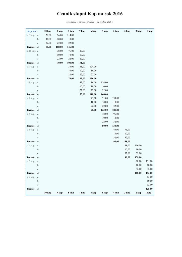 Cennik stopni Kup na rok 2016 obowiązuje w okresie 1 stycznia — 31 grudnia 2016 r. zdaje na: z 0 kup łącznie 10 kup 9 kup 8 kup a 38,00 76,00 114,00 b 10,00 10,00 10,00 c 22,00 22,00 22,00 d 70,00 7 kup 6 kup 5 kup 4 kup 3 kup 2 kup 1 kup 108,00 146,00 z 10 kup a 38,00 76,00 119,00 b 10,00 10,00 10,00 c 22,00 22,00 22,00 łącznie d 70,00 108,00 151,00 z 9 kup a 38,00 81,00 124,00 b 10,00 10,00 10,00 c 22,00 22,00 22,00 łącznie d 70,00 113,00 156,00 z 8 kup a 43,00 86,00 134,00 b 10,00 10,00 10,00 c 22,00 22,00 22,00 łącznie d 75,00 118,00 166,00 z 7 kup a 43,00 91,00 139,00 b 10,00 10,00 10,00 c 22,00 22,00 32,00 łącznie d 75,00 123,00 181,00 z 6 kup a 48,00 96,00 b 10,00 10,00 c 22,00 32,00 łącznie d 80,00 138,00 z 5 kup a 48,00 96,00 b 10,00 10,00 c 32,00 32,00 łącznie d 90,00 138,00 z 4 kup a 48,00 116,00 b 10,00 10,00 c 32,00 32,00 łącznie d 90,00 158,00 z 3 kup a 68,00 151,00 b 10,00 10,00 c 32,00 32,00 łącznie d 110,00 193,00 z 2 kup a 83,00 b 10,00 łącznie c 32,00 d 125,00 10 kup 9 kup 8 kup 7 kup 6 kup 5 kup 4 kup 3 kup 2 kup 1 kup
